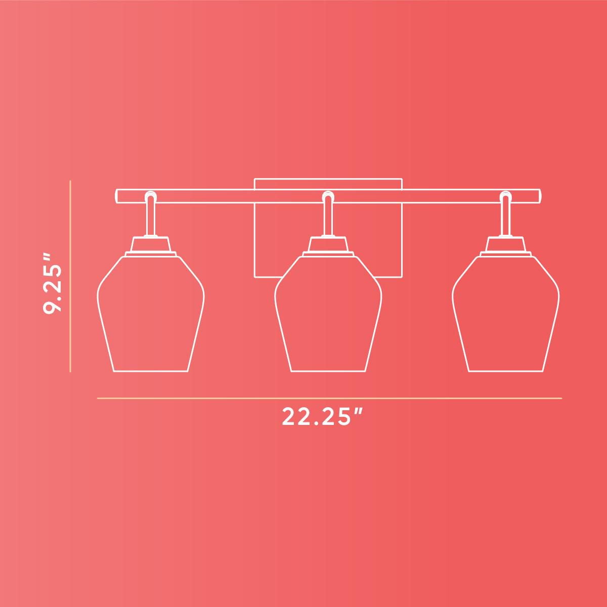 Casual modern farmhouse bathroom vanity light with an elegant frame in stunning golden champagne bronze. Ideal for enhancing bathrooms and powder rooms. Measures: 22.25 in wide, 9.25 in height and extends 7 in Requires three medium base bulbs, 60W (not included) This fixture offers dimmable functionality with the use of a compatible dimmer switch (not included) and dimmable bulbs (not included). cULus Damp Location listed, allowing the fixture’s safe use in spaces like bathrooms or powder rooms, where moisture may be present. Our 1-Year Limited Warranty ensures your absolute satisfaction with your purchase and comes with dedicated professional after-sales customer service support.