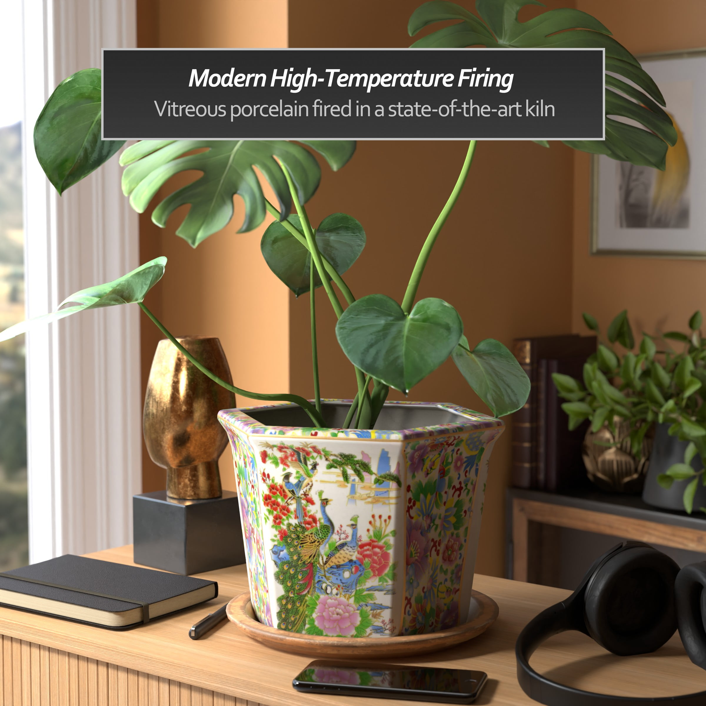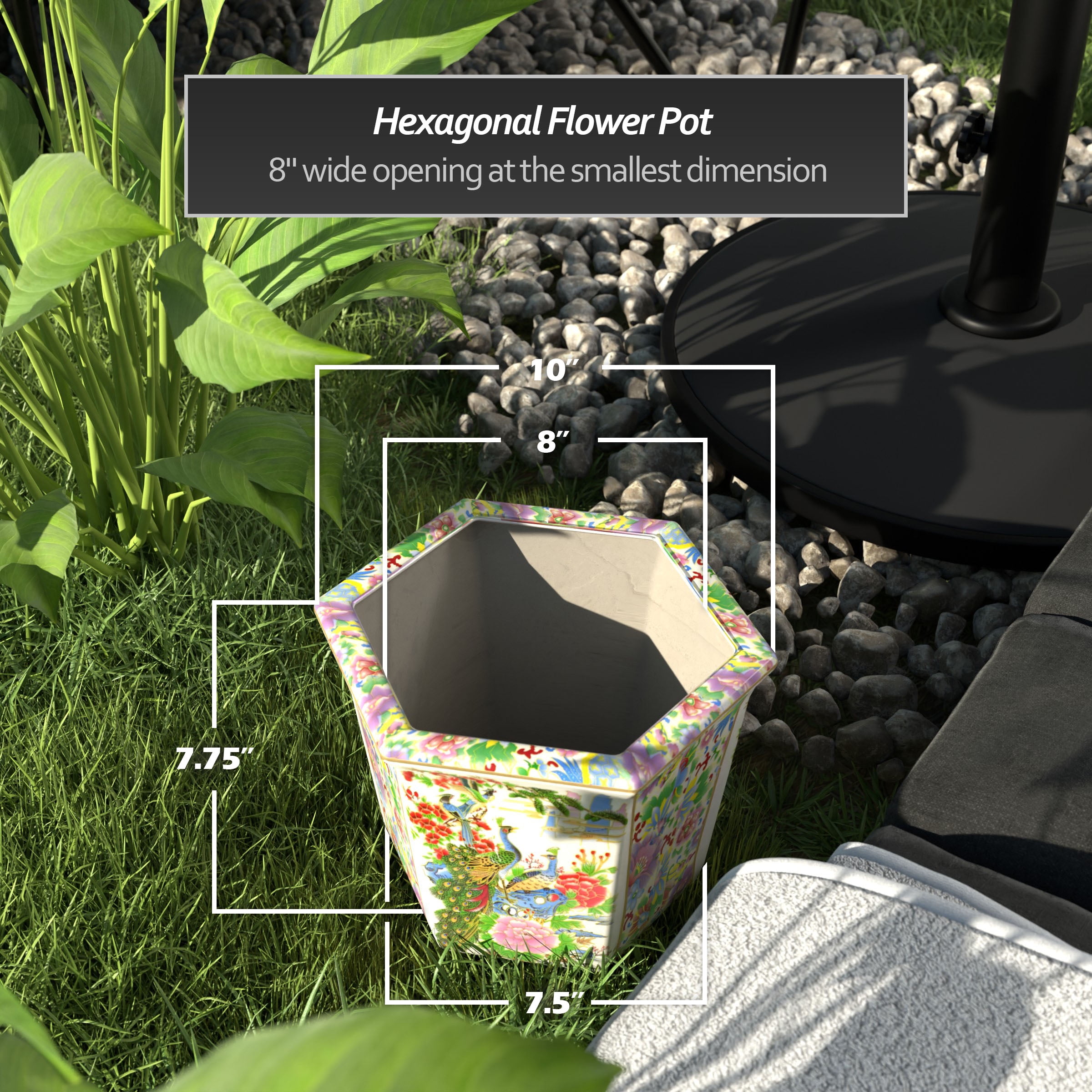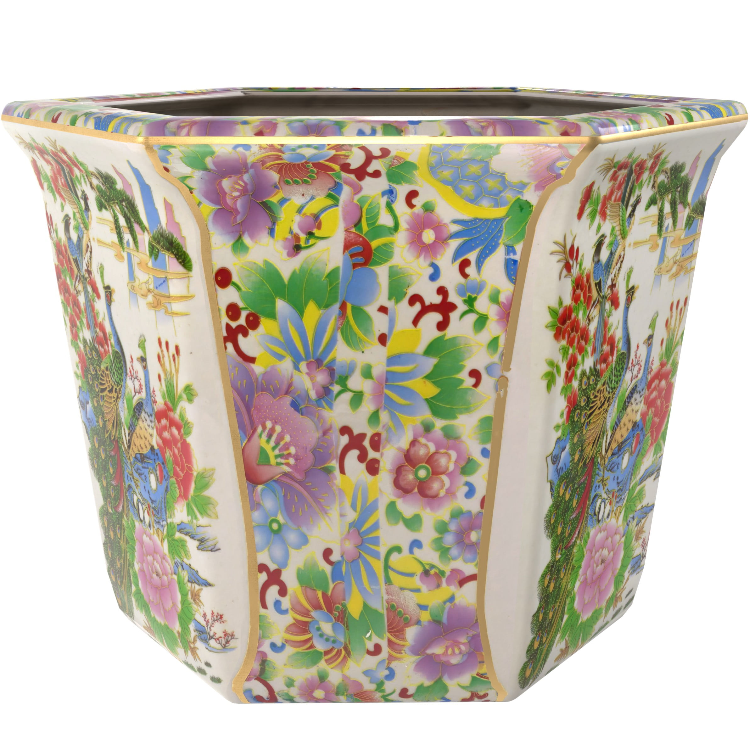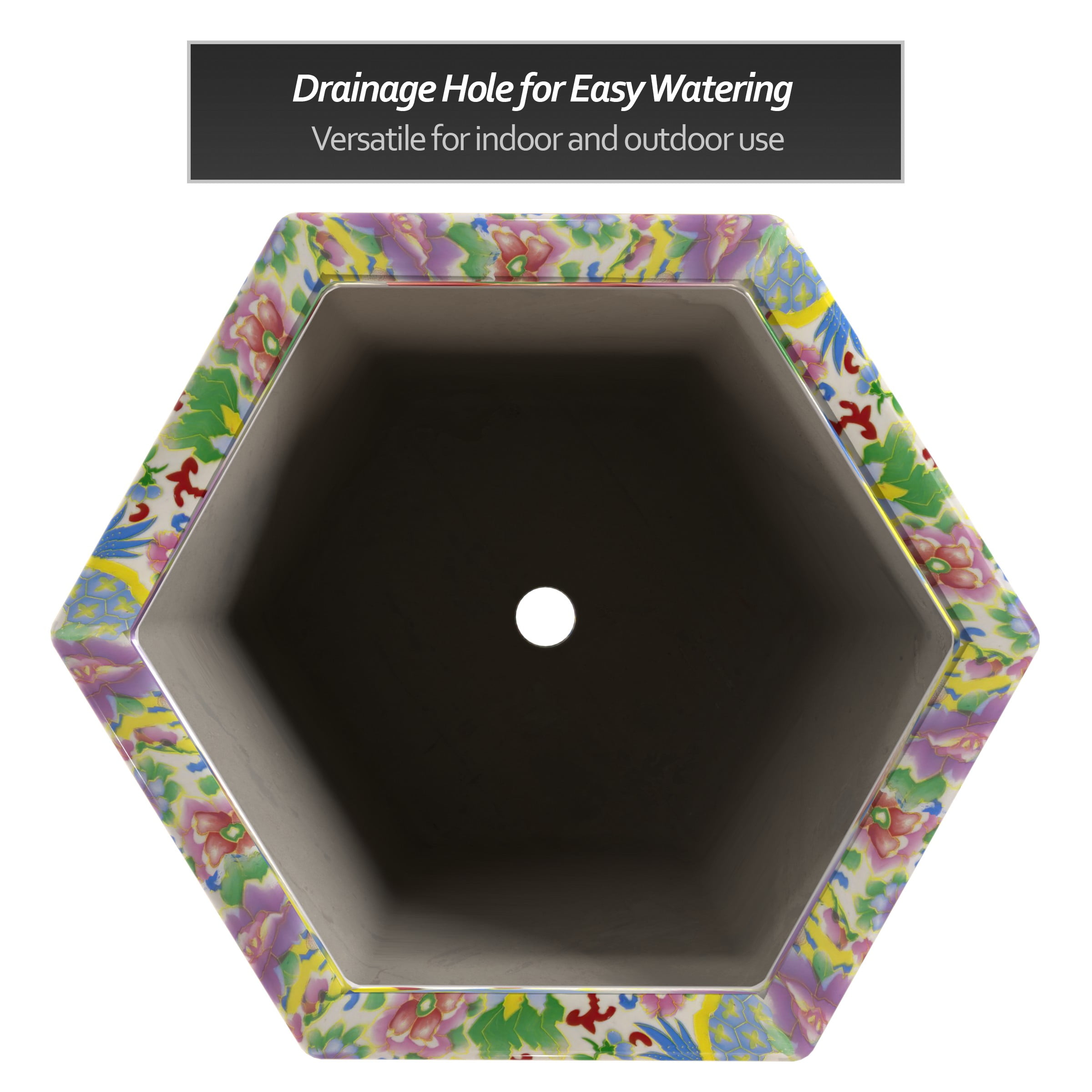 New Era 9″ x 10″ x 75″ Round Multicolor Porcelain Satsuma Plant Pot with Drainage Hole Features a vibrant Rose Medallion Oriental art motif Crafted from high-quality Chinese porcelain ceramic Unique hexagonal design adds a decorative touch Finished with a medium gloss crackle glaze for an elegant look Includes a drainage hole in the base for easy watering Stand is not included