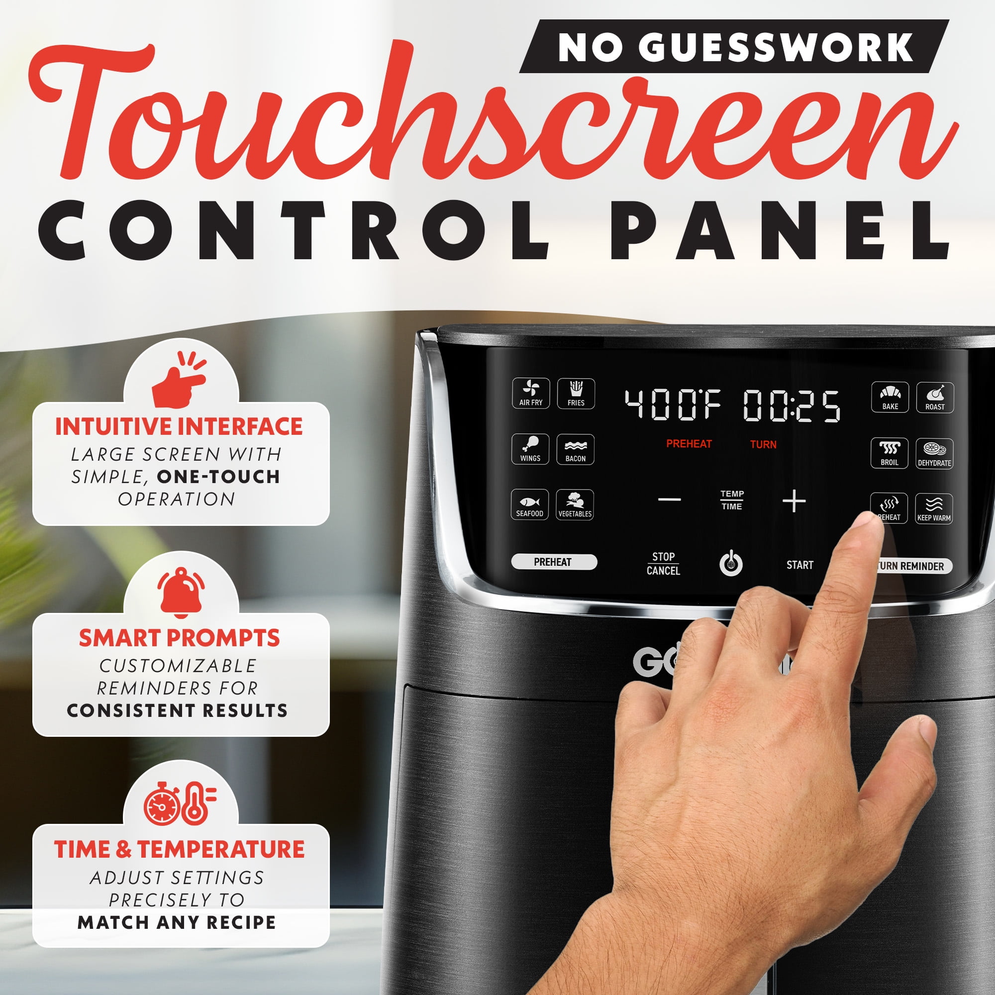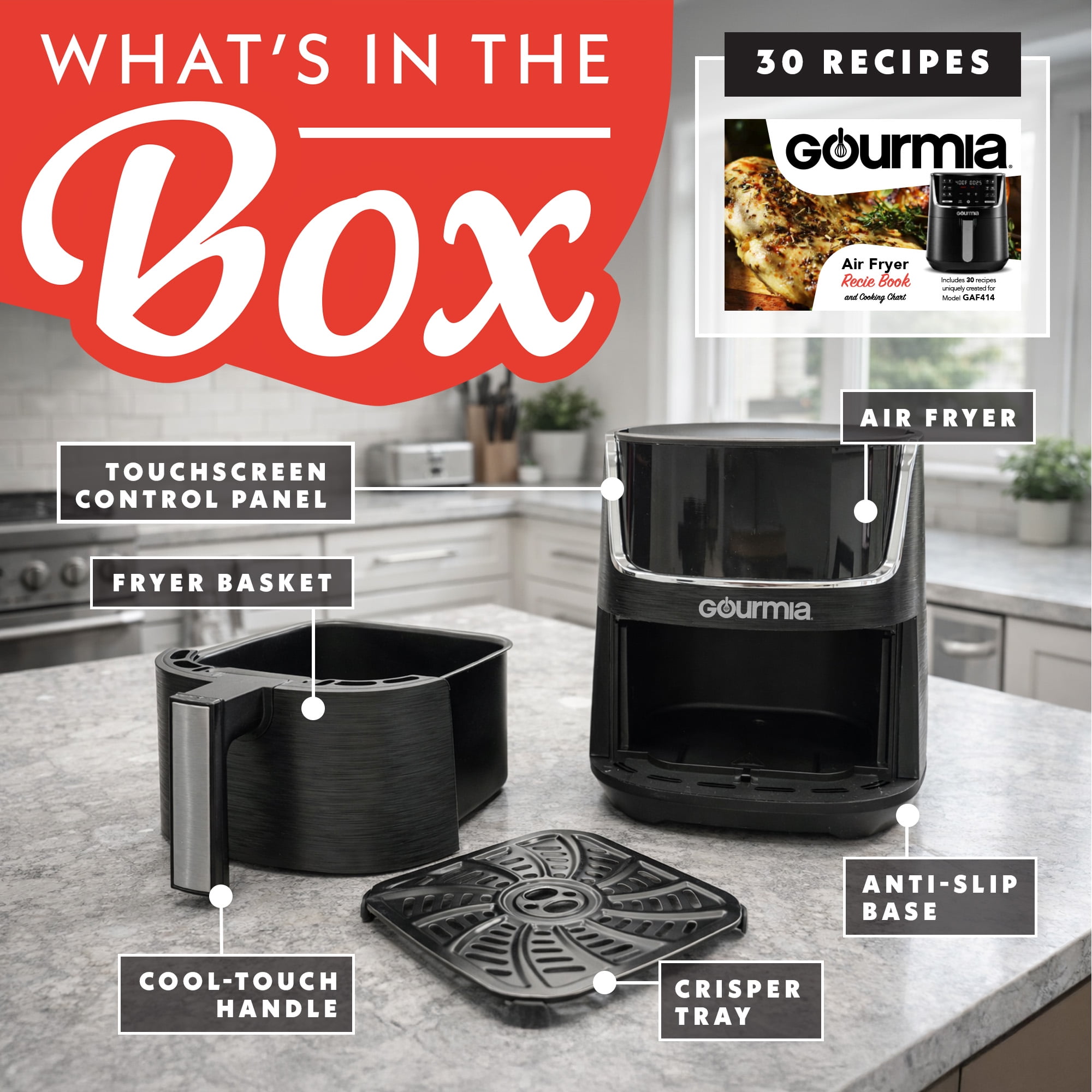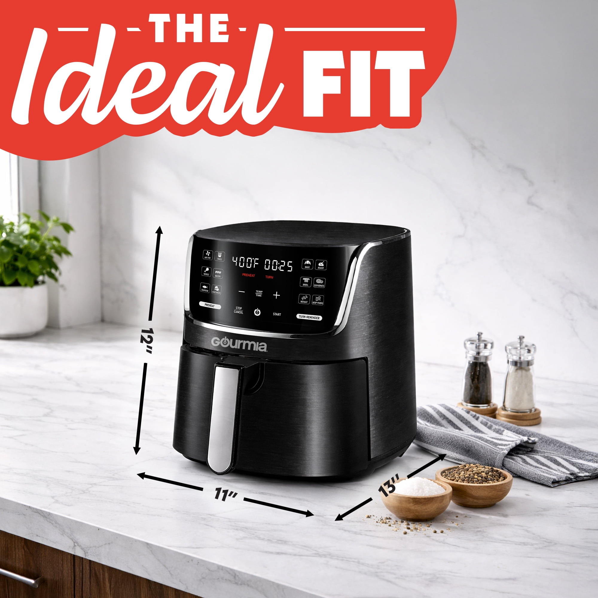 12 One-Touch Cooking Presets eliminate guesswork 4-Quart capacity is ideal for serving family and friends Gourmia’s FryForce 360 Technology fries with air for up to 80% less fat Optional Preheat and Turn Food Reminder cater to your needs Guided Cooking Prompts walk you through the cooking process Intuitive touchscreen shows temperature and time simultaneously Quick cleanup with a dishwasher-safe nonstick basket and crisper tray Model: GAF414 New condition 13″ L x 11.85″ H x 10.53″ W 12 lb 1300W