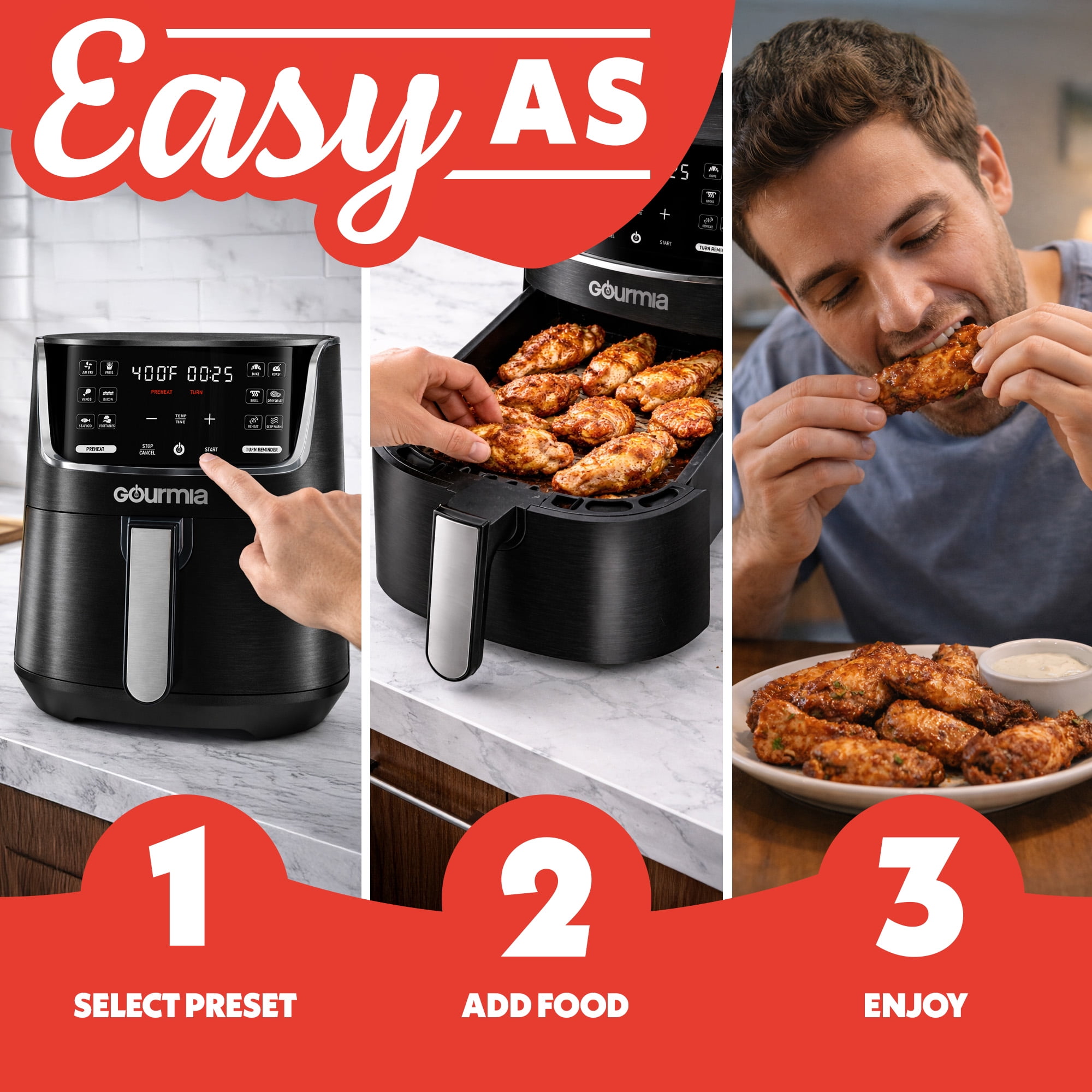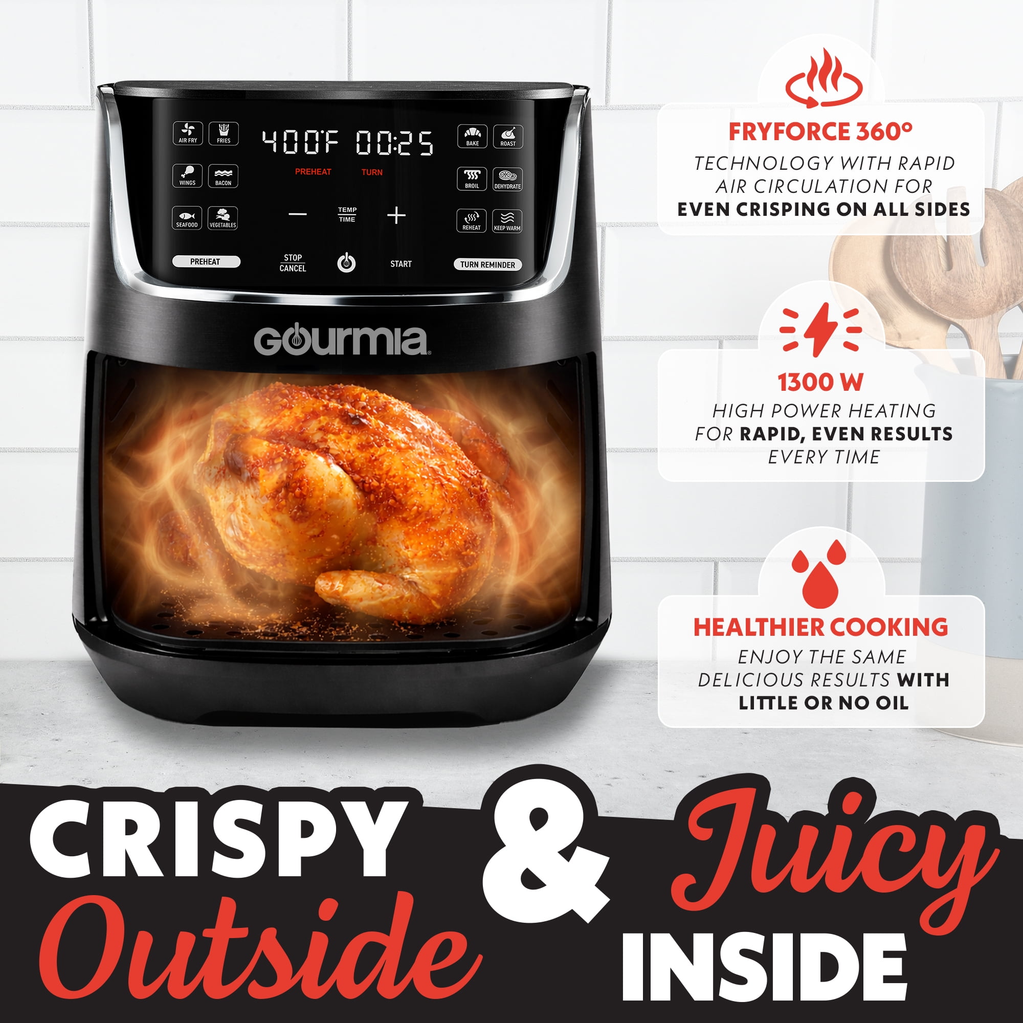 The Gourmia 1300W Digital Air Fryer makes cooking easy. The New Gourmia 4-Quart size has 12 presets for popular foods like chicken wings and apple chips. Its FryForce 360 Technology cooks food evenly and crispy. The touchscreen is simple to use, and you can change settings like time and temperature. There are helpful reminders, like preheating and turning food. Cleanup is easy—just pop the basket and tray in the dishwasher.