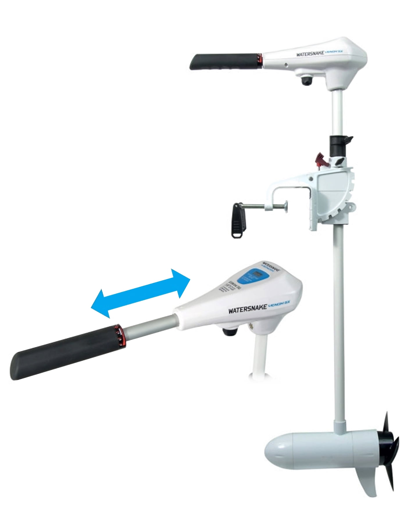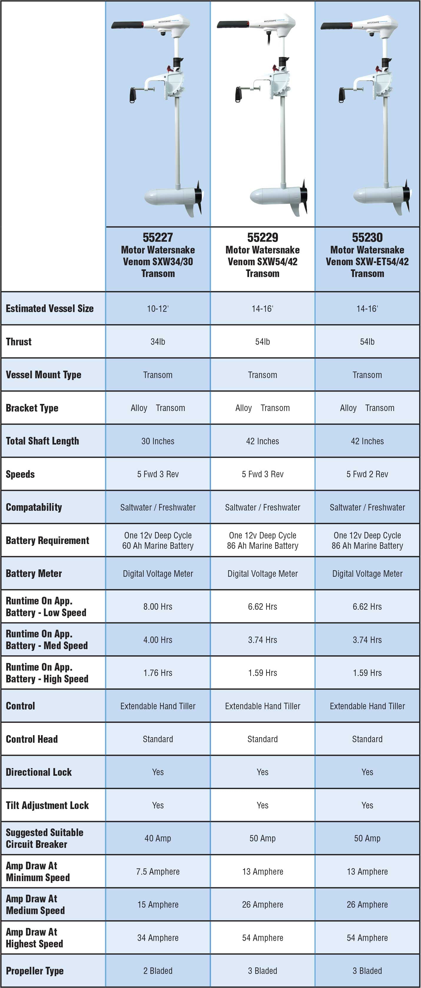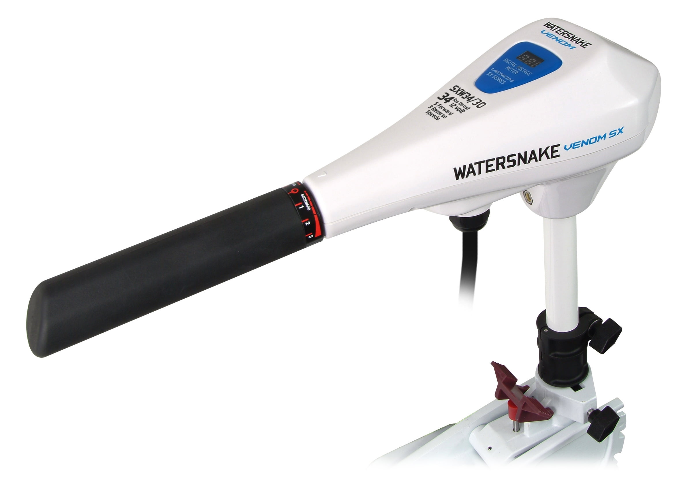 Watersnake Venom 34/30 Features: Suitable for a variety of watercraft Boat Transom mount Saltwater High and low speed control, speeds: 5/3 Forward and reverse switch extendable hand tiller steering Digital voltage meter Thrust: 34lb Volts: 12V Amps: max 34 Shaft: 30″ Transom, stainless steel and composite Prop: 2 Blade, weedless design 1 year coverage, contact distributor for info 34 pound thrust New