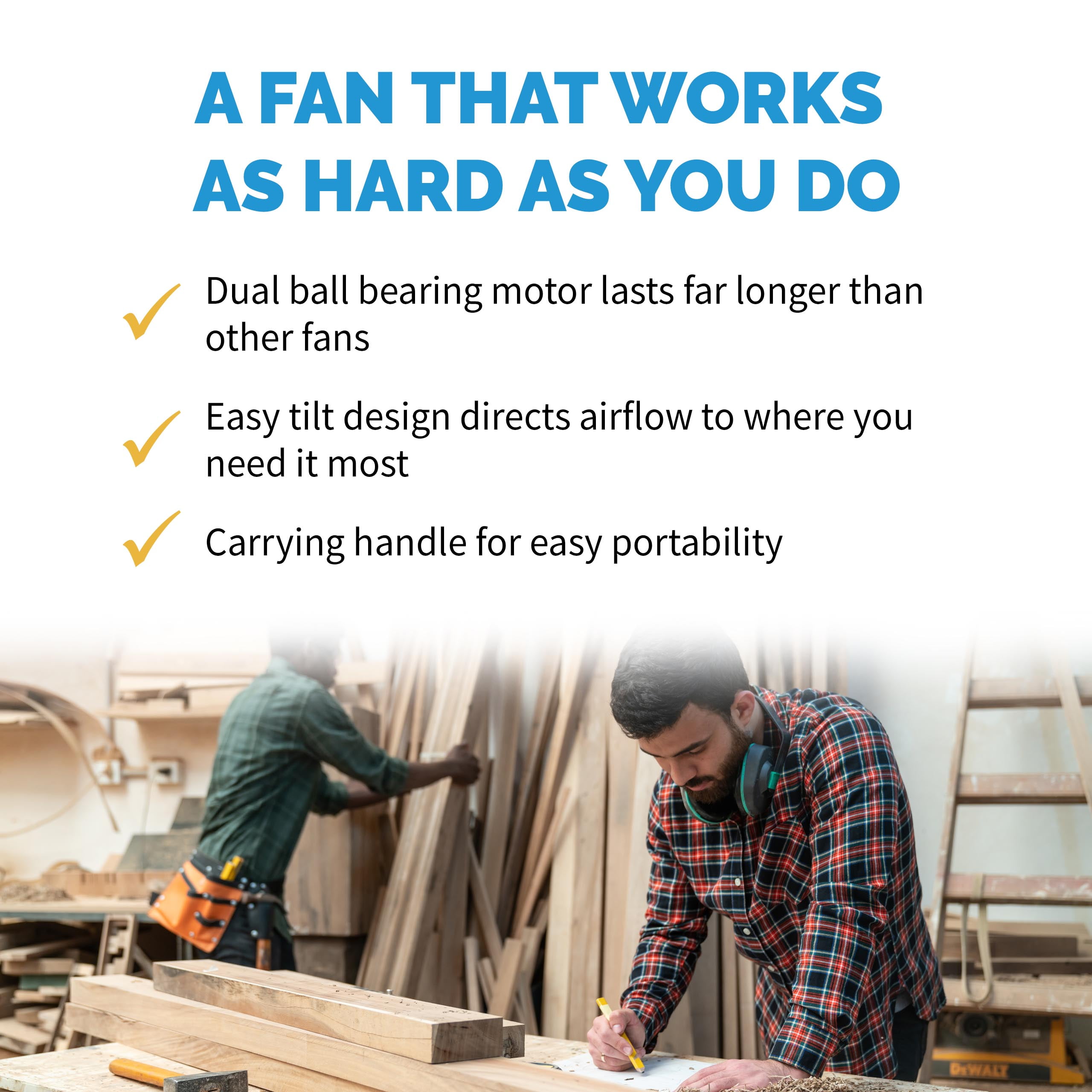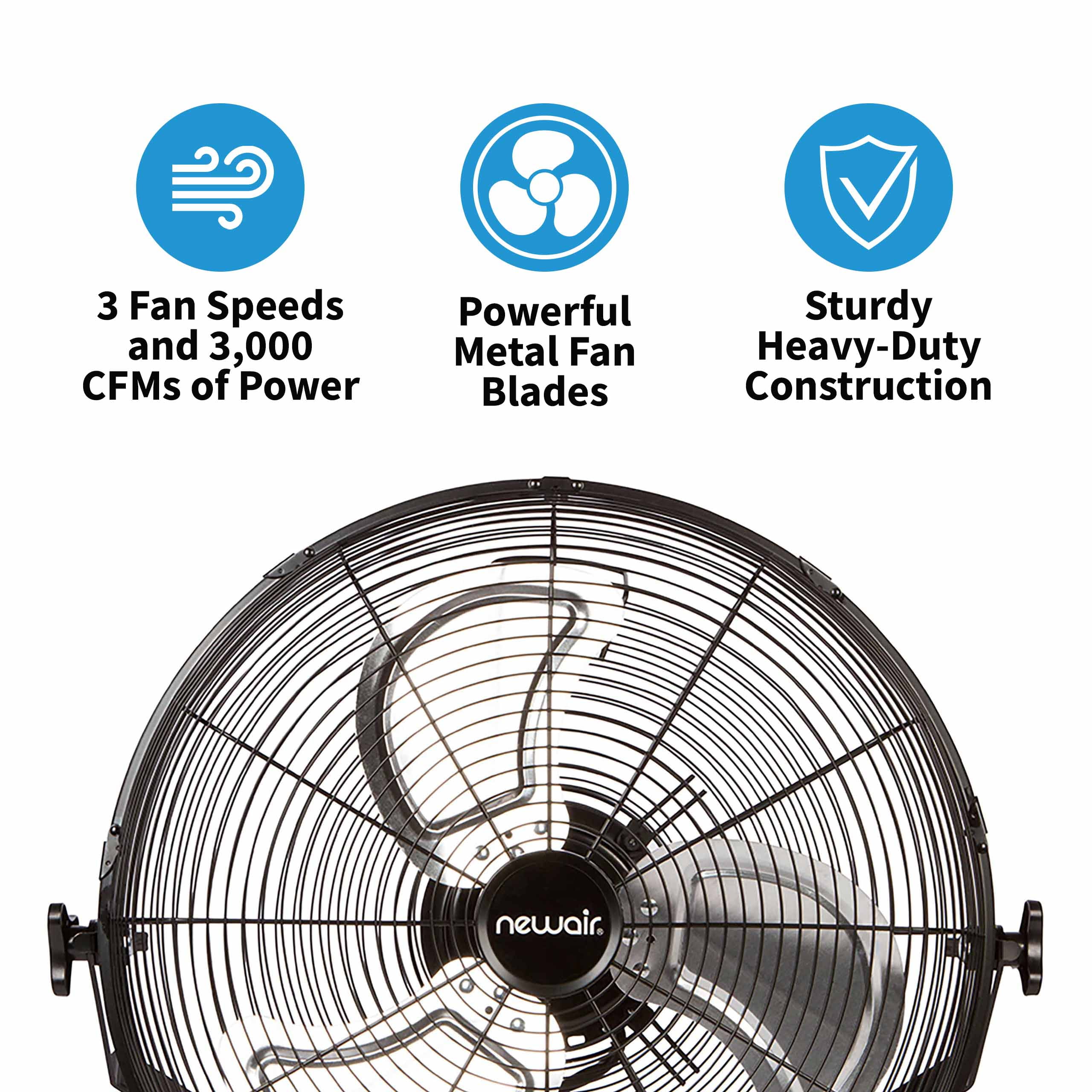 Metal fan blades for powerful airflow Durable ball bearing motor lasts longer than other fans on the market Three fan speeds for up to 3,000 CFMs of power Sturdy metal frame with rubber feet for extra stability Adjustable tilt angle to aim breeze where you need it Only 12 cents per work day to operate