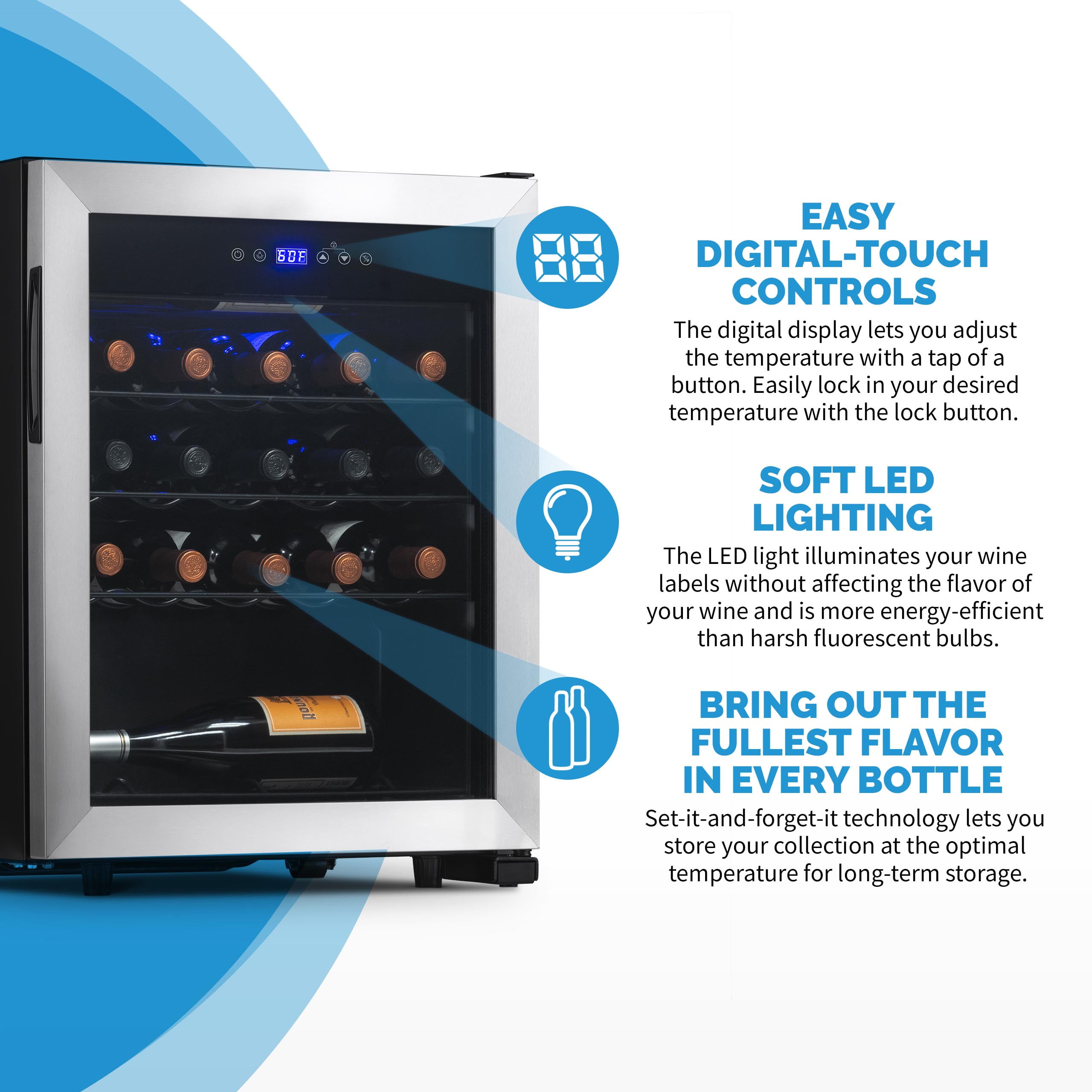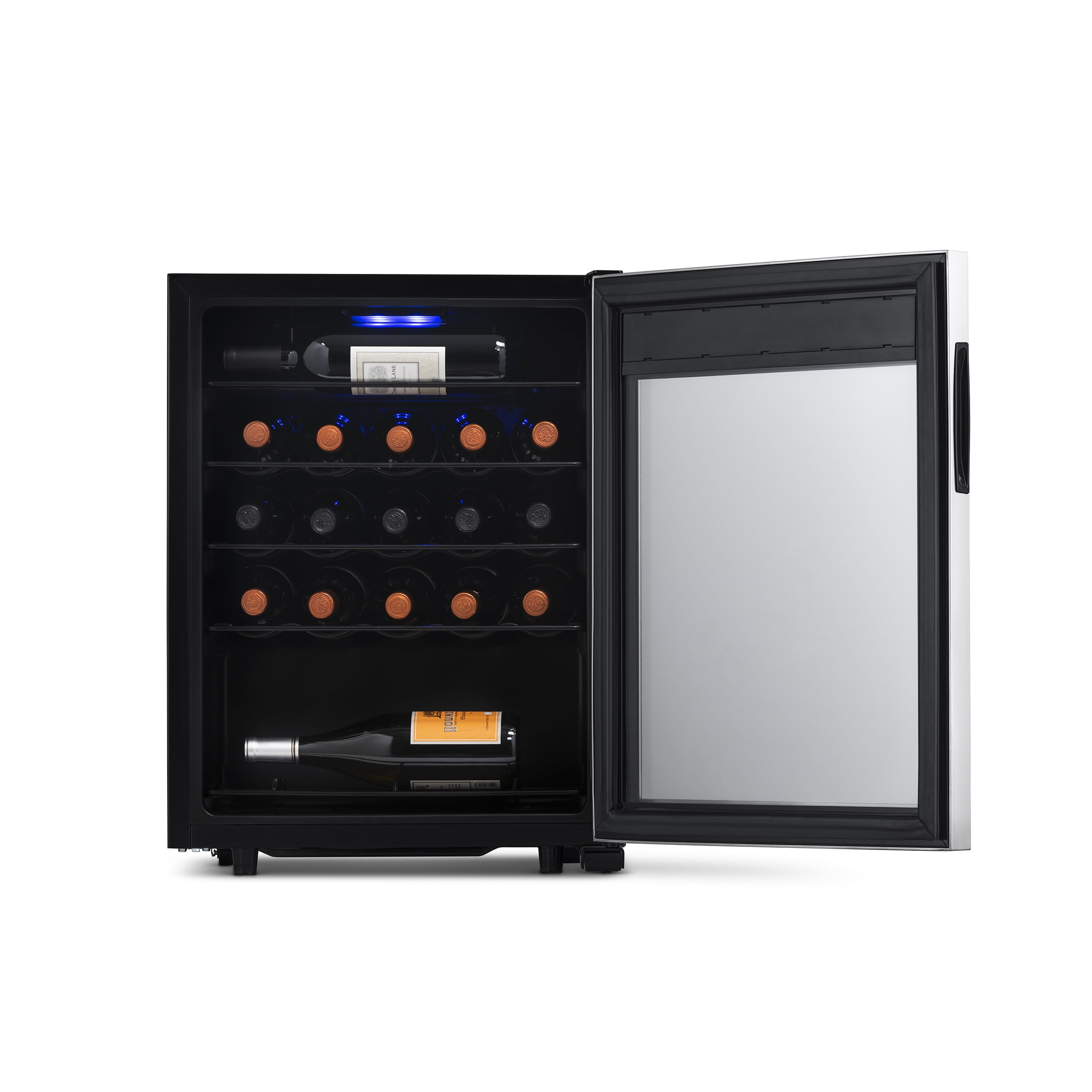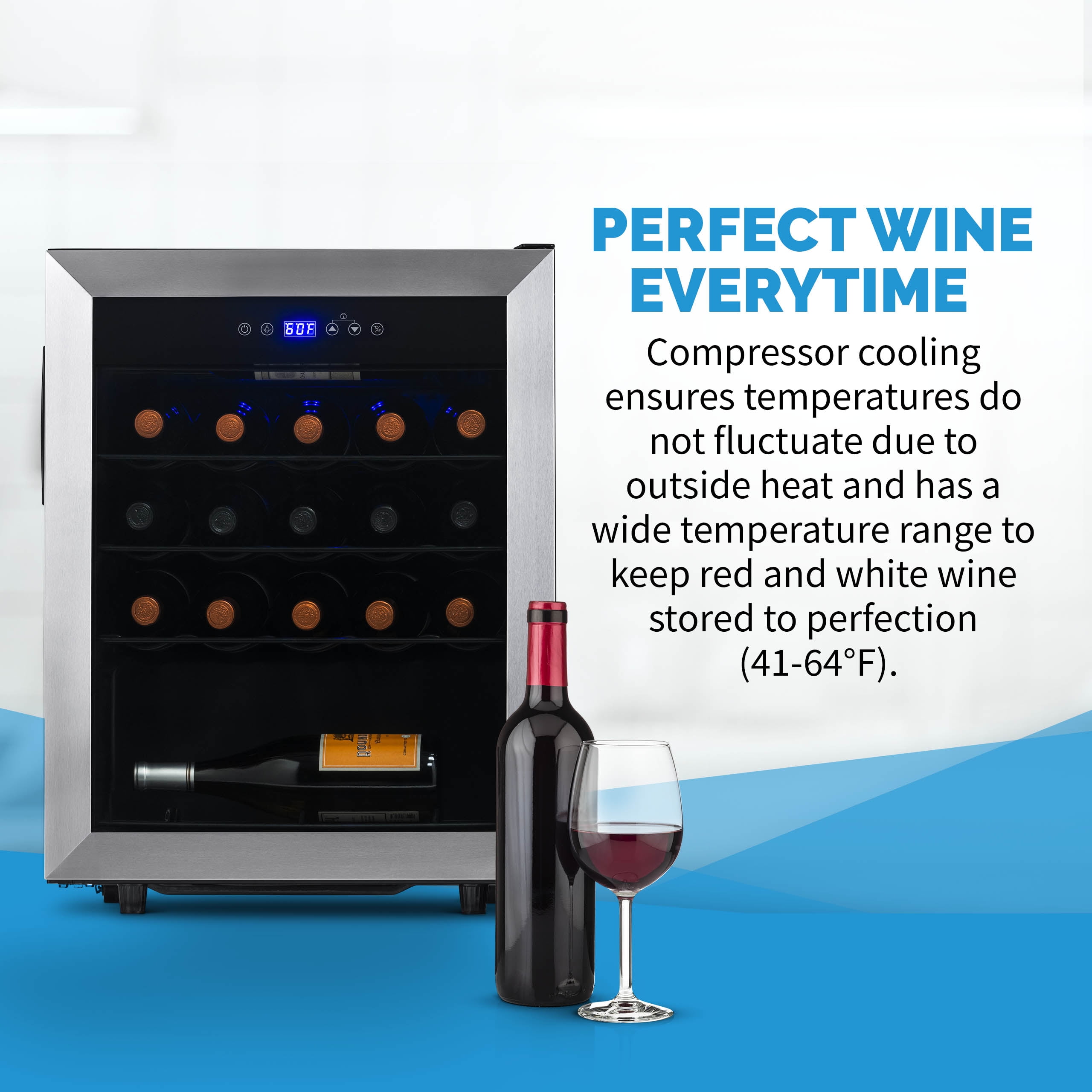 Keeps your wine at the perfect temperature between 41 and 64 degrees, ensuring optimal flavor and aroma. The double-paned glass and exterior thermostat controls help maintain the ideal temperature, promoting efficient operation. Equipped with removable racks that provide customized storage for up to 23 standard wine bottles. Sleek stainless-steel design complements any room decor. Compressor system keeps your wine collection at the perfect serving temperature. Built-in fan maintains consistent temperature and preserves the wine’s flavor and aroma. Soft LED light illuminates your collection without emitting heat like a standard lightbulb. Double-pane UV-protected insulated glass door protects your wine from harmful sun rays. Sleek black wine racks can be easily removed for convenient access to your collection. Freestanding design allows for easy placement in any room, with no installation required.