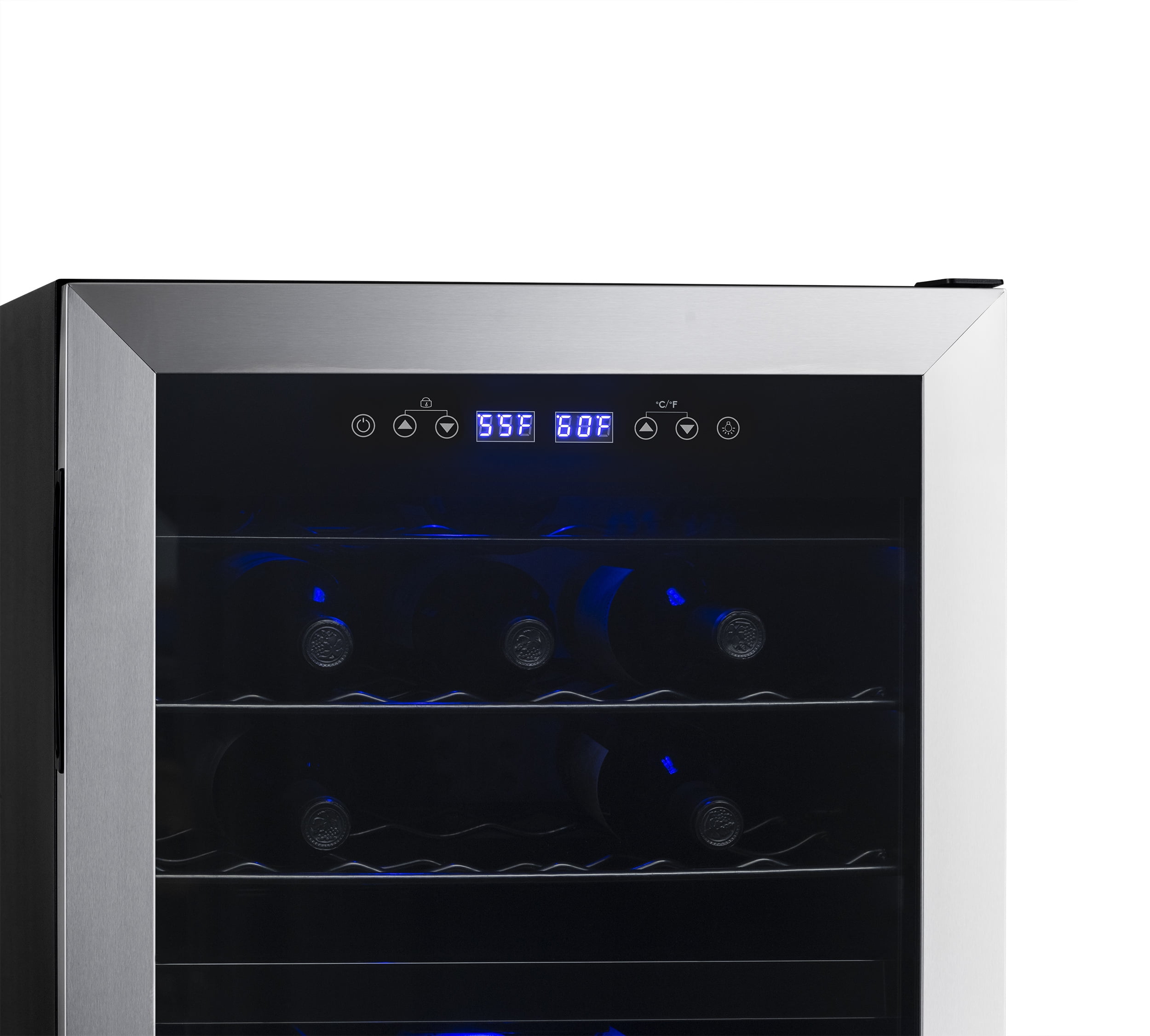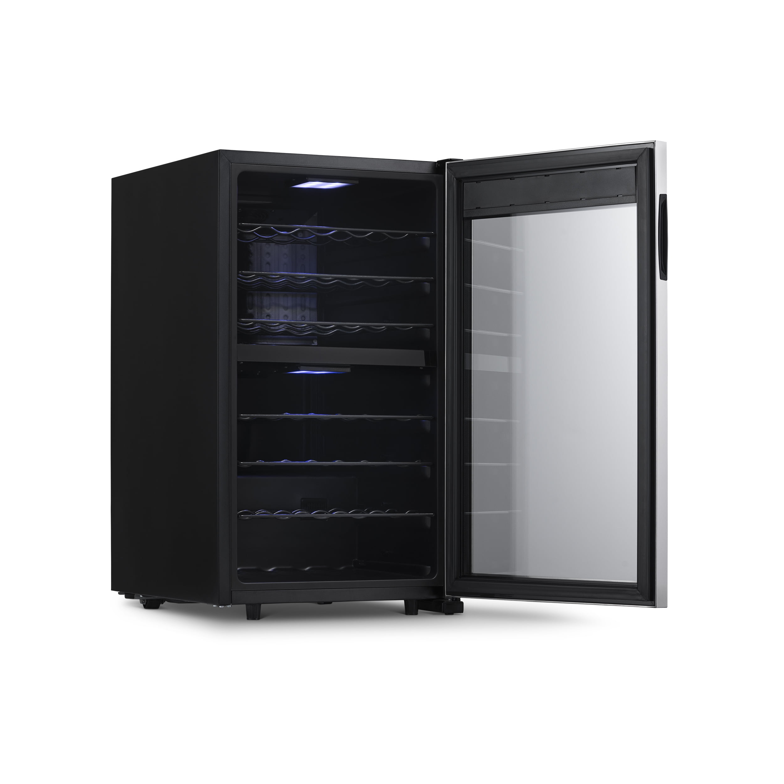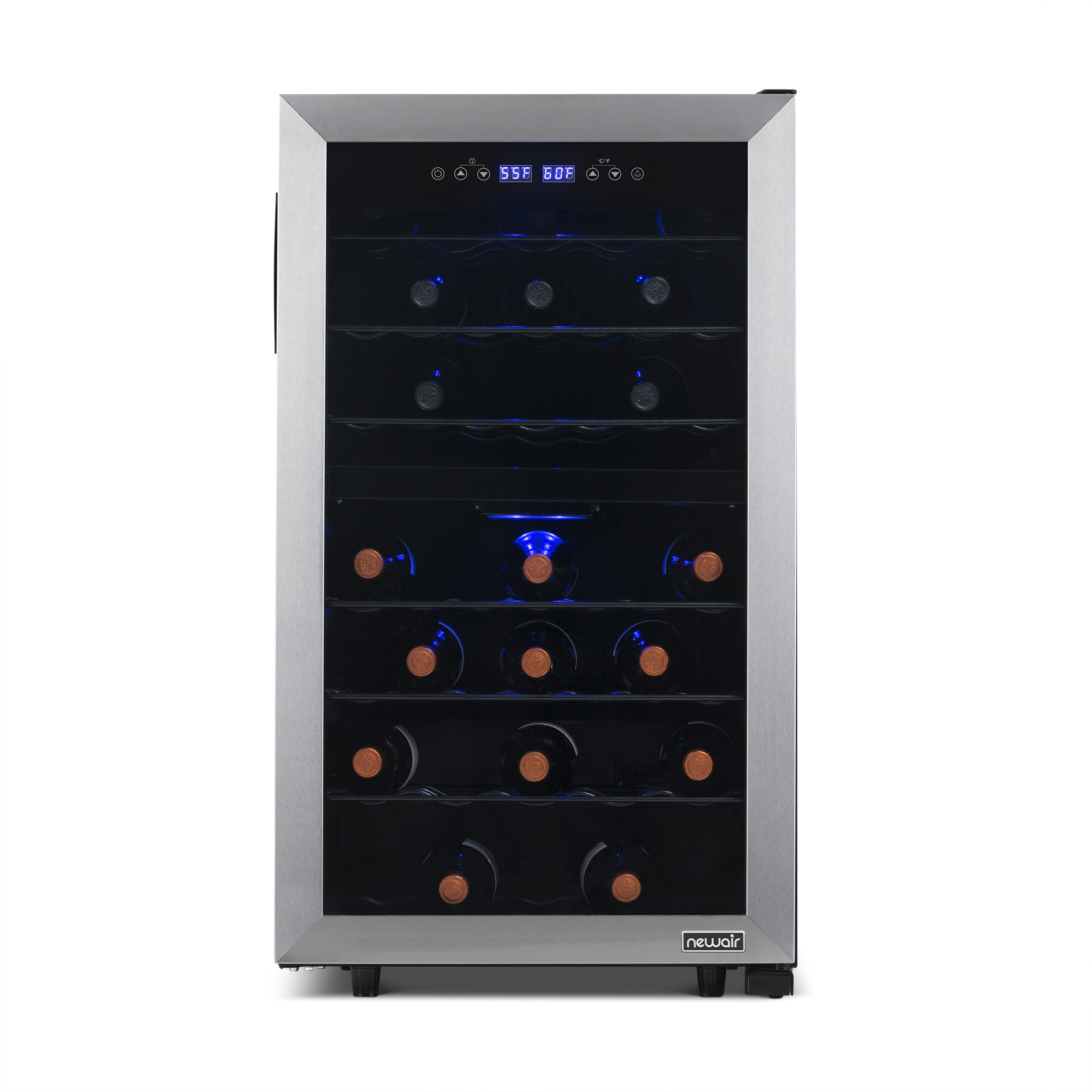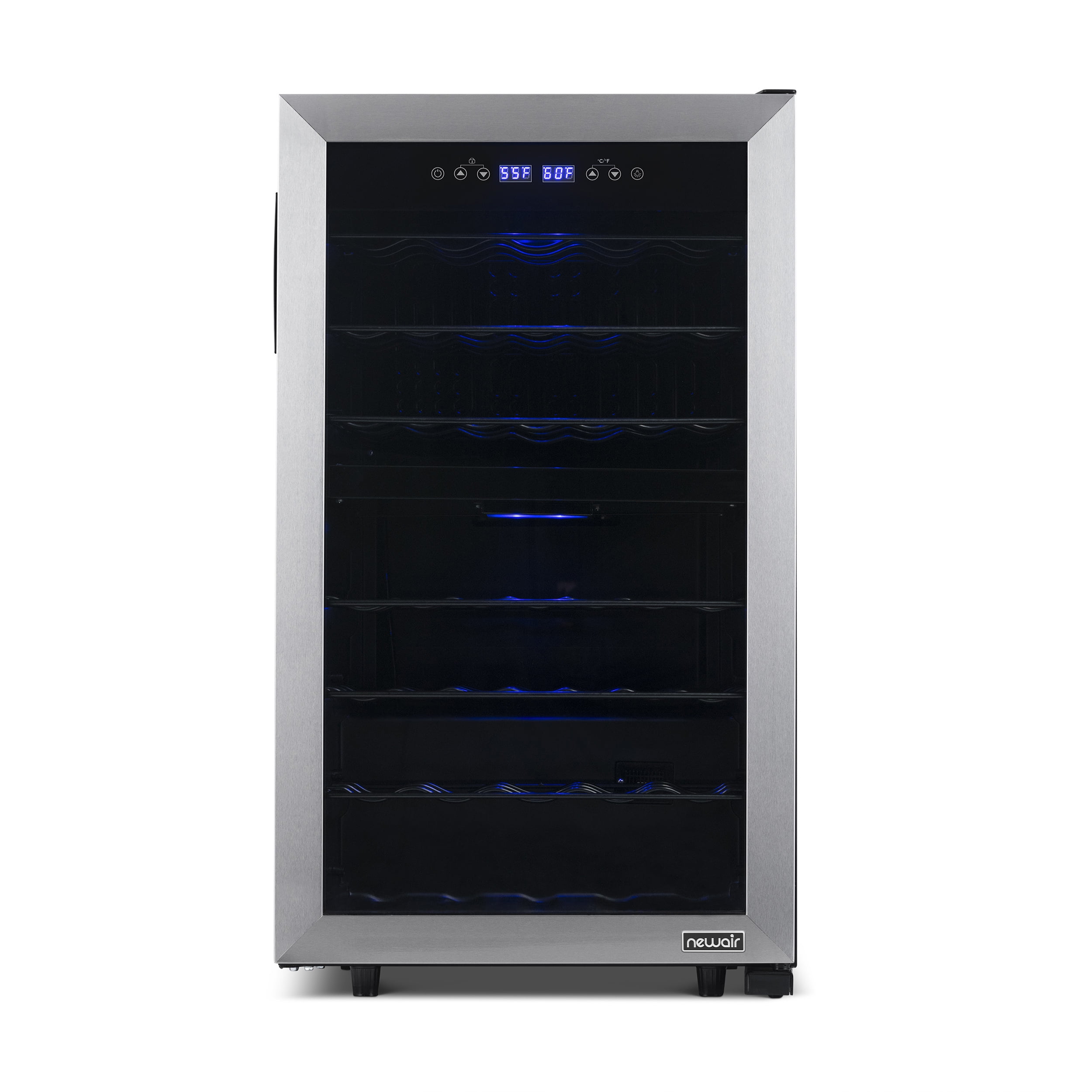 ” The Newair Freestanding 43 Bottle Dual Zone Compressor Wine Fridge is the best value for the money when it comes to keeping wine chilled. The quiet, powerful compressor keeps wine at the perfect temperature between 41 and 64 degrees, while the double-paned glass and exterior thermostat controls help keep in the cold for efficient operation. This fridge is equipped with removable racks that help to provide customized storage for up to 43 standard bottles. The sleek stainless-steel design looks great in any room of the house. 1. Perfect Wine Every Time With Compressor Cooling Wine tastes its best when stored at a temperature that brings out its full flavor. Compressor cooling keeps your fridge at the ideal set temperature and gives you perfect tasting wine every time. 2. Preserve Red And White Wine In The Dual Zones Red and white wine deserve their own temperature zones to maintain their own unique tastes and aromas. The Newair baseline wine fridge comes with a built-in fan and two temperature zones to let you store different types of wine at their optimal storage temperatures to keep flavors intact. Enjoy the complete flavor of every bottle, whether it is red, white, or sparkling. 3. Double Pane Glass Door Sun UV rays are harmful to a wine’s profile. The Newair baseline wine fridge comes with double pane glass to protect and preserve your collection. Double pane strongly insulates your fridge, so no cool air escapes and no UV rays penetrate. 4. Soft LED and Adjustable Shelves Wine flavors are delicate, which is why the Newair baseline wine fridge features a soft LED light that illuminates your collection without emitting harmful heat like a standard lightbulb. Remove and adjust its sleek racks to accommodate regular or larger-than-standard bottles. “