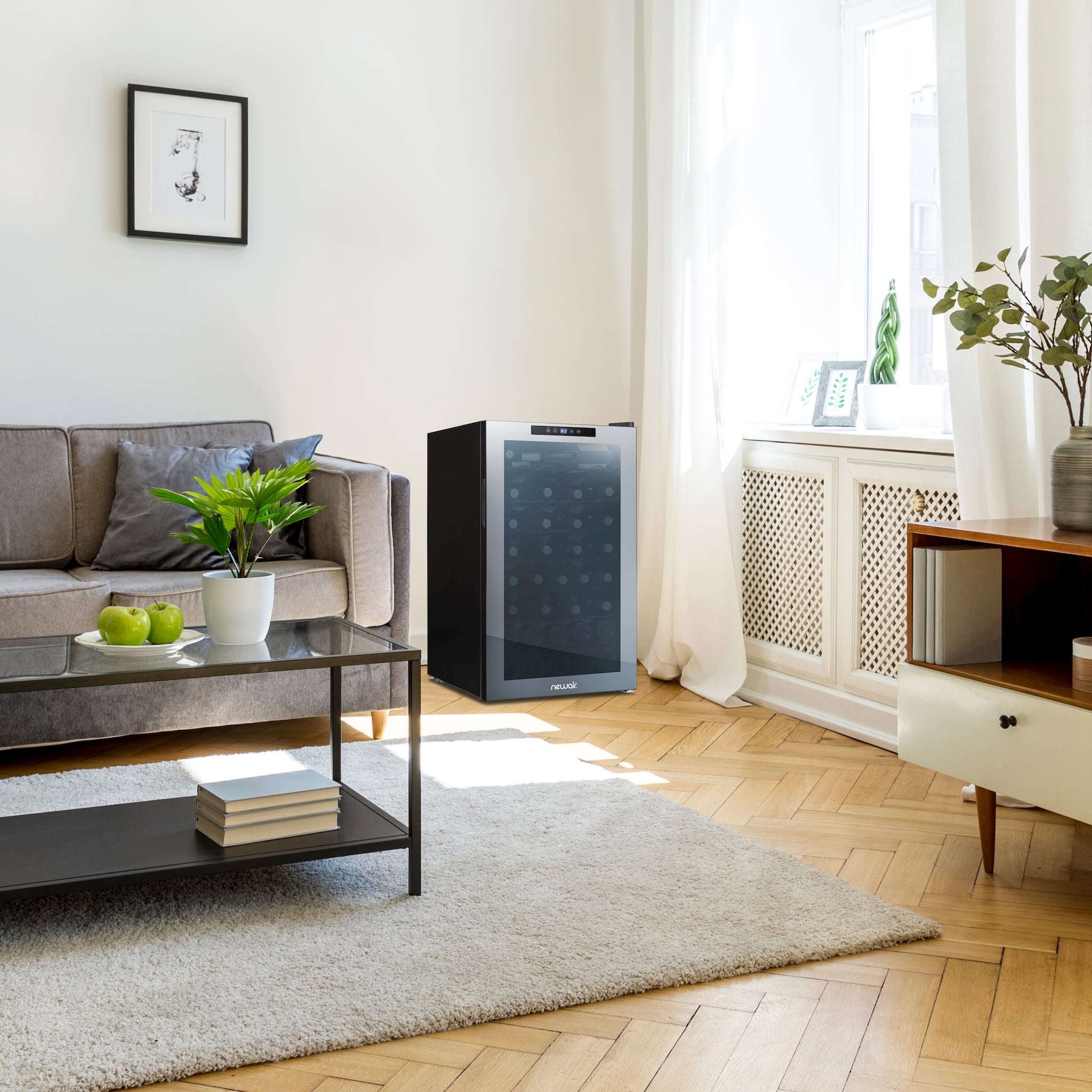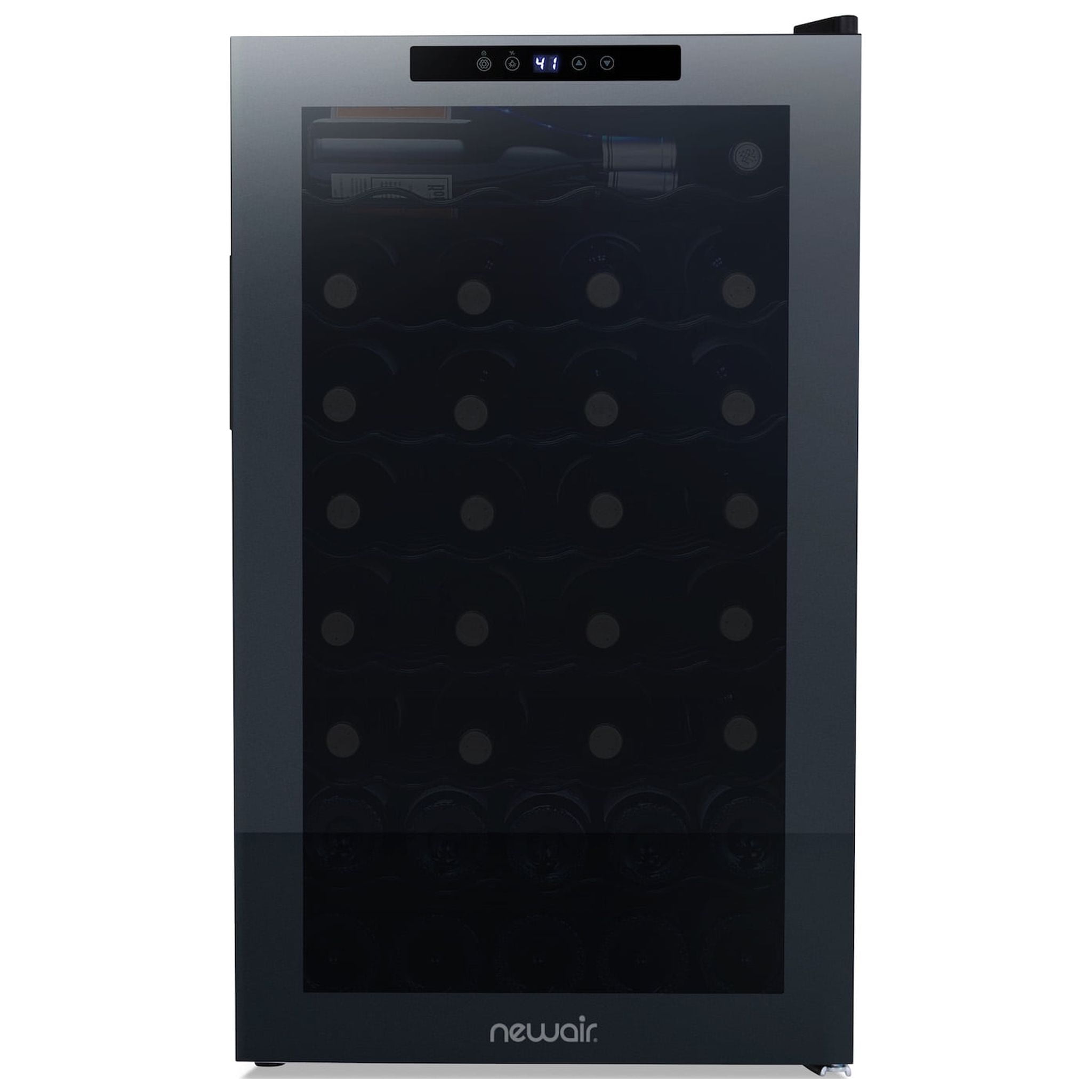 After a long day, there’s nothing better than the company of good friends, good food, and a great glass of wine. The Newair Shadow Series 51 Bottle Wine Fridge lets you enjoy the finer things in life—and looks great doing it. The sleek, updated design features a mirrored glass door that blends perfectly into your décor while resisting smudges and fingerprints. The double pane glass blocks harmful UV rays to protect your wine’s flavor and aroma. The durable control panel is built right into the glass, allowing you to select the perfect temperature with ease. It’s never been easier—or more stylish—to serve up your favorite vintage. 1. Frameless Mirrored Door with Double Pane Glass Double-paned glass provides excellent insulation to keep harmful heat and UV light out of your fridge and away from your wine. The on-trend mirrored glass resists fingerprints and smudges, so it’s always ready for guests. The control panel is built right into the glass for a streamlined look and added durability. 2. Perfect Wine Every Time with Compressor Cooling Wine tastes its best when stored at a temperature that brings out its full flavor. Compressor cooling keeps your fridge at the ideal set temperature and gives you perfect tasting wine every time. 3. Preserve Red and White Wine to Perfection Enjoy the complete flavor of every bottle, whether it is red, white, or sparkling. The Shadow Series wine fridge comes with a compressor cooling with built-in fan to provide the optimal storage temperatures for your wine collection and keep flavors intact. 4. Soft LED and Adjustable Shelves Wine flavors are delicate, which is why the Newair baseline wine fridge features a soft LED light that illuminates your collection without emitting harmful heat like a standard lightbulb. Remove and adjust its sleek racks to accommodate regular or larger-than-standard bottles.