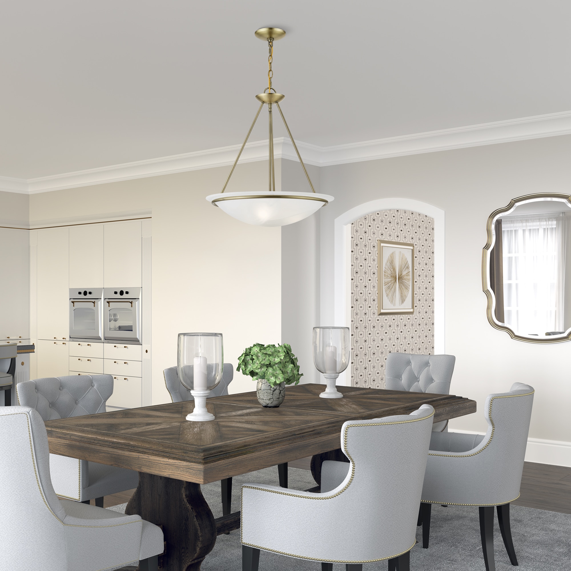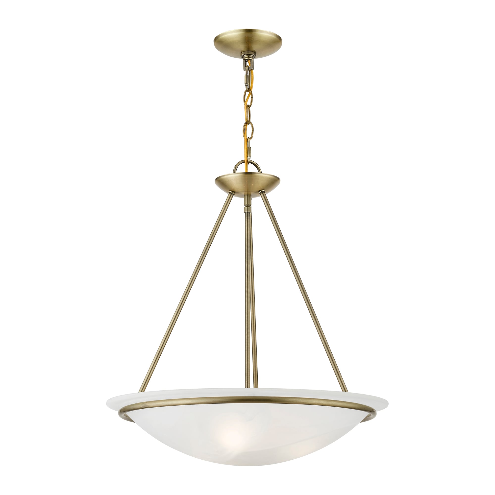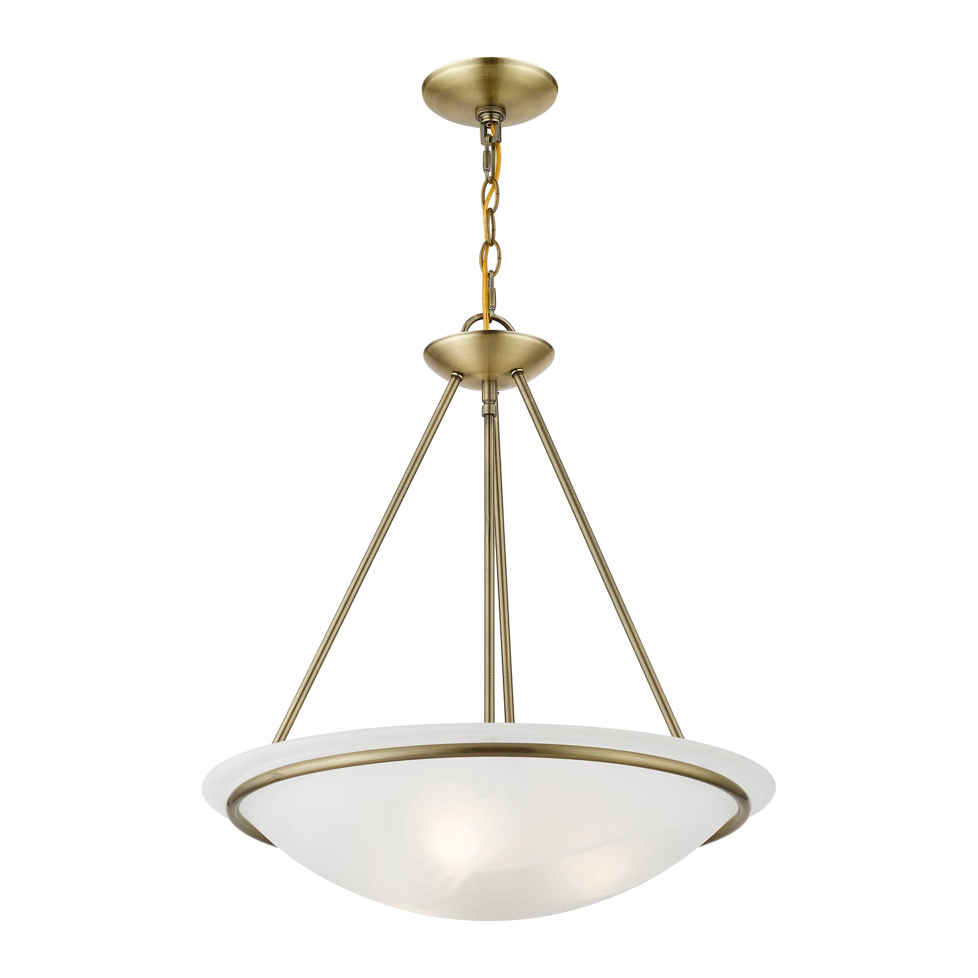 This three light pendant features a lustrous antique brass finish with light glowing from within the large white alabaster glass bowl shape shade. Complete a kitchen or dining room with this beautiful pendant.