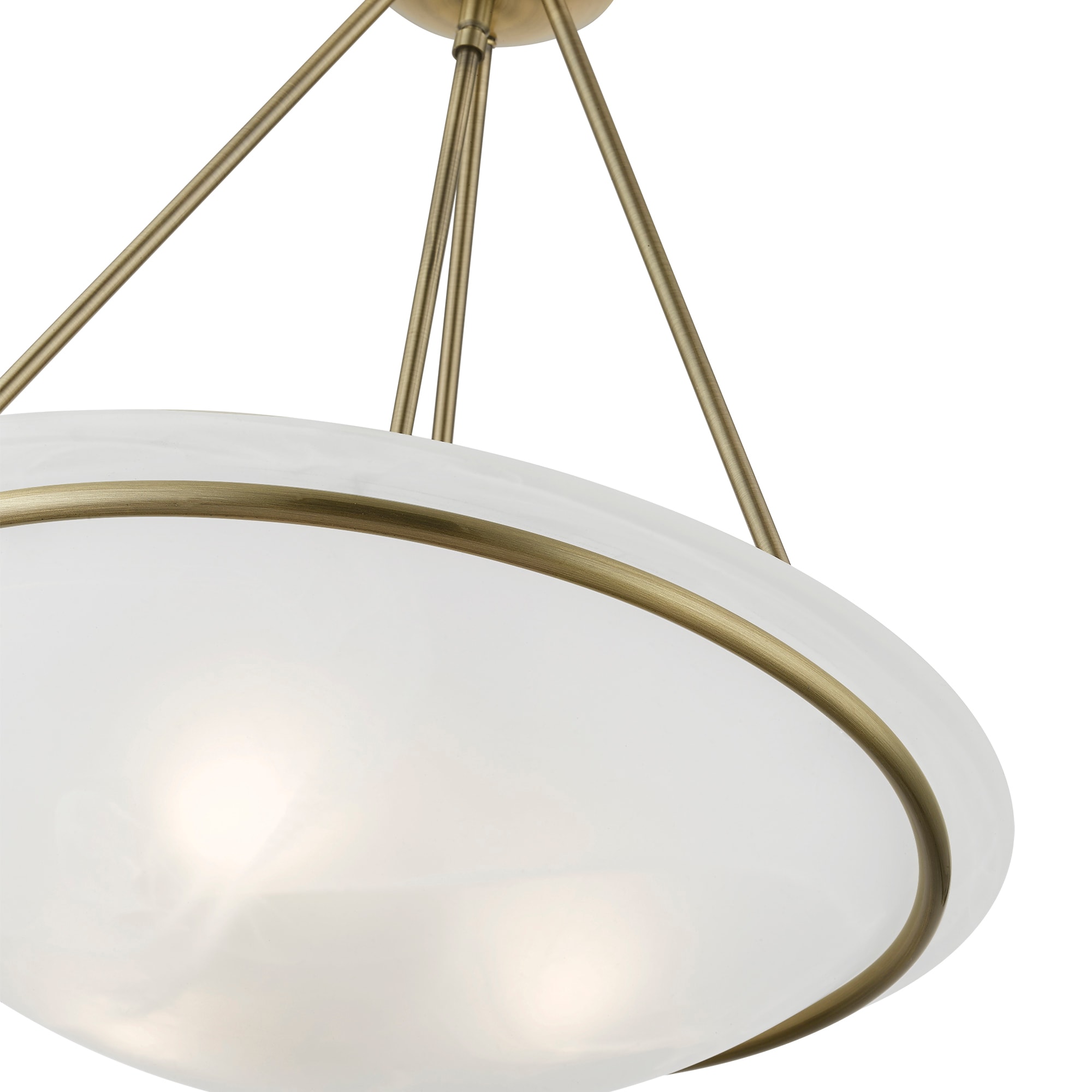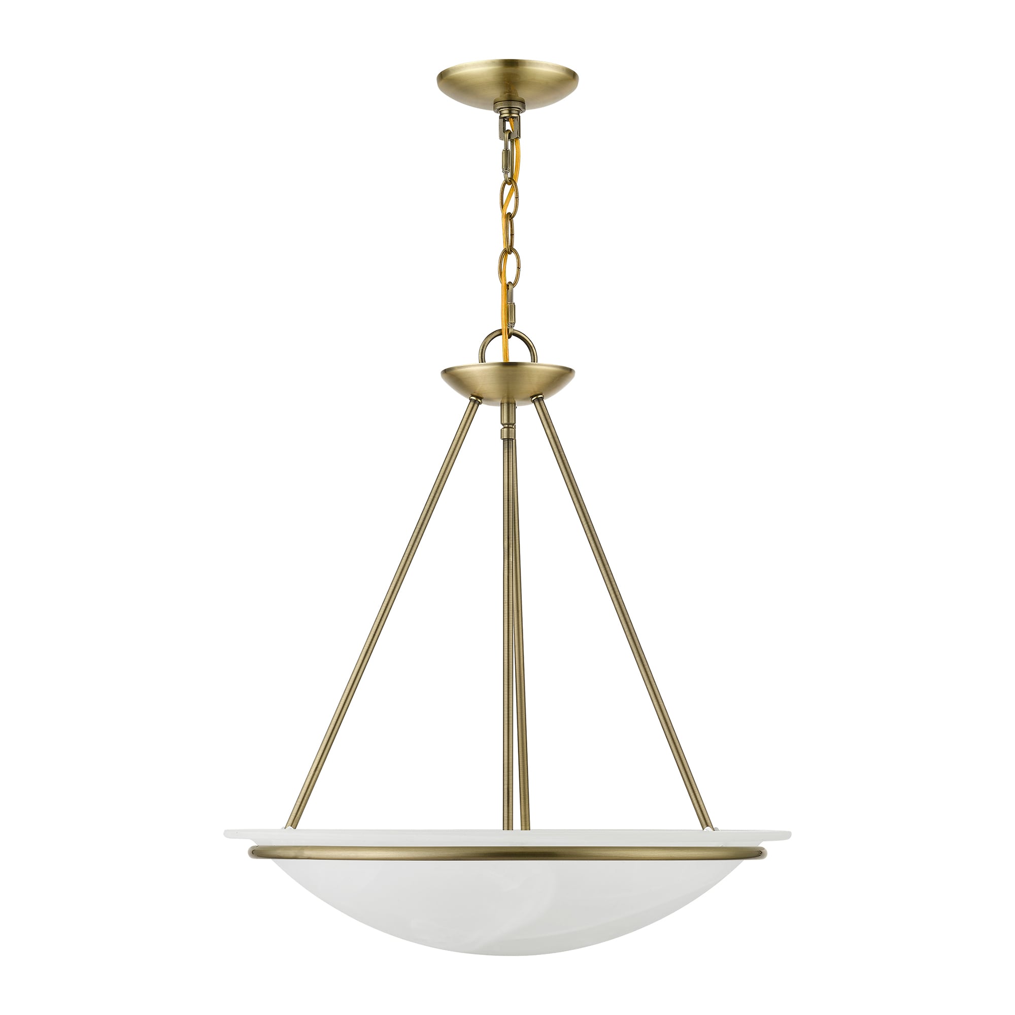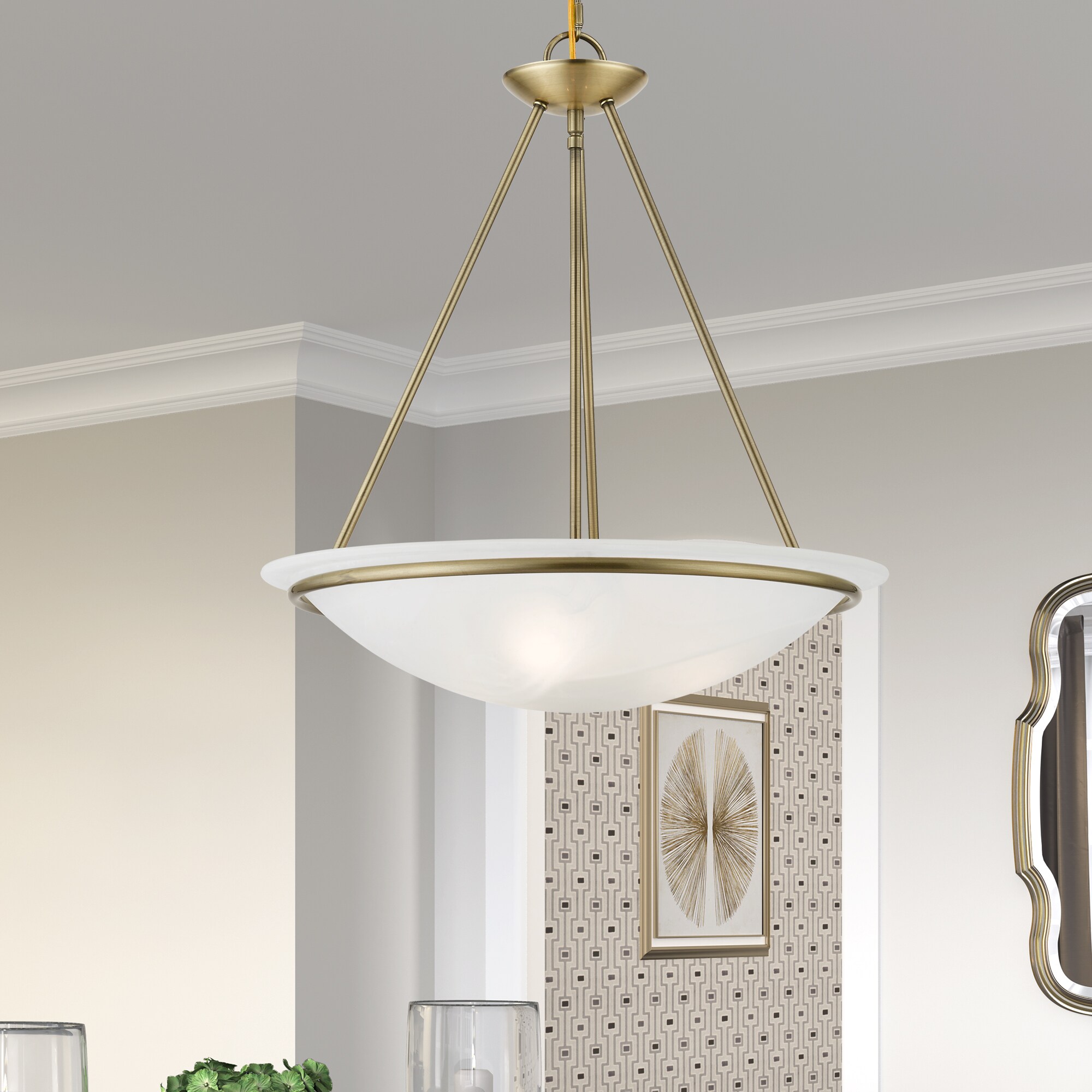 This three light pendant features a lustrous antique brass finish with light glowing from within the large white alabaster glass bowl shape shade. Complete a kitchen or dining room with this beautiful pendant.