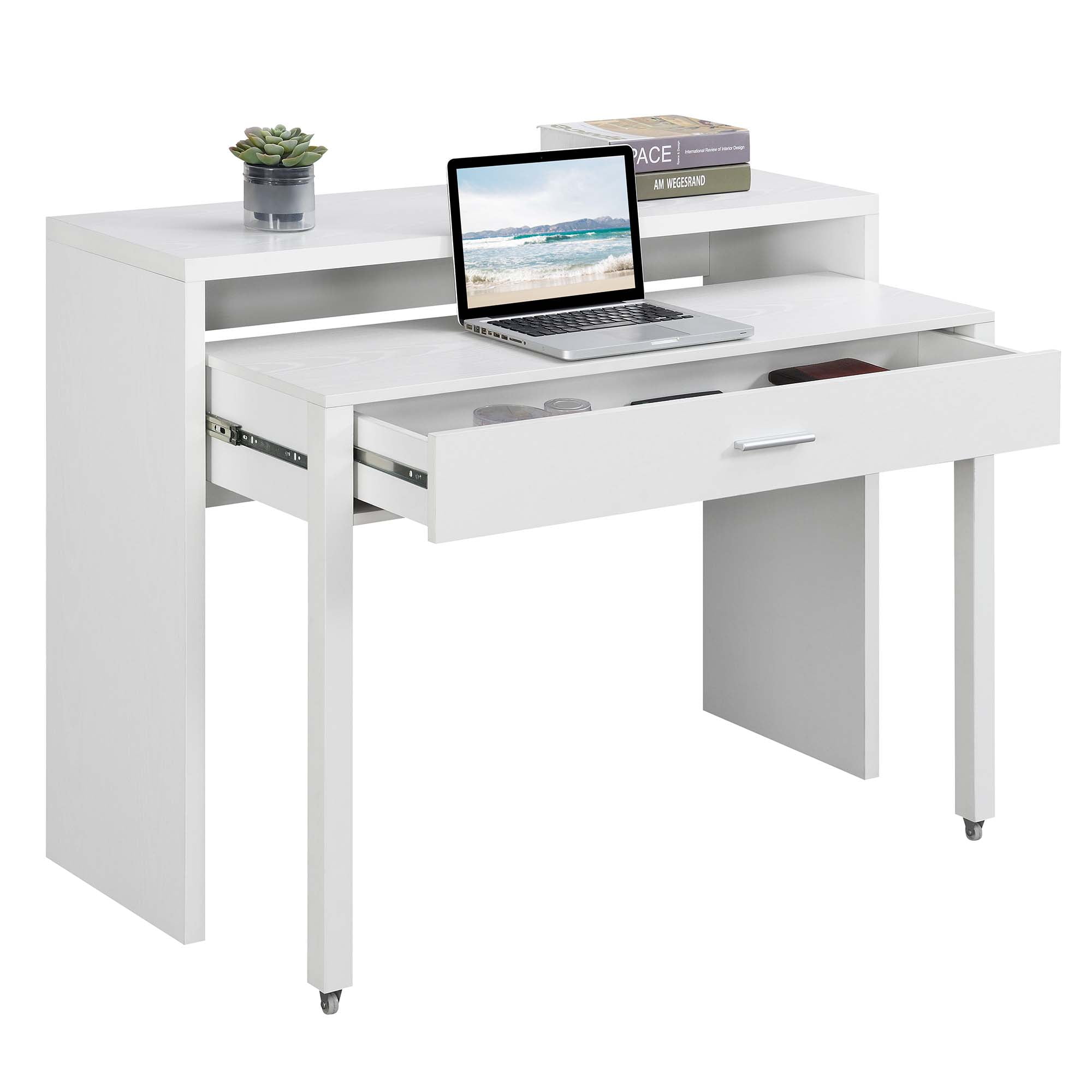 Features: Part of the Newport Collection by Convenience Concepts Modern and contemporary style Can be used as a desk or console table Middle tier is on ball-bearing slides and caster wheels, easily expands for additional workspace Wide, spacious drawer on smooth ball-bearing slides Top shelf/riser perfect for display Engineered from honeycomb, particleboard, and melamine Low maintenance, easy to clean, and built for durability Easy to assemble with instructions provided Overall product dimensions: (L) 47.25 in. x (W) 14.5 in. x (H) 34.75 in.