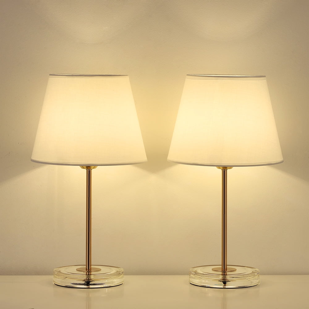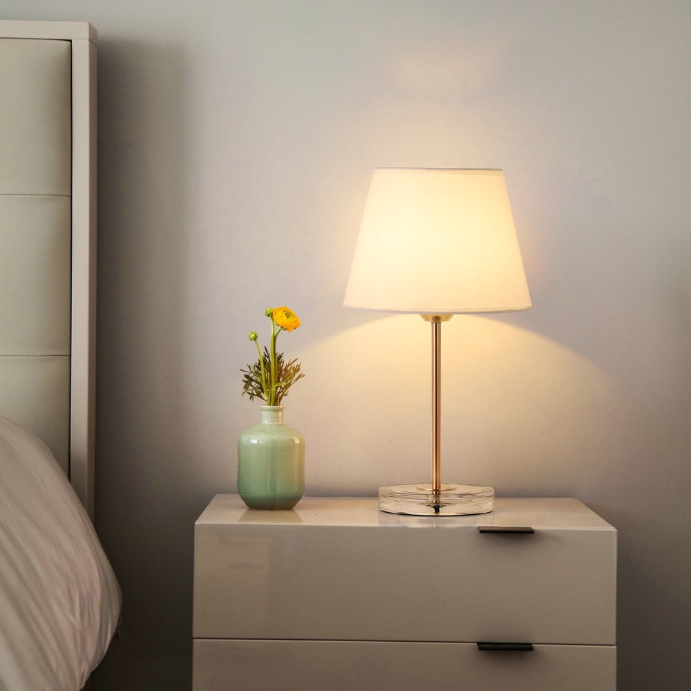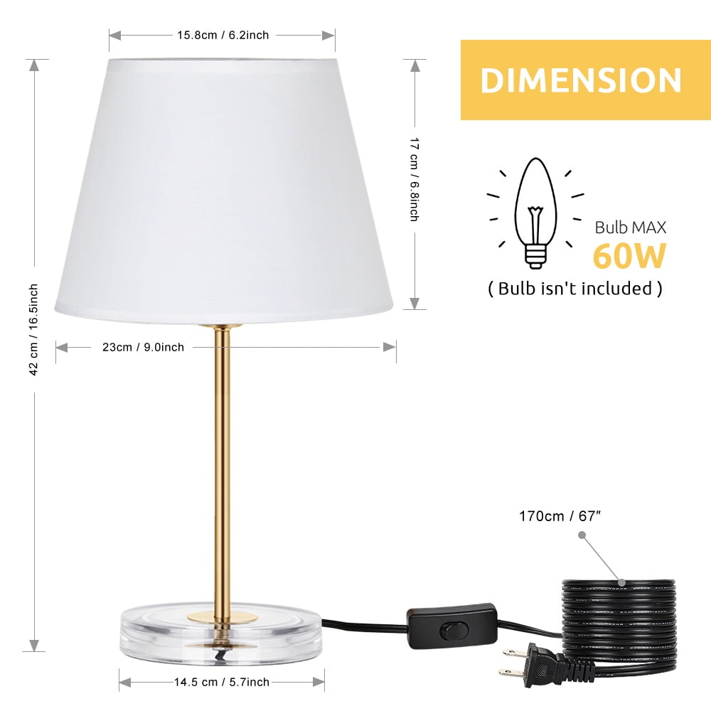 Perfect Size For Any Desk Designed with 16.5(H) x 5.2(L) x 6.7(W) inches, the nightstand table lamps are save-space and not too heavy, are suitable for any desk, whether it is a big table or a small table, making a splendid accouterment for your desk! (Please notice the size when you browse) Design With Acrylic Base The bedside table lamps with the classic shape of lampshade and holder, match fabric and golden metal, making a touch of style, never out of date. An acrylic base makes the lamp appear to float, bringing unique charm and imagination. It is a great stylish gift for housewarming, anniversary, birthday, Christmas, etc. Safe & Easy To Use The cord and plug of the bedside table lamp is UL listed. By being UL listed, each lamp is nationally recognized for its standard of safety. It’s a not heavy lamp, easy to move to any place where you have lighting needs and the ON/OFF switch on the cord close lamp is easy to use. It is a great gift for anyone! Compatible With E26 Bulb The stylish nightstand lamps with closed lampshades prevent direct contact with your eyes and creates a peaceful atmosphere in your room or elsewhere. Compatible with a variety of E26 bulbs types, such as Edison, incandescent, halogen, LED, or CFL, but do not use a bulb e x ceding 60W. (NOTE: Bulb is not included, Ma x 60W) Widely Used And Great Gift Made of high-quality metal and fabric, the bedside table lamp can not only be used as a night light but also great home decoration for your home. It is e x quisite, also a perfect gift for friends and family at Christmas, birthday, and New Year.