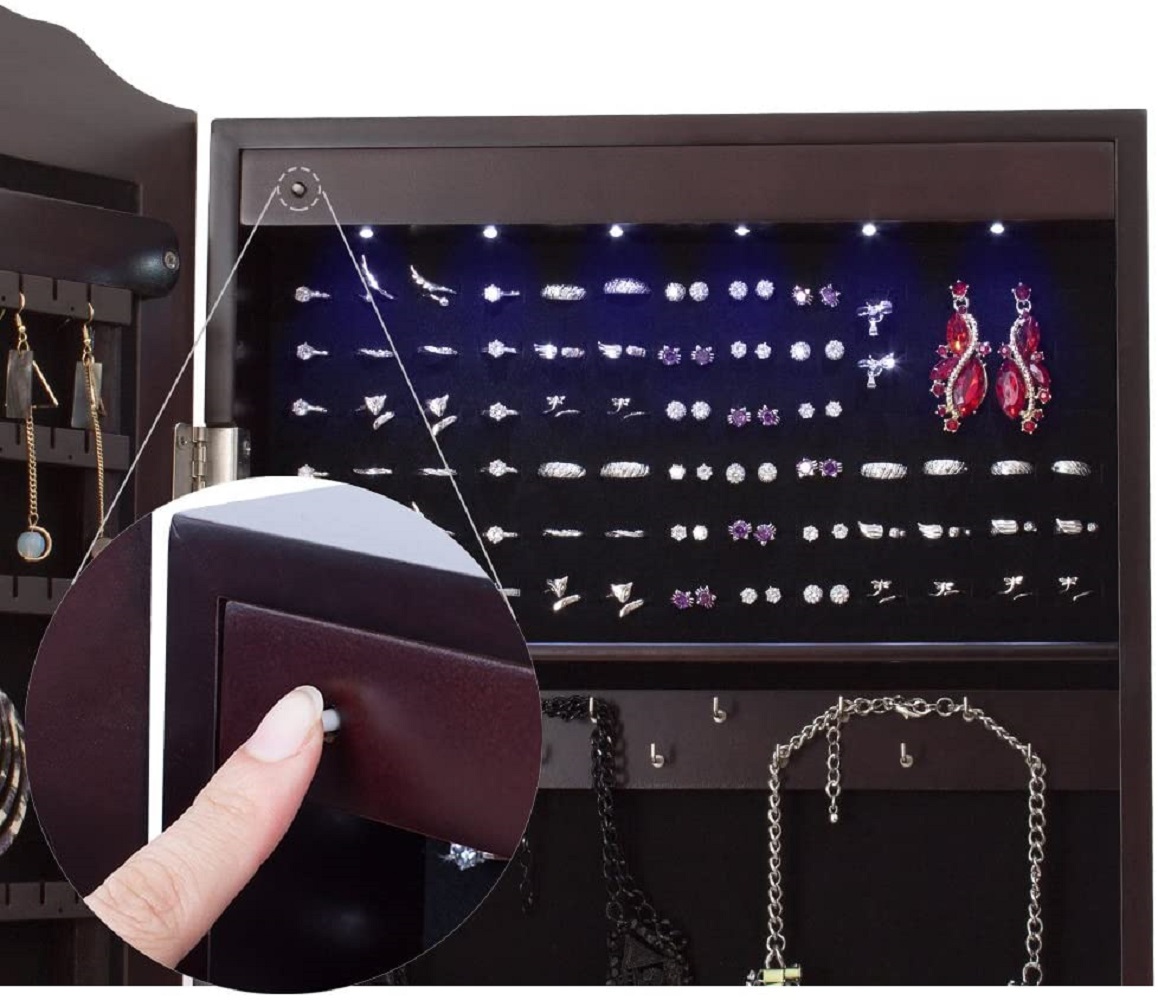 This NEX Lockage Full-Length Jewelry Armoire Mirror is every room’s essential for individuals who love to wear and collect jewelry and accessories. It is designed with high-quality materials that ensure long-lasting use. With the ability for the cabinet to hold up to has 96 earring hanging slots, 78 ring holes, 36 necklace and bracelet hooks, 4 shelves, 1 pouch, 1 scarf rod, and 2 bottom drawers., this jewelry cabinet can help save lots of room for many individuals. This cabinet is also able to be adjusted to 4 tilted angles, which allows for easy access at any angle. With the door held by magnets and installed with a lock and key, customers are able to easily open and close the cabinet door and can lock their expensive accessories in a place that one no would ever think of. This Jewelry Armoire Mirror also has integrated LED lights which can help one provide the needed light to see and put on their beautiful outfits.