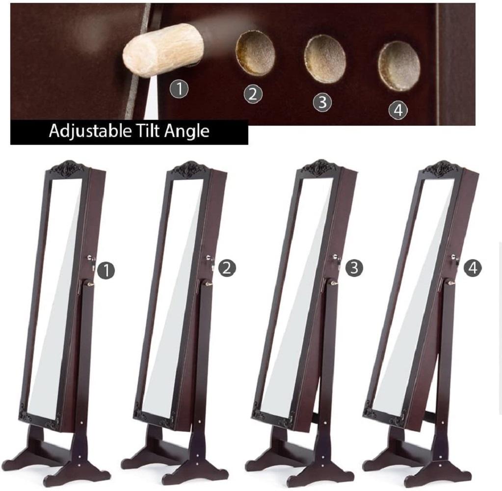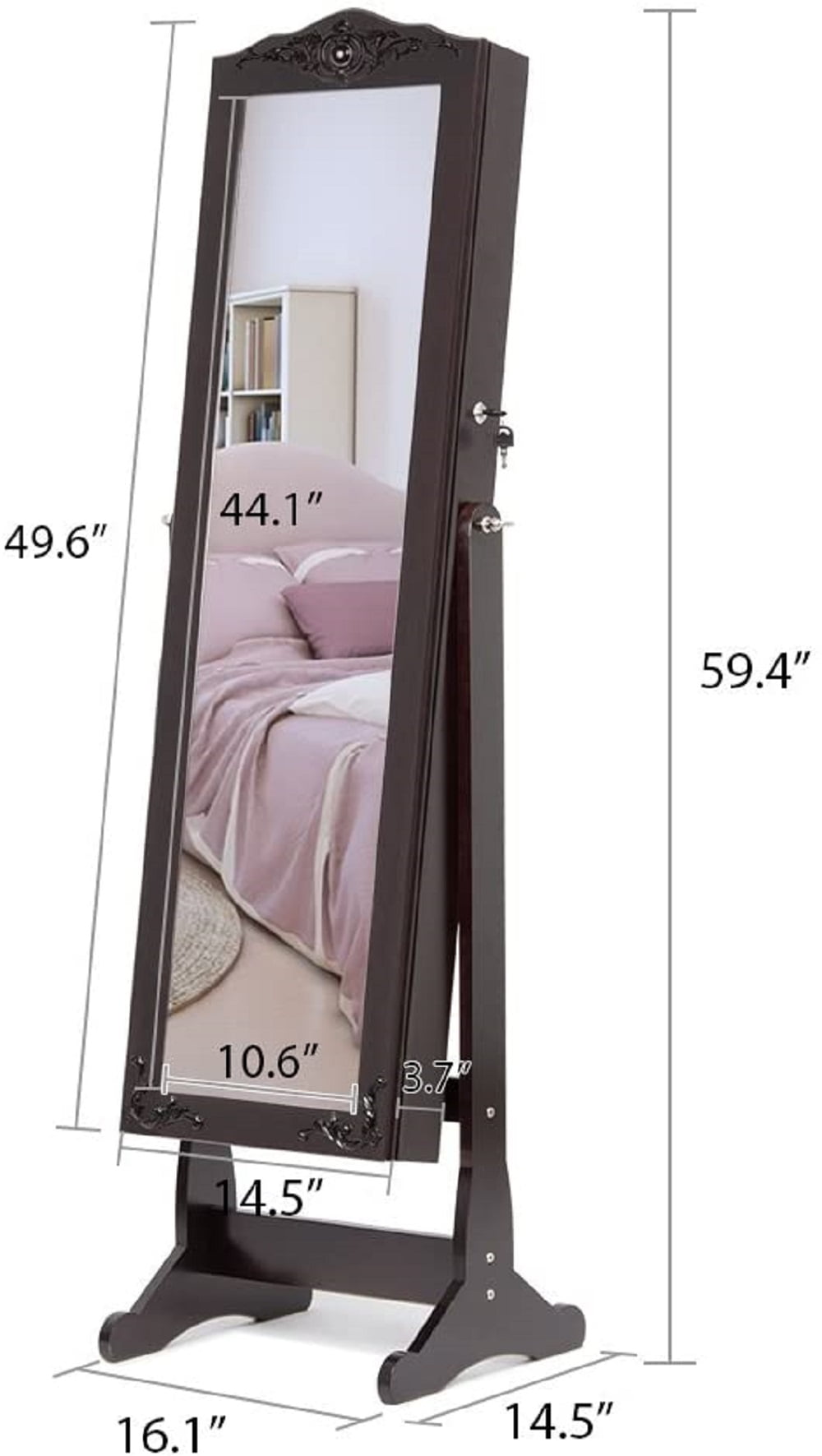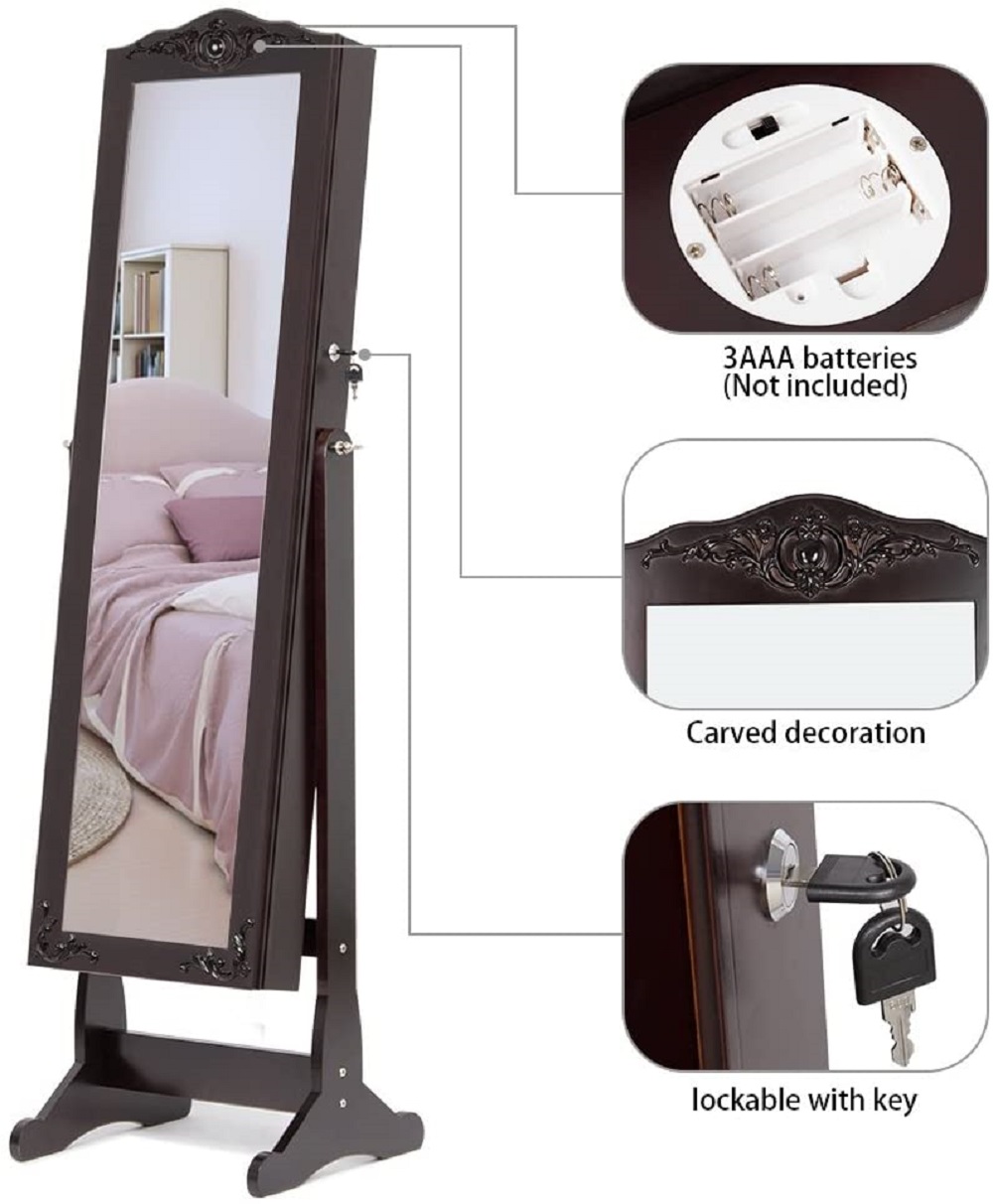 [LED Lights & Secured Storage]: Equipped with LED lights that are powered by 3 AAA batters, this mirror provides the essential brightness to help perfect your outfit. Lighting in a room is very important because it provides customers clarity and precision needed to dress up. Also equipped with a secured storage compartment, customers are able to lock their storage to prevent thefts from stealing their beautiful and expensive jewelry or other accessories. [Full-Length Mirrors]: Embedded with a 44 long mirror, this jewelry armoire mirror is designed with 4 adjustable tilted angles that will provide a wide field of vision to guarantee you look absolute best from head to toe. It is important to have a mirror that can provide a wide field of vision because it allows customers to spot flaws in their outfits or hairdo. [Large Storage Capacity]: It is important for individuals to have large storage spaces for their accessories and this mirror provides it. This mirror has 96 earring hanging slots, 78 ring holes, 36 necklace and bracelet hooks, 4 shelves, 1 pouch, 1 scarf rod, and 2 bottom drawers. This accessory storage will not damage jewelry when the door is closed. [High-Quality Material]: Made with sturdy and durable environmental MDF panels, along with smooth surfaces; This jewelry armoire has good mothproof effects with explosion-proof real glass mirror and soft velvet lining. The material used for this mirror is very durable and is expected to last a lifetime. [Easy to Assemble]: This jewelry cabinet frame is pre-assembled and you will only need to assemble the legs. This jewelry organizer is exquisite, gorgeous, and attractive. No hassle, no trouble. Specification: Overall Dimensions: 59.4″ x 16.1″ x 14.5″ Mirror Size: 44.1″ x 10.6″ Color: Dark Brown Material: MDF, panel with painting, glass, velvet Volume: Includes 96 earring hanging slots, 78 ring holes, 36 necklace and bracelet hooks, 4 shelves, 1 pouch, 1 scarf rod, and 2 bottom drawers Assembly: Easy assembly required. Product Content: 1 x Jewelry Cabinet Instructions