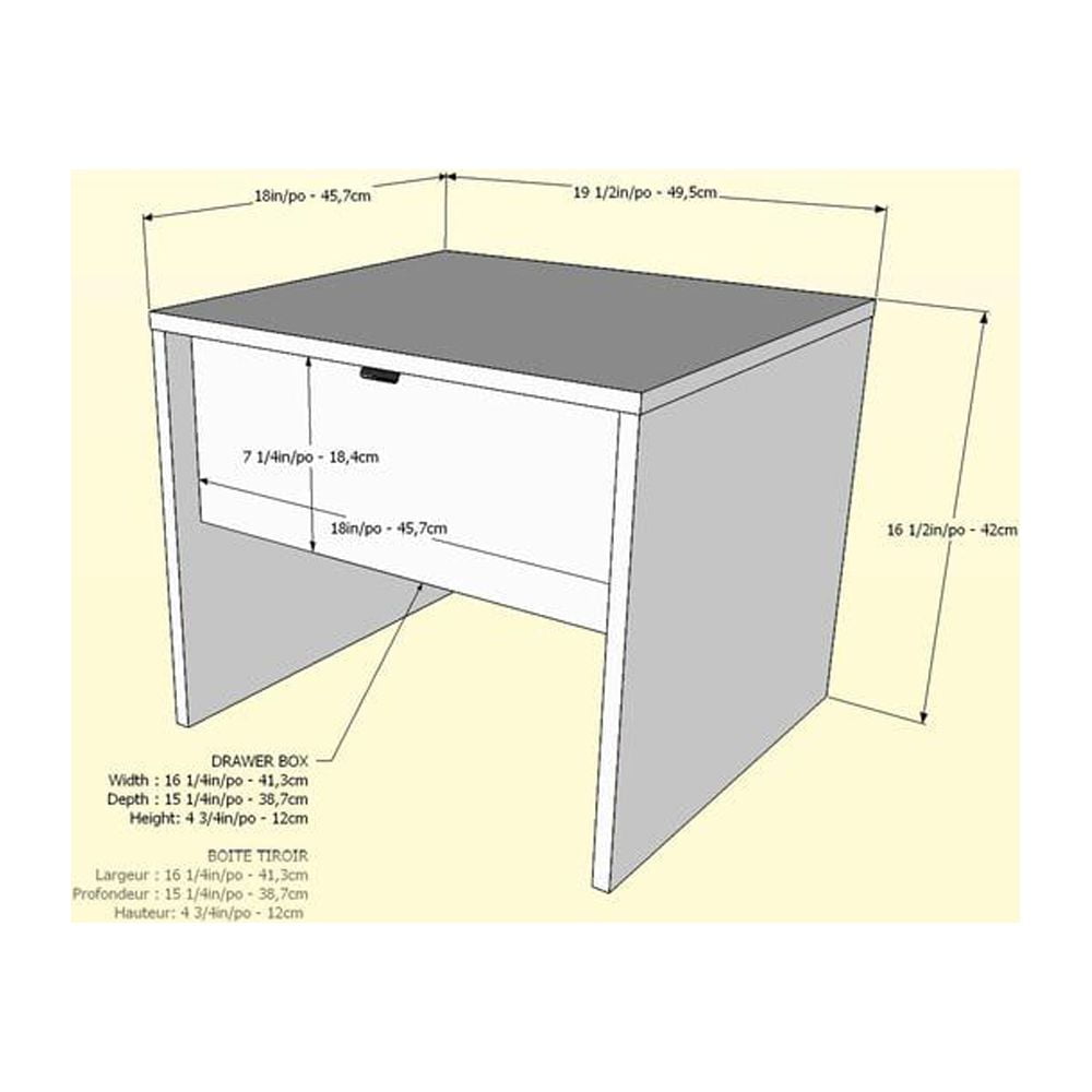1 drawer on solid metal slides Scratch, stain and water resistant melamine top panel Concealed metal handle for a design that’s sleek and easy to use White and walnut finish Constructed from engineered wood Assembled dimensions: 19.75 in. W x 18 in. D x 16.625 in. H Box dimensions: 24.5 in. W x 19 in. D x 4.25 in. H
