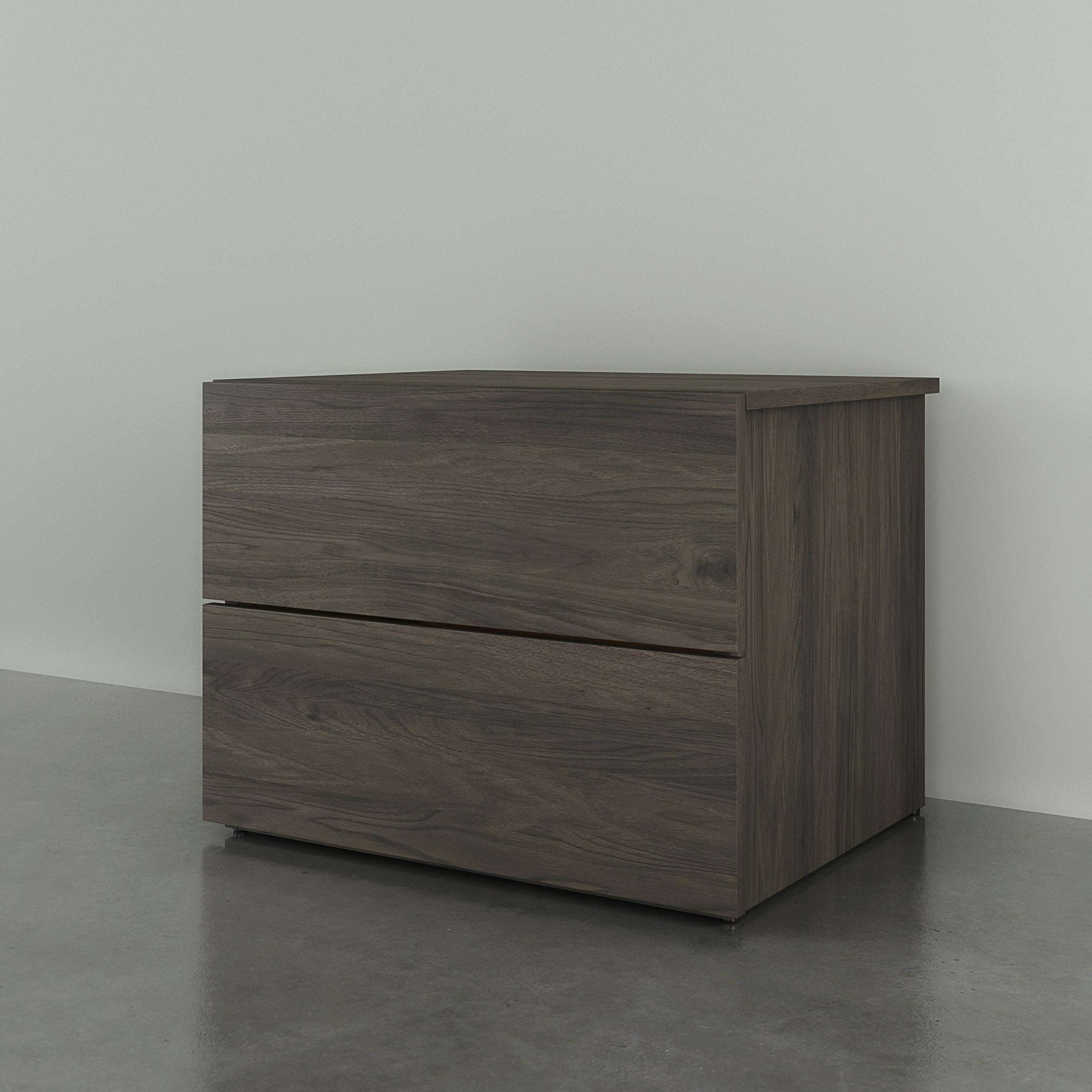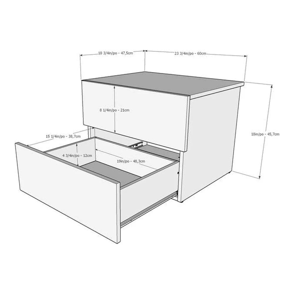 2 convenient storage drawers on solid metal slides Modern flair and design Bark grey laminate finish Constructed from engineered wood Assembled dimensions: 23.75 in. W x 18.75 in. D x 18 in. H Box dimensions: 28 in. W x 19.5 in. D x 5.5 in. H