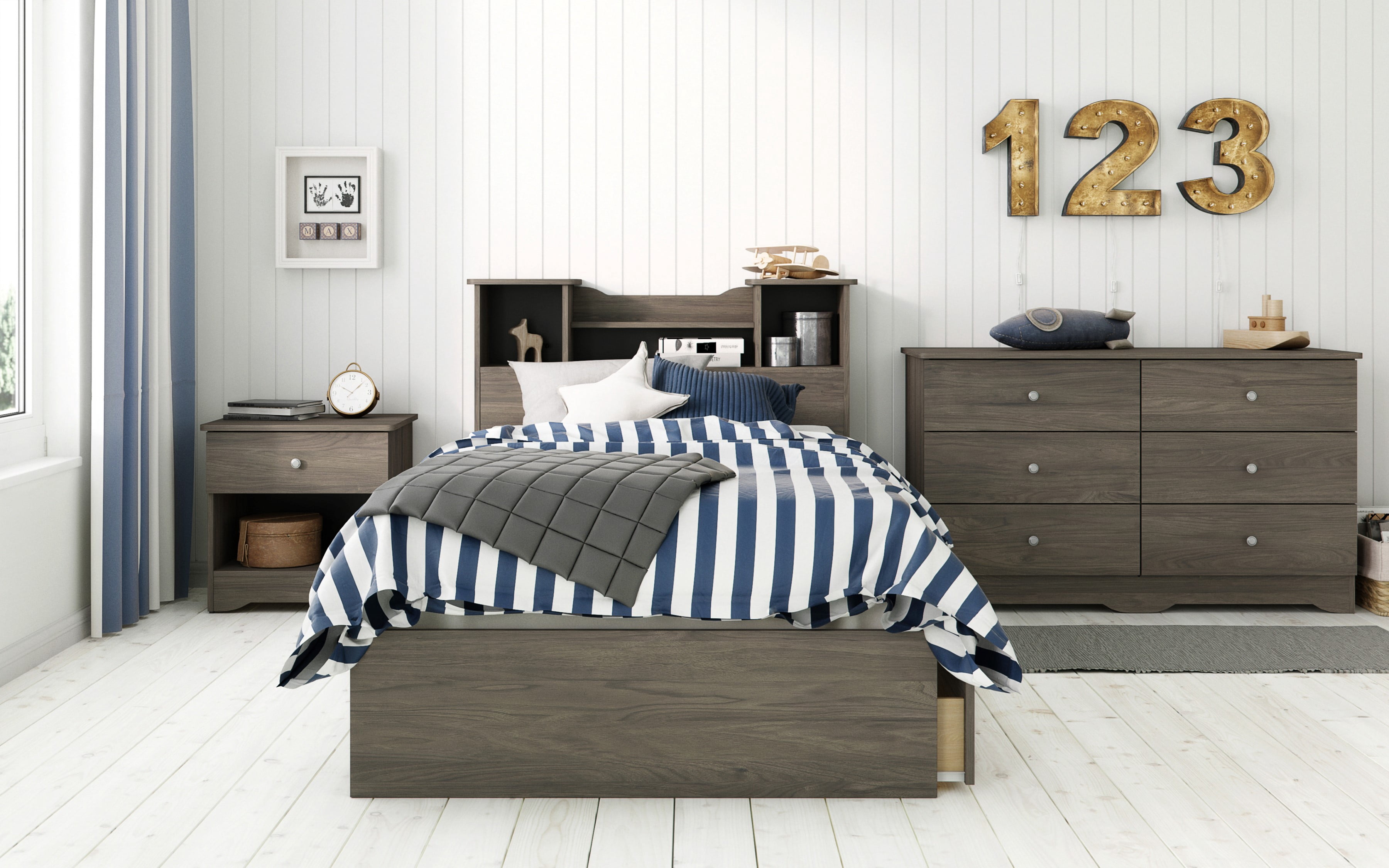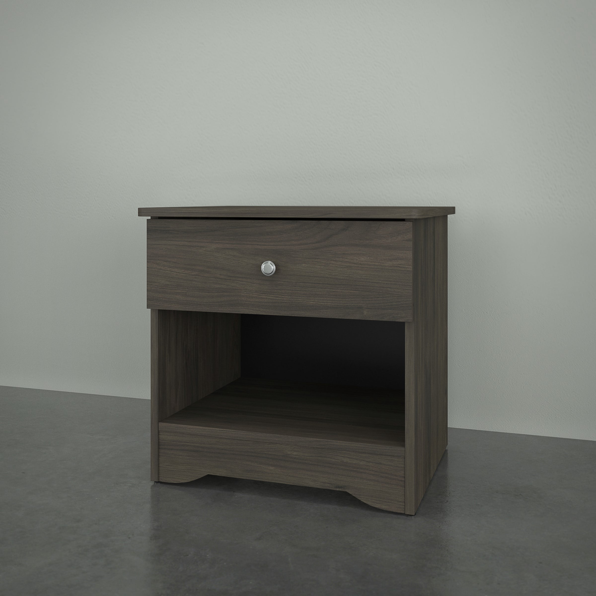 The Pocono 1-drawer modern nightstand is offered in a trendy bark grey finish. Its convenient drawer is mounted on solid metal slides and provides handy storage when you’re in bed, plus the open space at the bottom gives an airy feel to your decor.