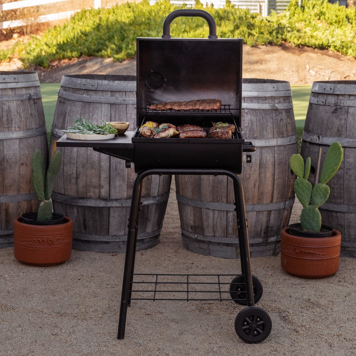 There’s a grillmaster inside all of us. Unleash yours with the Nexgrill 17.5″ Charcoal Barrel Grill with Table Cart, designed to handle anything you can throw at it, or on it. Crafted with precision and passion, the Nexgrill 17.5” Outdoor Grills & Smokers is more than just a grill; it’s a portal to the realm of culinary mastery. From the sizzle of perfectly seared steaks to the aroma of slow-smoked barbecue, this outdoor grill empowers you to explore the endless possibilities of outdoor cooking. Its durable construction and innovative design ensure consistent performance, whether you’re grilling for a crowd or hosting an intimate gathering. The spacious cooking surface provides ample room to unleash your creativity, while the adjustable air vents allow you to fine-tune the temperature for optimal results every time. With its solid barrel shape and sleek black finish, this grill is as stylish as it is functional, making it the centerpiece of any backyard barbecue. So fire up your imagination, gather your friends and family, and let the Nexgrill 17.5” Charcoal Grill elevate your outdoor cooking experience to new heights. With its user-friendly features and exceptional versatility, this BBQ grill charcoal is the perfect companion for both novice cooks and seasoned grillmasters alike. Whether you’re grilling up burgers for a summer cookout or smoking a brisket for a fall tailgate, the Nexgrill 17.5” Charcoal Barrel BBQ Grill delivers delicious results every time. Its durable construction and intuitive design make it easy to use and maintain, while its compact size makes it ideal for smaller outdoor spaces. Unlock your grilling potential with the Nexgrill 17.5” Smoker Grill today and become the backyard BBQ hero you were always meant to be. Don’t let limited space stop you from enjoying mouth-watering meals. The Nexgrill 17.5” Charcoal Barrel Grill with Side Shelf is compact yet robust, making it the perfect choice for those who want amazing taste without sacrificing space or flavor. Get yours today and start grilling with ease!