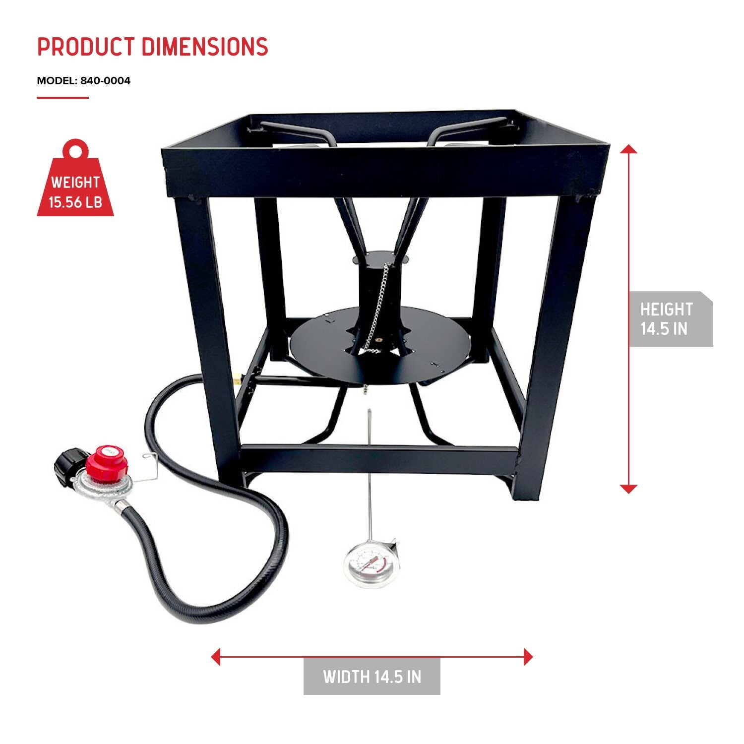 【DURABLE WELDED STEEL STAND】Fully welded steel ensures strength and stability. 【POWERFUL CAST IRON BURNER】10-inch burner ensures efficient, even heat. 【SUPPORTS LARGE STOCKPOTS】 Sturdy 14.5″ frame holds 30-100 QT pots securely. 【DEPENDABLE MANUAL IGNITION】Simple, reliable lighting with no electricity needed 【ALL-IN-ONE KIT】Includes a CSA-approved regulator, thermometer, and lighting rod 【88,000 BTU】Provides fast, efficient heat for boiling, frying, and searing.