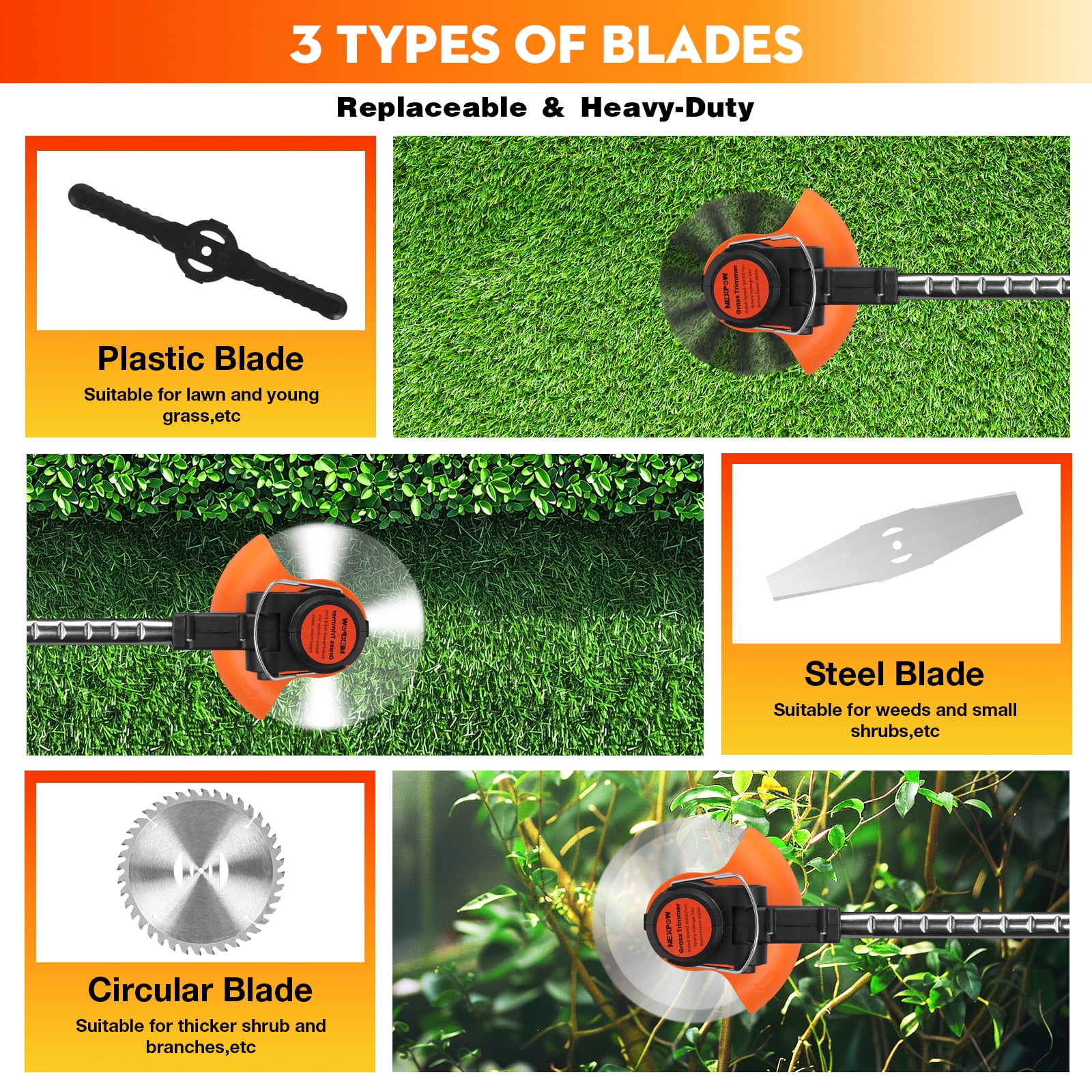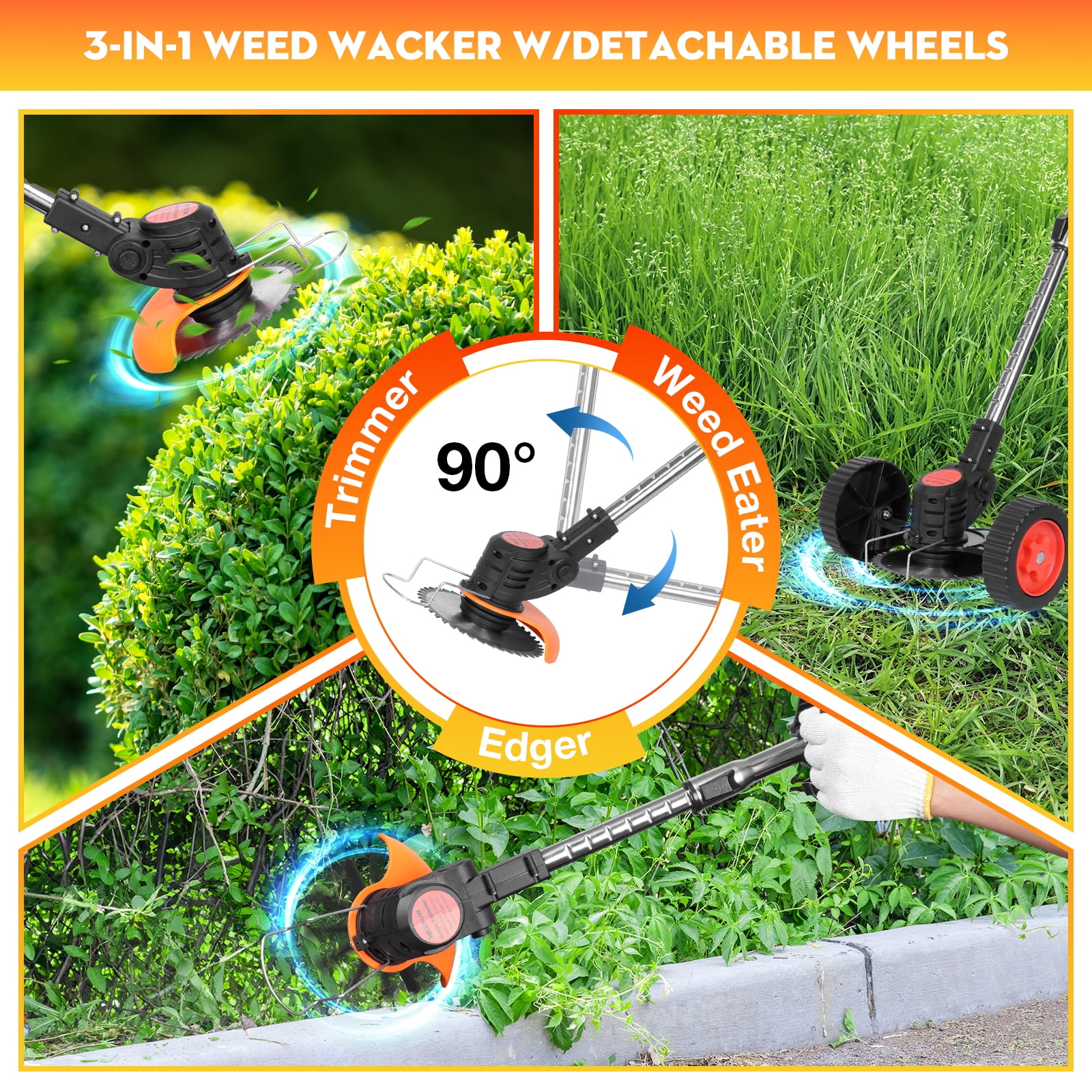 ????3-in-1 Functionality: This lawn eater combines a cordless lawn mower, weed eater, and lawn edger into one convenient tool. It can easily switch from a lawn mower to a wheeled weeder, making it suitable for various lawn maintenance tasks. ????Efficient Motor & Large Capacity Batteries: The electric lawn mower features an upgraded high-power pure copper motor with a no-load speed of 18,000 RPM, providing powerful performance for lawn mowing. It comes with two 2.0Ah high-capacity lithium batteries, offering long runtime of 240-360 minutes on a full charge, depending on workload. ????Telescopic & Foldable Design: The telescopic pole of the weeder can be adjusted from 36.3 to 48 inches, catering to users of different heights and eliminating the need to bend over during mowing. The handle is ergonomically designed for comfortable and balanced control. It’s lightweight at just 3.9 pounds and features removable sliding training wheels for easy maneuverability. ????Safe and Practical Features: The lawn mower includes a safety lock button to prevent accidental starting. You must press the safety button and switch simultaneously to start the mower. The cutting head angle is adjustable from 0-90 degrees, allowing easy access to all lawn edges, even on slopes or in narrow spaces. ????4 Types of Cutting Blades: With four interchangeable cutting blades, including a saw blade for trimming branches, a metal blade for dense weeds and hedges, an S-metal blade for plants and small brushes, and a weed string for tall grass, this tool can handle various weeding tasks effectively. It can also be converted into a wheeled weeder for added versatility.