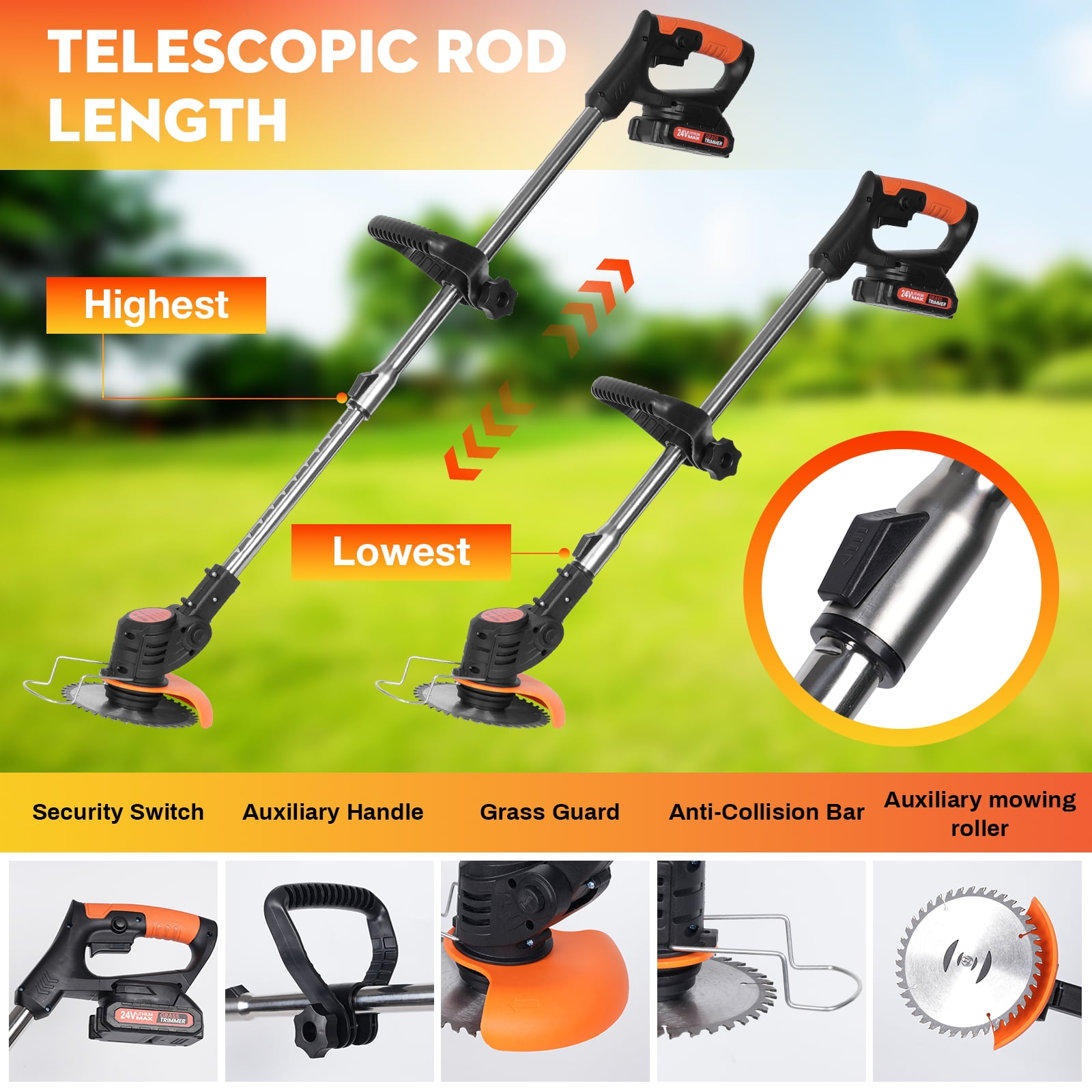 Introducing the NEXPOW 2025 Upgraded Battery-Powered Lawn Mower, a multifunctional and highly efficient tool designed for mowing, edging, and brush cutting with precision and ease. Engineered with a high-power 650W pure copper motor, this trimmer operates at an impressive 18,000 RPM, ensuring optimal performance for tackling even the most stubborn weeds and overgrown grass. Unlike traditional gas-powered or corded trimmers, this wire-free, battery-operated design provides enhanced mobility and convenience, making lawn maintenance effortless. Equipped with two powerful 24V 4000mAh lithium-ion batteries, this mower offers 4 to 6 hours of continuous operation on a single charge, with each battery requiring only 1 to 2 hours to reach full capacity. The inclusion of a one-touch telescopic pole, adjustable between 36.3 and 48 inches, allows users of varying heights to achieve maximum comfort and control. Additionally, the adjustable brushcutter head, which tilts between 0° and 90°, provides flexibility for trimming hard-to-reach areas, including tight corners and edges. For safety and ease of use, the mower features a dual-switch mechanism that prevents accidental activation, ensuring a secure and user-friendly experience. The lightweight yet durable construction, made from a blend of steel, aluminum, and high-quality plastic, ensures durability while maintaining a manageable weight of only 3.9 lbs, allowing for extended use without fatigue. Product Specifications: Material: Steel + Aluminum + Plastic Battery: 24V 2000mAh Lithium-ion (Rechargeable) Motor Power: 650W Pure Copper Motor Speed: 18,000 RPM Cutting Diameter: Approx. 150mm (5.9 inches) Mower Cutting Width: 6 inches Mower Cutting Sample: 10 inches Mower Line Diameter: 0.095 inches Unextended Length: 920mm (36.3 inches) Extended Length: 1220mm (48 inches) Packaging Dimensions: 34.65 x 6.3 x 3.74 inches Weight: 3.9 lbs Comprehensive Package Includes: ✔ 1x Lawn Trimmer – The powerful core of your lawn maintenance routine ✔ 2x 24V Rechargeable Lithium-Ion Batteries – For extended operation time ✔ 1x Charger – Fast and efficient charging solution ✔ 2x 6-Inch Saw Blades – Ideal for cutting thick brush and overgrowth ✔ 2x Metal Blades – Durable blades for heavy-duty trimming ✔ 5x Plastic Blades – Lightweight and flexible for precision cutting ✔ 2x Mower Heads – Enhancing the versatility of your lawn care tool ✔ 1x Anti-Collision Steel Ring – Added protection during operation ✔ 1x Lawn Guard – Shields debris for safer use ✔ 1x Wrench Socket – A convenient tool for adjustments and maintenance ✔ 1x Wheel Attachment – For smooth and effortless maneuverability ✔ 1x Pair of Anti-Slip Gloves – Ensures a firm grip and comfort during use ✔ 1x Safety Glasses – Protects your eyes from debris and flying particles ✔ 1x User Manual – Easy-to-follow guide for assembly and operation With its advanced features, durable construction, and user-friendly design, the NEXPOW 2024 Battery-Powered Lawn Mower is the ultimate tool for homeowners and gardening enthusiasts looking to achieve a perfectly manicured lawn. Whether you need to trim edges, cut through thick grass, or clear out stubborn brush, this all-in-one solution makes yard work a breeze. Upgrade your lawn care experience today with NEXPOW—where power meets convenience!