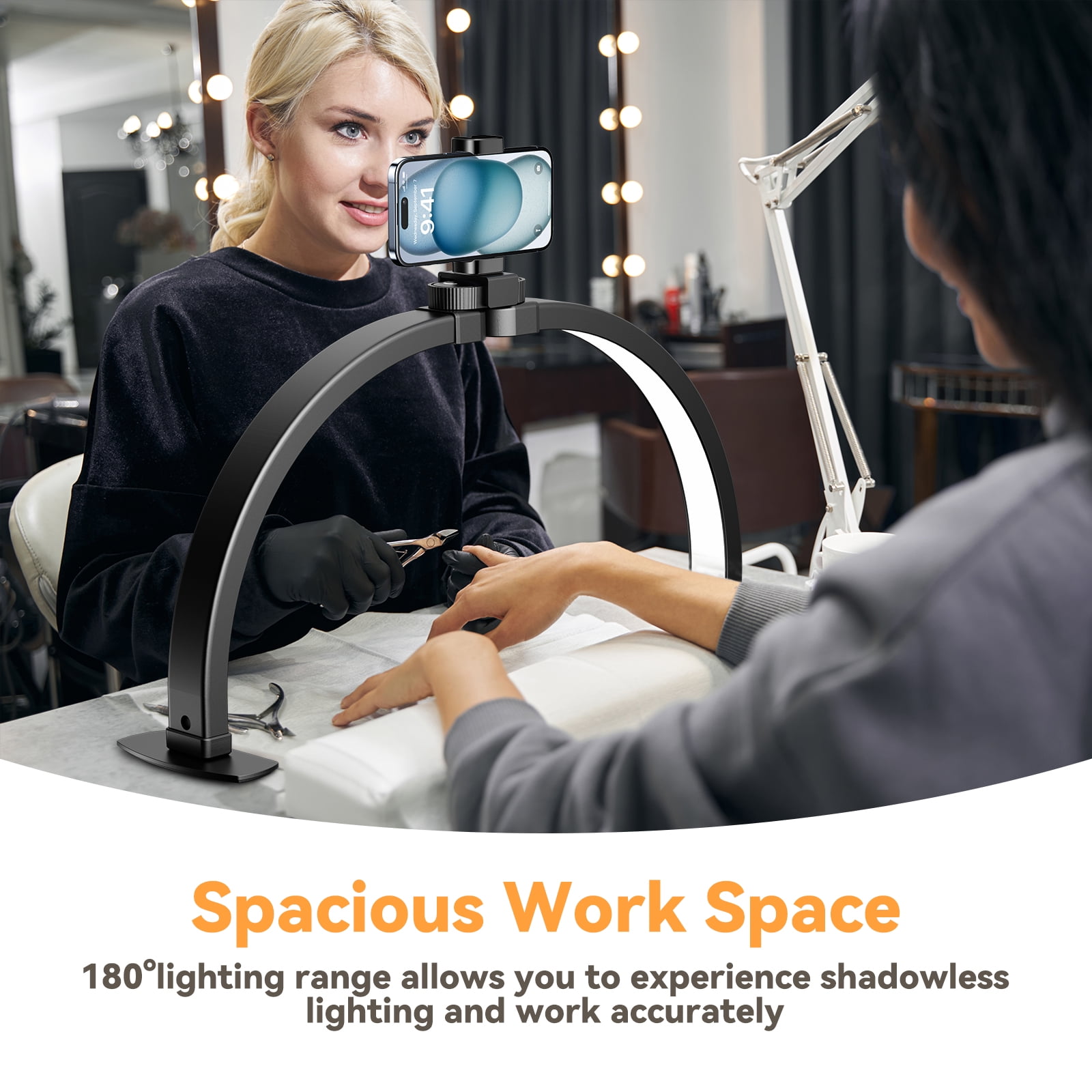 NEXPURE Half Moon Light for Nail Desk, Foldable Half Moon Desk Lamp with Phone Holder for Beginner – Arch Nail Tech Light with 3 Color Modes & 10 Brightness for Manicure Salon