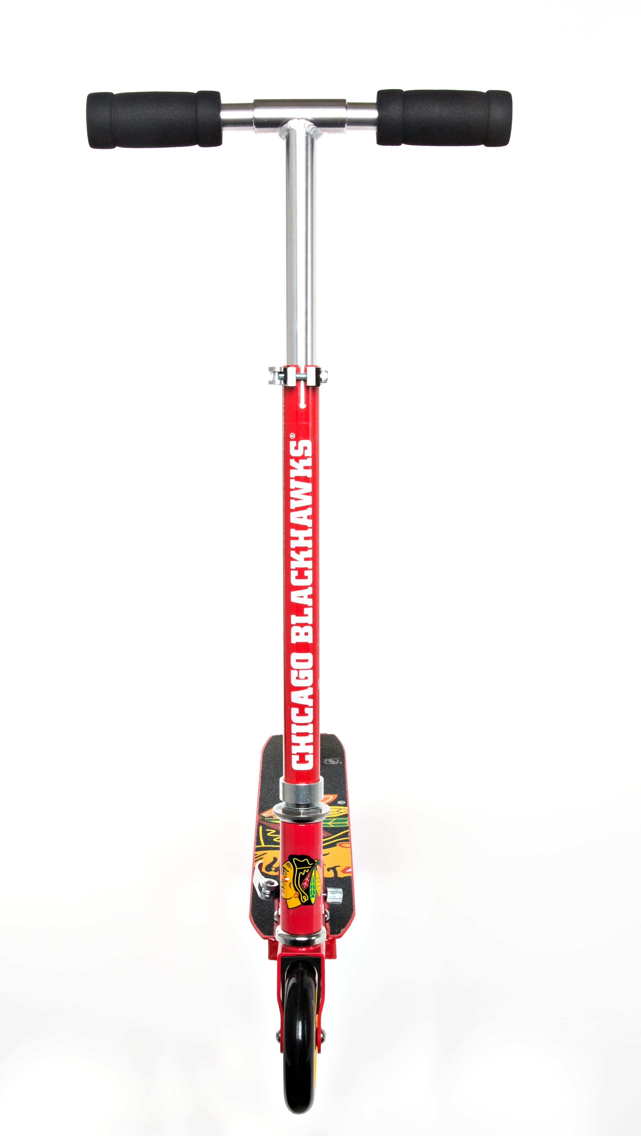 Custom Chicago Blackhawks designed scooter is engineered with 100% lightweight aluminum for a durable and smooth ride High performance 120mm Polyurethane wheels in team colors that deliver shock absorbing technology along with premium ABEC 5 bearings Quick-lock folding mechanism for rapid assembly and easy storage Blackhawks scooter includes 3 adjustable handlebar height settings and durable foam grips Rear footbrake for reliable and quick stopping power Recommended for kids ages 5+ and maximum rider weight of 150lbs.