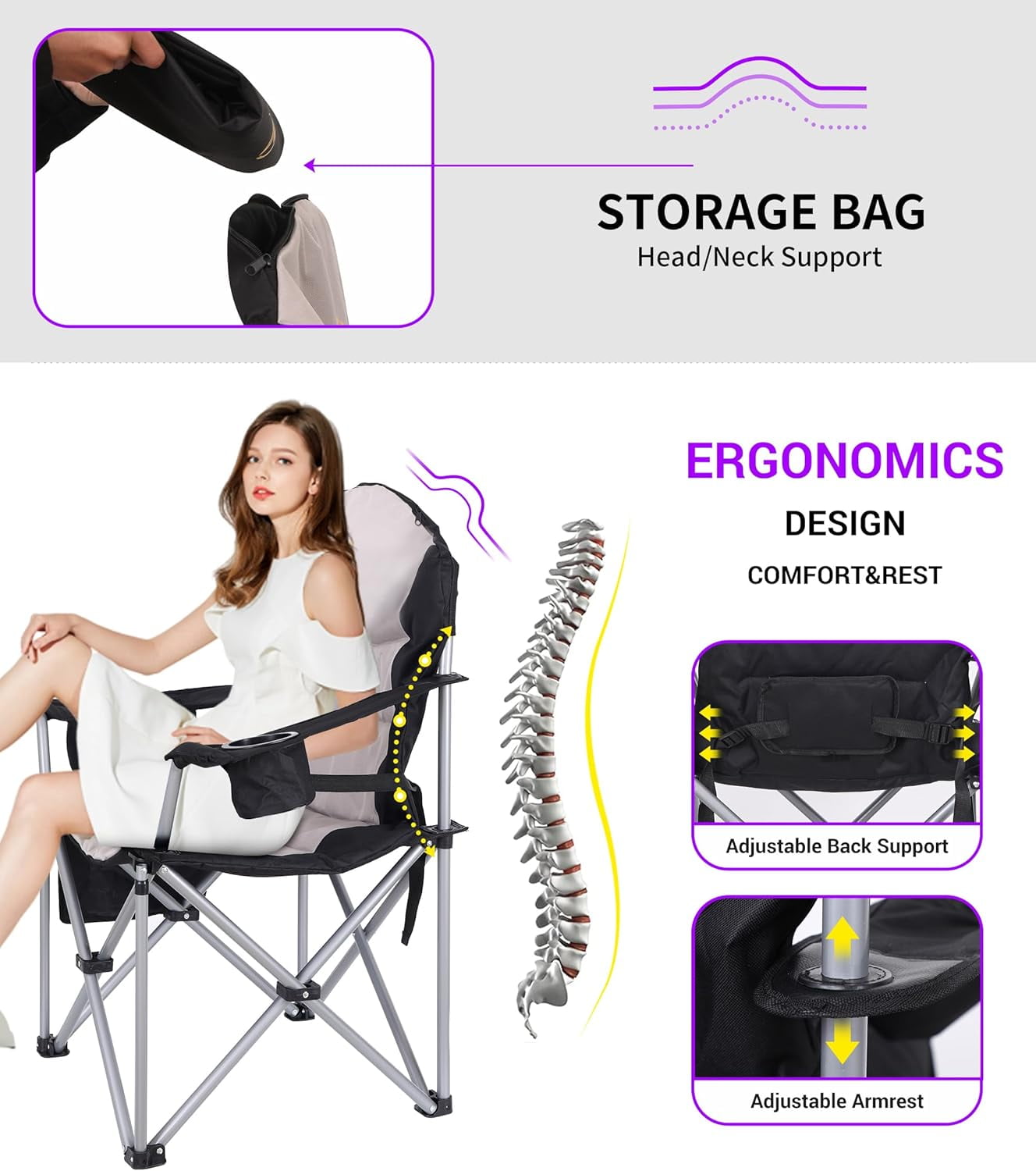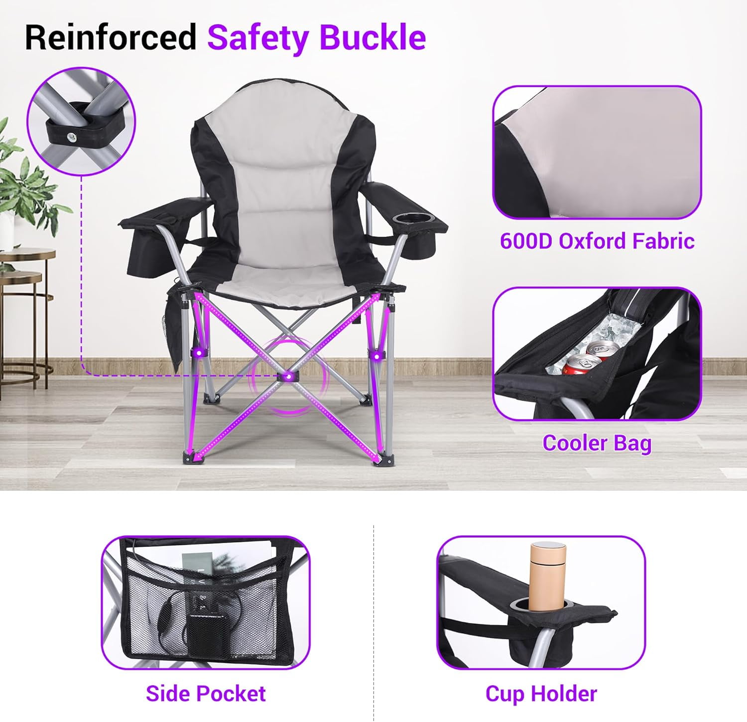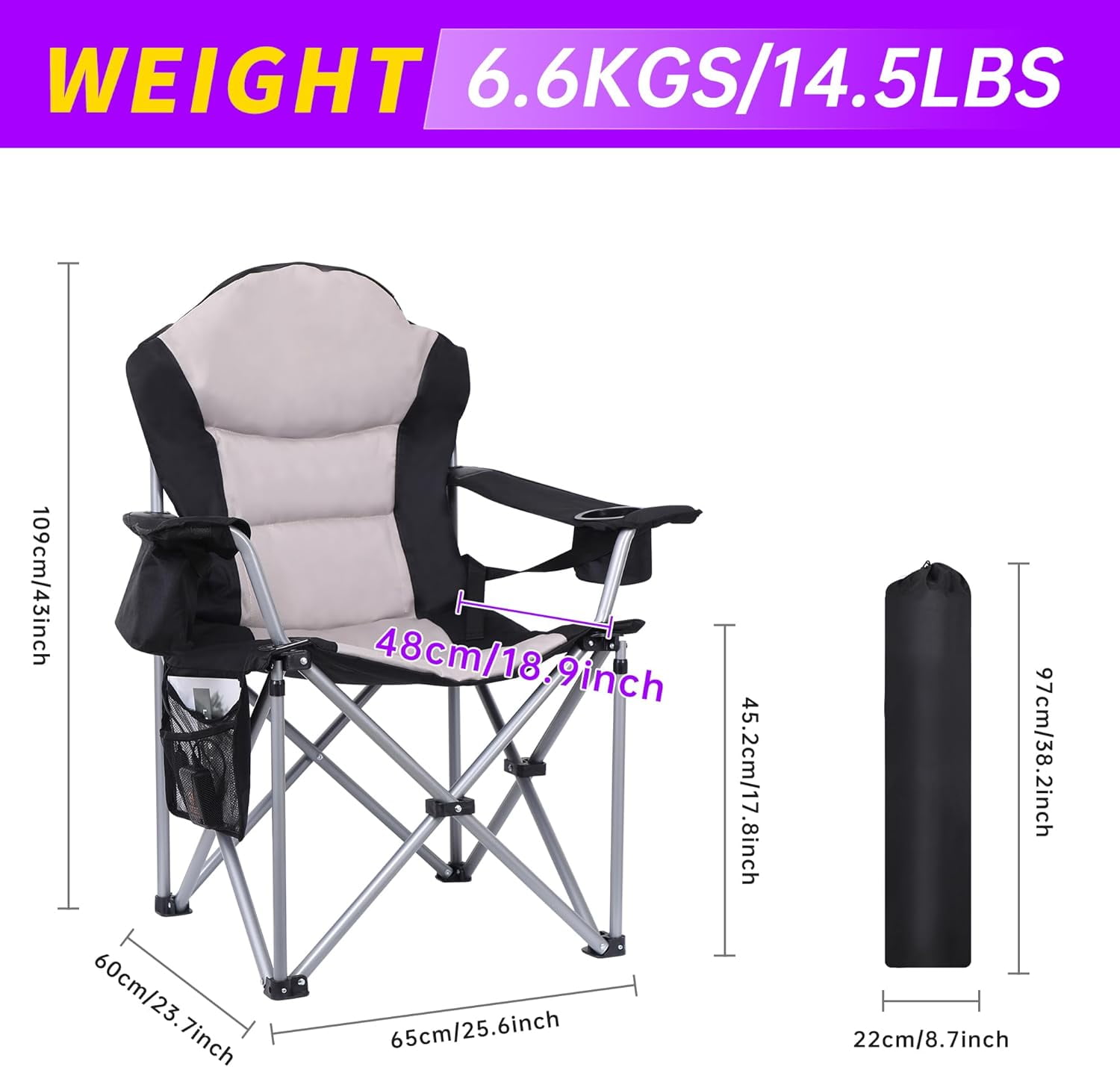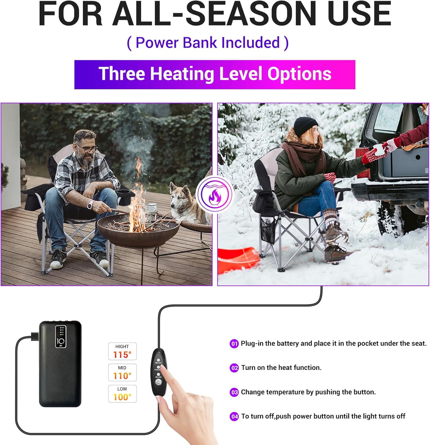Nice C Heated Adjustable Camping Chair with Cooler, Gray QUICK HEATING-WARM YOUR DAY: The Nice C heated chair provides you with comfortable seating anywhere and anytime. Bring this to camping or parks where floors are dirty and uncomfortable. It will keep you warm during the cold seasons while you enjoy the games. It’s made of bending-resistant titanium nanometer heating material, which is fast heating, safe and stable EXTRA WIDE & THICK PAD-UNRIVALED COMFORT: The stadium seat is fitted with extra padding so anywhere you choose to sit will be well cushioned. The extra wide seat even gives you room for Criss Cross Apple Sauce ADJUSTABLE ARMREST & BACK SUPPORT: Made with an orthopedic-recommended ergonomic design that allows you to sit comfortably and relax. The armrest and back support can be adjusted to your needs POWER BANK & INLUSTED COOLER & SIDE POCKETS & CUP HOLDER & CARRY BAG: We have everything for you! Your chair is fully equipped to satisfy you for any occasion. The back zipper compartment provides you extra neck support after putting the carry bag or your accessories in. You can also carry it hands-free by backpacking it INDUSTRIAL GRADE MATERIA: Our stadium/floor seat is made with a heavy-duty alloy steel frame and industrial-grade Oxford 600D durable polyester. It is sturdy and durable but lightweight. This foldable stadium seat sustains weight up to 400 lbs / 181 kg. The polyester is strong and easy to clean