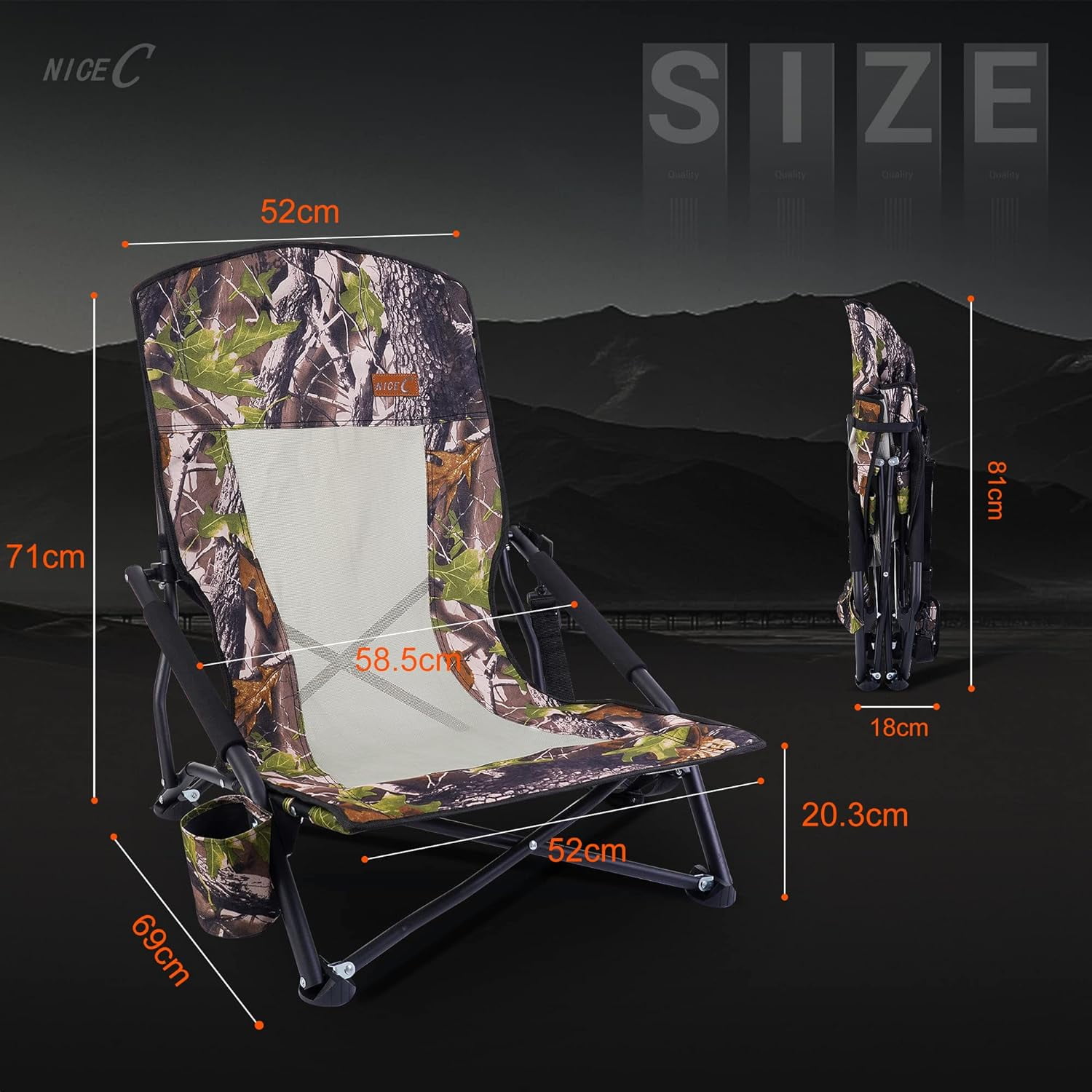 COMFORTABLE & FOLDABLE: Nice C’s hunting/beach chair is made with a breathable and cooling mesh fabric that allows air to flow while you sit. There are arm cushions on the metal arms so you can rest your arms comfortably. Also included is an easy-to-reach cup holder to hold your drinks or personal items. Take this chair with you anywhere: hunting, beach, park, camping, hiking, etc. INDUSTRIAL GRADE MATERIAL: Our chair is made with heavy-duty steel and industrial-grade Oxford polyester mesh. It is sturdy and durable. The lightweight frame and the included carrying case allow you to transport the chair easily. The folding size is only 32”× 7”× 4.5” (L×W×H), so you can store it easily. WEIGHT SUSTAINABILITY: The chair’s heavy-duty frame allows it to sustain weight up to 300 lbs. or 136 kgs. The low seat and anti-sink leg cap designs give the chair a stable structure to hold more weight. Use this chair without worry.