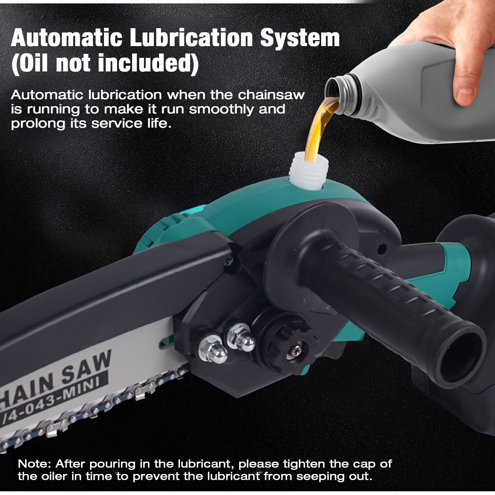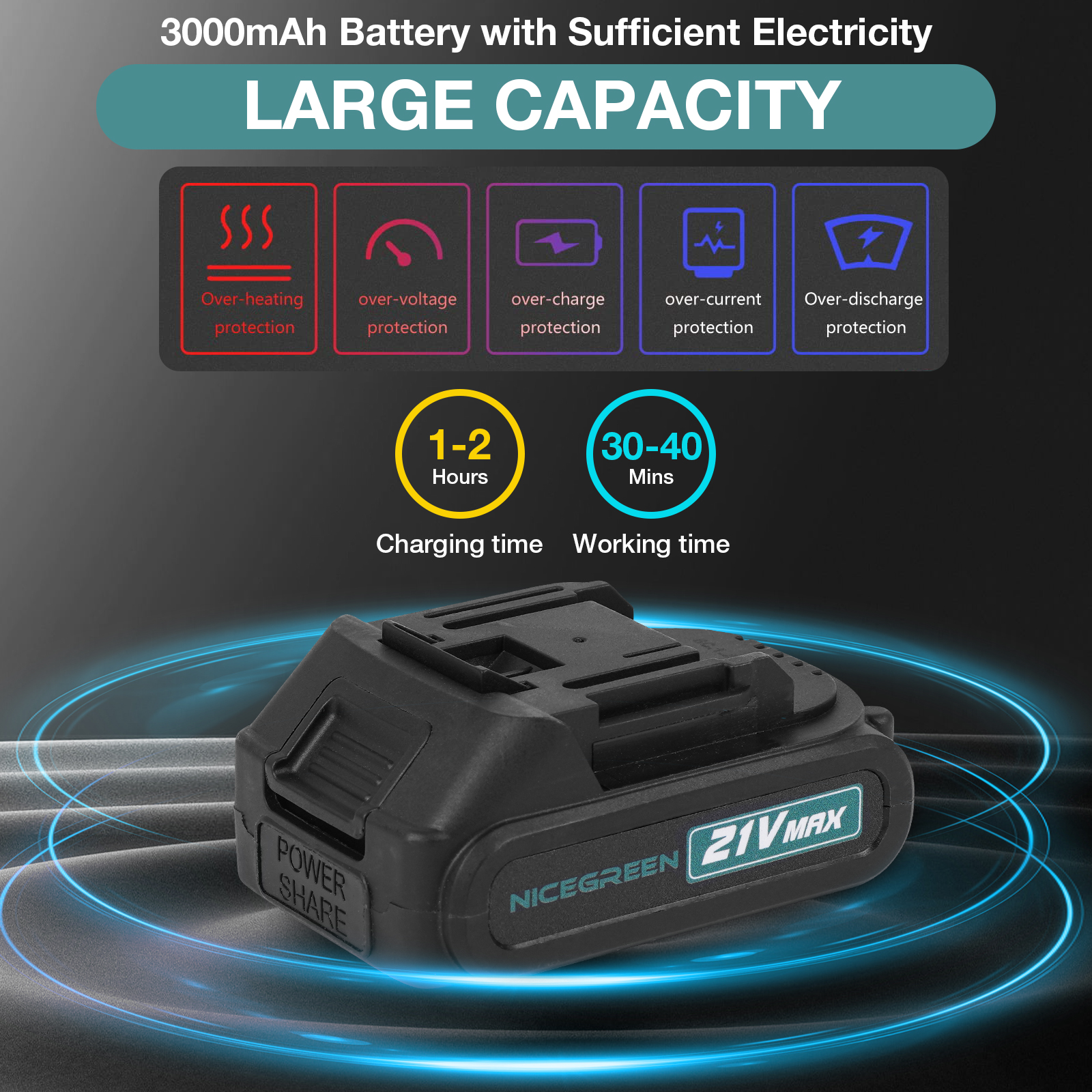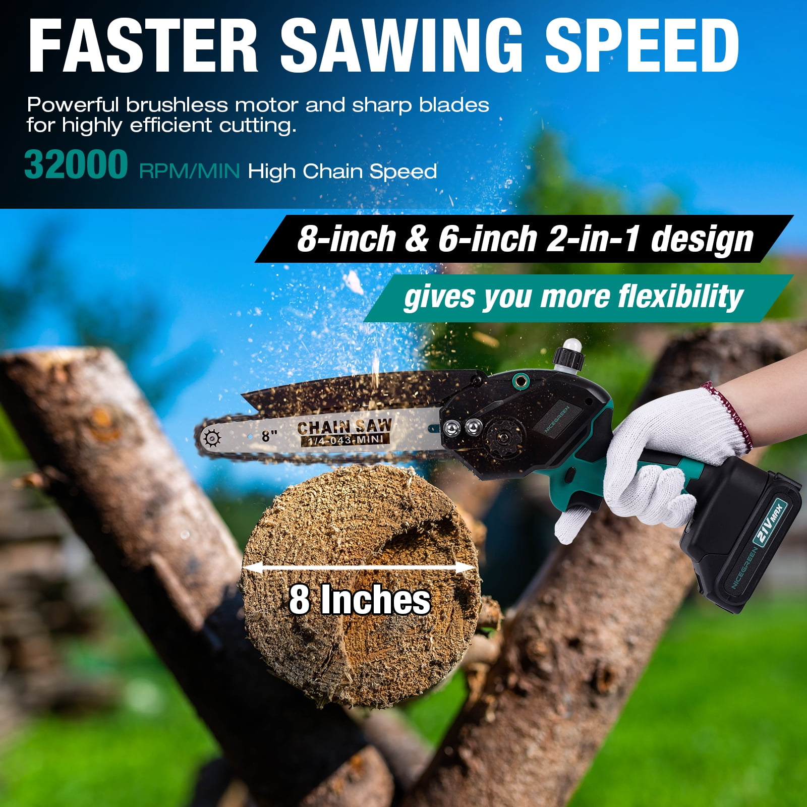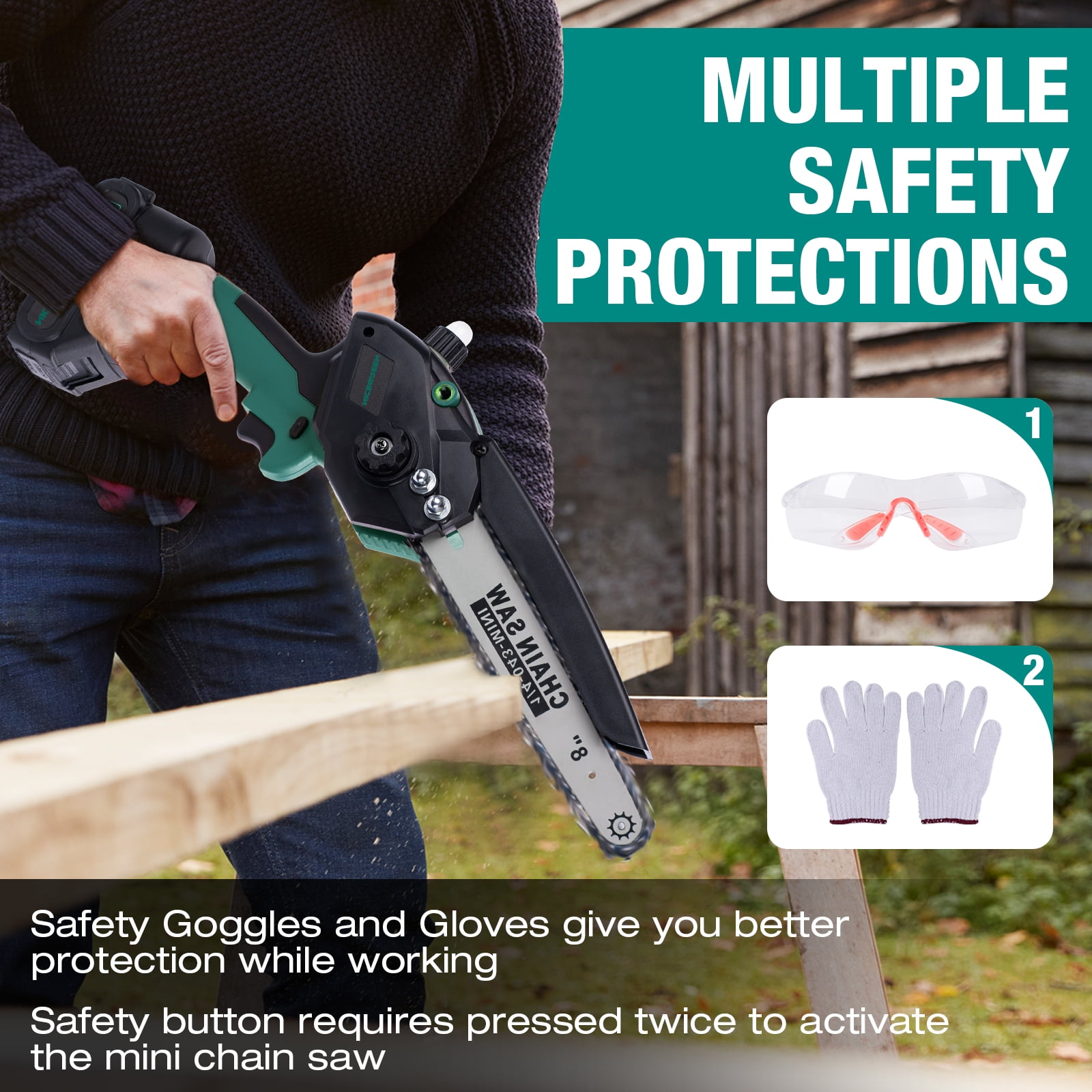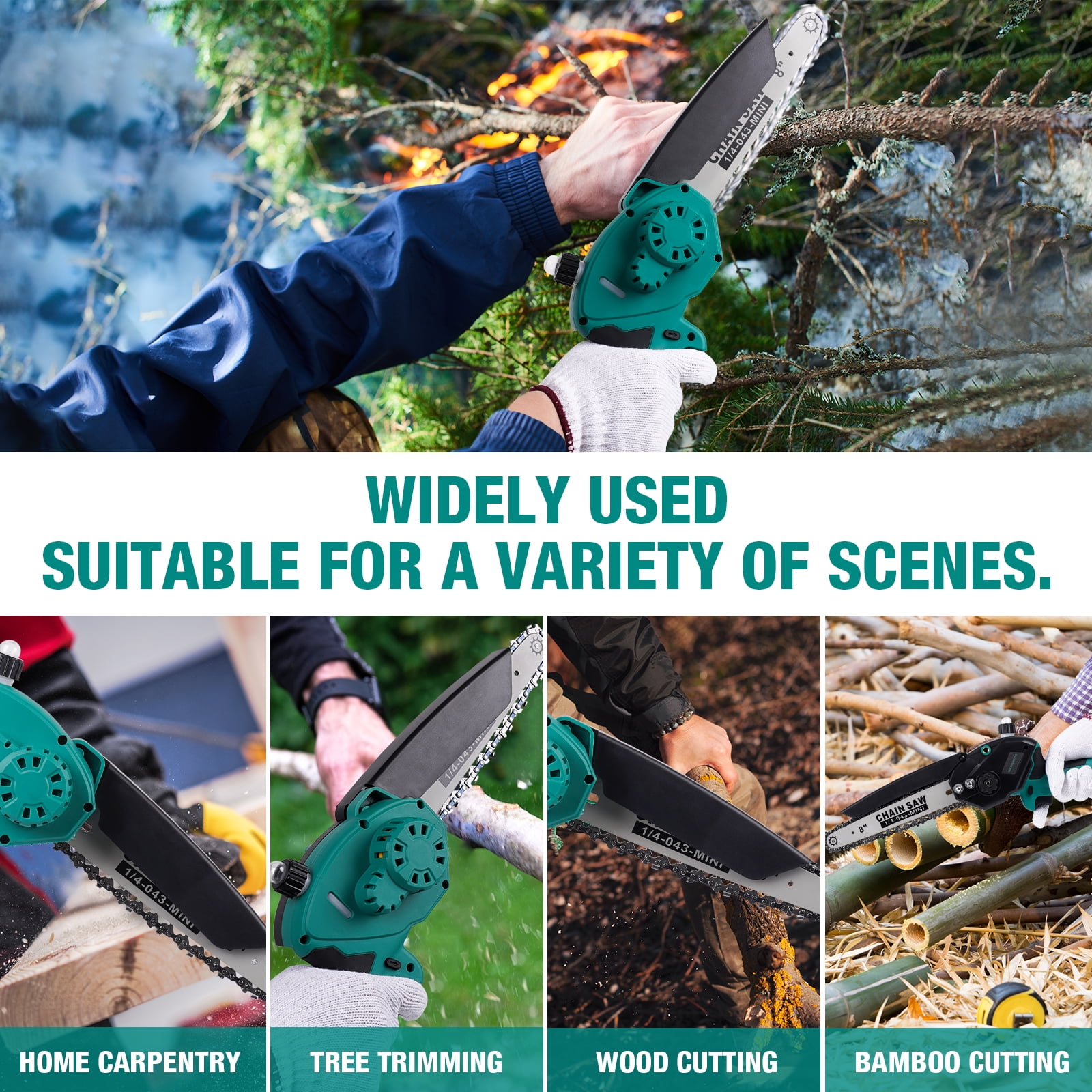 【Assemble in 1s, Cut Branches in 2s】This handheld chainsaw assembles in just one minute, allowing you to effortlessly tackle branches in just 2 seconds. Whether you’re pruning gardens, trimming shrubs, or working on DIY furniture, this chainsaw is perfect for use in gardens, farms, parks, forests, and greenhouses. Designed with convenience in mind, it’s ideal for women, seniors, and first-time users. Enjoy hassle-free cutting with this powerful and efficient tool! 【EFFICIENT & POWERFUL CUTTING】 The NICEGREEN 8″ Mini Chainsaw is powered by a cutting-edge 21V brushless copper motor, delivering rapid chain speeds and increased torque for superior cutting performance. Operating at an impressive 19.2 ft/sec, this cordless chainsaw slices through branches effortlessly. Featuring a self-overload and temperature protection system, it significantly extends battery life for prolonged use. 【LIGHTWEIGHT & ONE-HAND OPERATION】Weighing only 2.6 lbs (including the battery) and measuring 15.4 inches, this compact mini electric chainsaw is designed for easy one-handed operation. Its ergonomic non-slip handle provides a comfortable grip, minimizing fatigue—even during extended use. This greatly reduces strain for outdoor workers and makes tasks easier for seniors! 【HIGH-CAPACITY RECHARGEABLE BATTERY】 Experience powerful performance with our 21V cordless chainsaw, powered by two removable and rechargeable 1500mAh lithium-ion batteries. Together, these two batteries provide up to 60-80 minutes of continuous use on a full charge, making them ideal for all your cutting tasks. Plus, our advanced fast-charging system ensures that both batteries are fully charged in just 1-2 hours, so you can get back to work without missing a beat. Stay prepared for every job with this reliable and efficient tool! 【SERVICE】 We stand by the quality of our product. If you encounter any quality issues or have questions about your mini cordless chainsaw during everyday use, please reach out to us anytime—we’re always here to help! Mini Chainsaw Cordless Perfect Tool for Dad, Mom, Friends, Husband, DIYer. ✅Powerful & Efficient: Brushless motor for longer lifespan and better performance. ✅Versatile Cutting Options: Interchangeable 6″/8″guide plates for various cutting needs. ✅Enhanced Safety: Built-in battery protection prevents overheating. ✅Security Lock: Requires simultaneous press of safety lock and start button to prevent accidental activation ✅Ergonomic Design: Lightweight and easy to maneuver for comfortable handling. ✅Protective Baffles: Shields against wood splashes for safer cutting. ✅Protective Goggles: Safeguards eyes from sawdust and flying debris. ✅Anti-Cut Gloves: Protects hands from debris and sharp edges. ✅Ergonomic Handle: Comfortable, non-slip grip for better control. Package Includes: Cordless Mini Chainsaw 21V Lithium Batteries x 2 8-Inch Chain Plate & 8-Inch Chain 6-Inch Chain Plate & 6-Inch Chain Oil Jug Charge Adapter 2-in-1 Wrench Screwdriver Protective Glove Protection Goggles User Manual Chainsaw Packing Box Specifications: Voltage: 110-240V, 50-60Hz Battery Type: 21V 1500mAh Lithium Battery