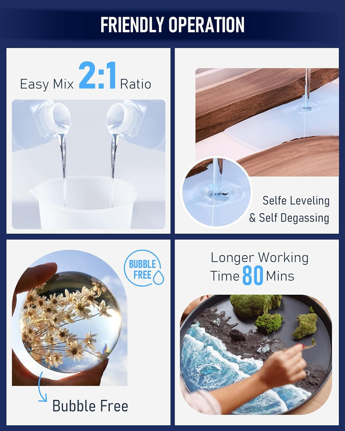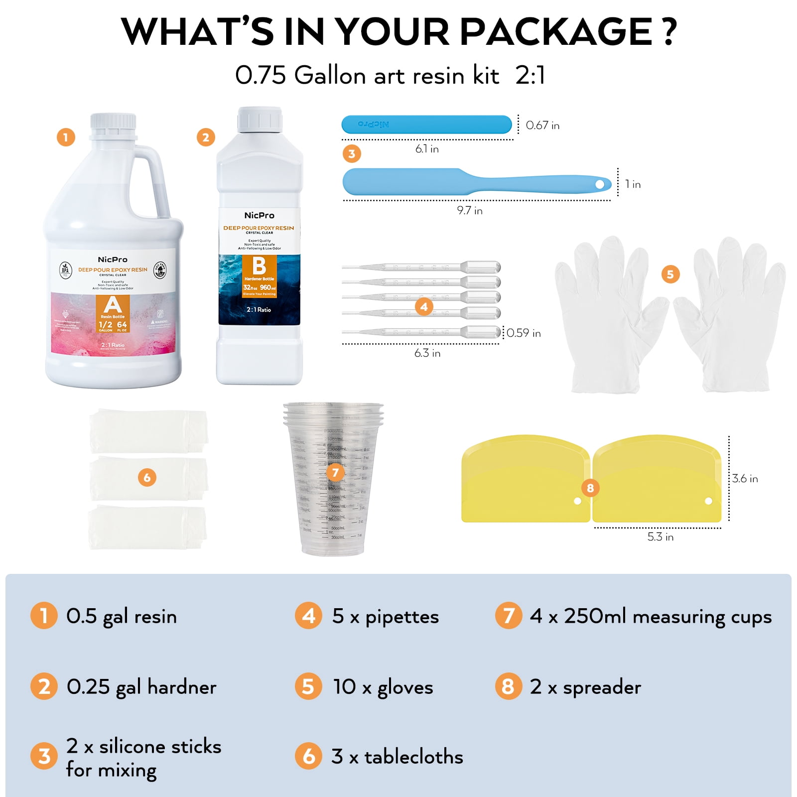 EVERYTHING YOU NEED INCLUDED – 64oz resin + 32oz hardener with BONUS items so you can get started right away: 4 x 250ml measuring cups with spouts, 2 x silicone sticks for mixing, 1 x gloves, 3 x tablecloths, 2 x spreader and 5 x pipettes to ensure an even finish. 2:1 Mixture Resin & Higher Hardness: easy to by volume ratio,resin A to hardener B is 2 :1. After curing, the hardness of this resin is higher, more heat resistant to prevent warping, more wear-resistant and not easy to break. Longer working time (4 -6 hours). Deep Pour Epoxy Resin Up To 2 Inch: Nicpro epoxy resin is able to fill gaps more than 2 inches thick at a time.Specially for epoxy resin wood filler applications,such as tray, coaster, wood, river table. Carefully and thoroughly avoiding forming bubbles, 36-72 hours curing + 24 hours demold (according to your project). This Deep pour epoxy resin features self leveling, self degassing, low odor, anti-scratch and crystal clear, high gloss, yellow resistant, long lasting. Perfect for mica powder, deep resin molds, alcohol ink, resin pigment. 100% RISK FREE PURCHASE: If you are not satisfied with Nicpro deep pour epoxy resin, we’re very happy to either provide a no-questions-asked Refund or Replacement. Order today risk free!