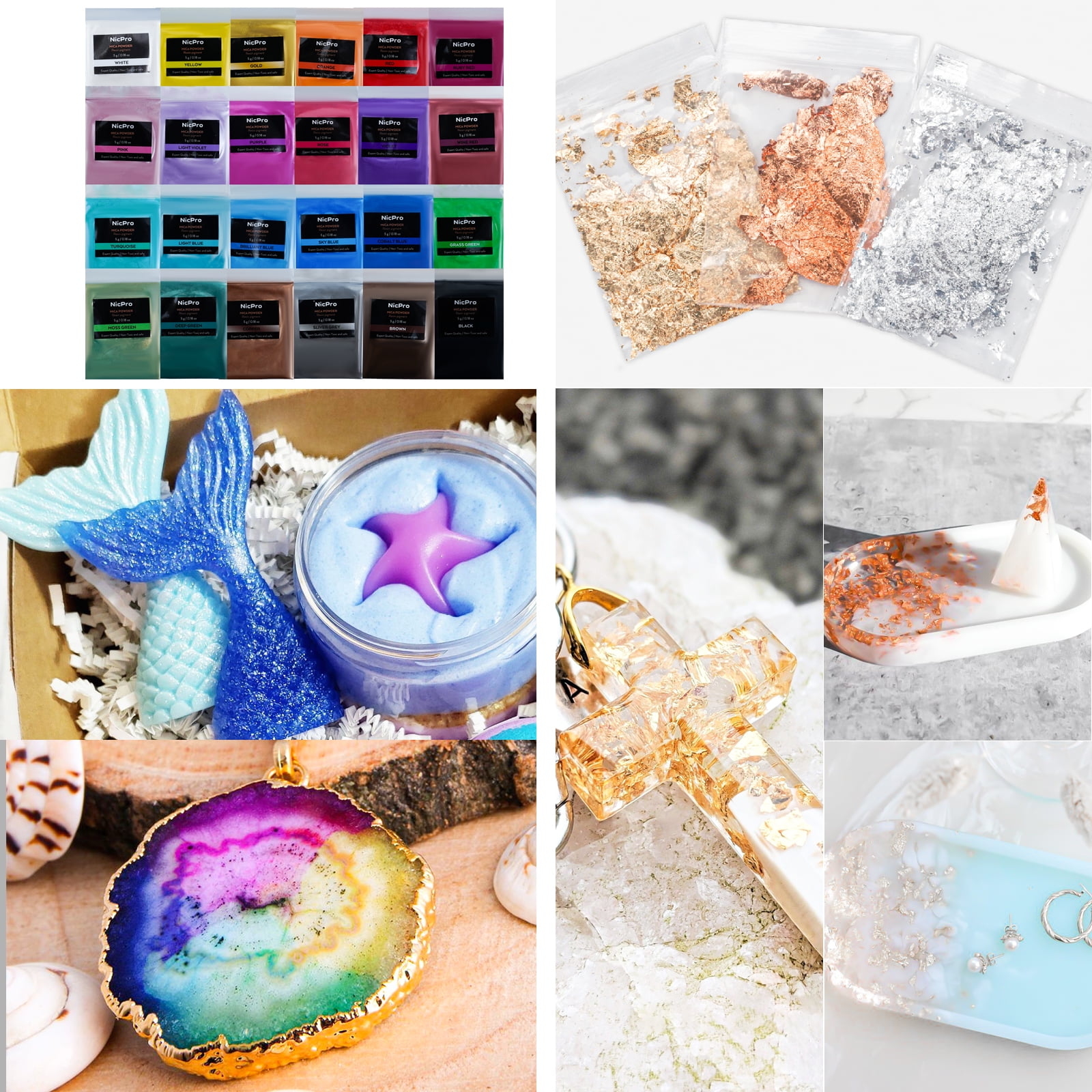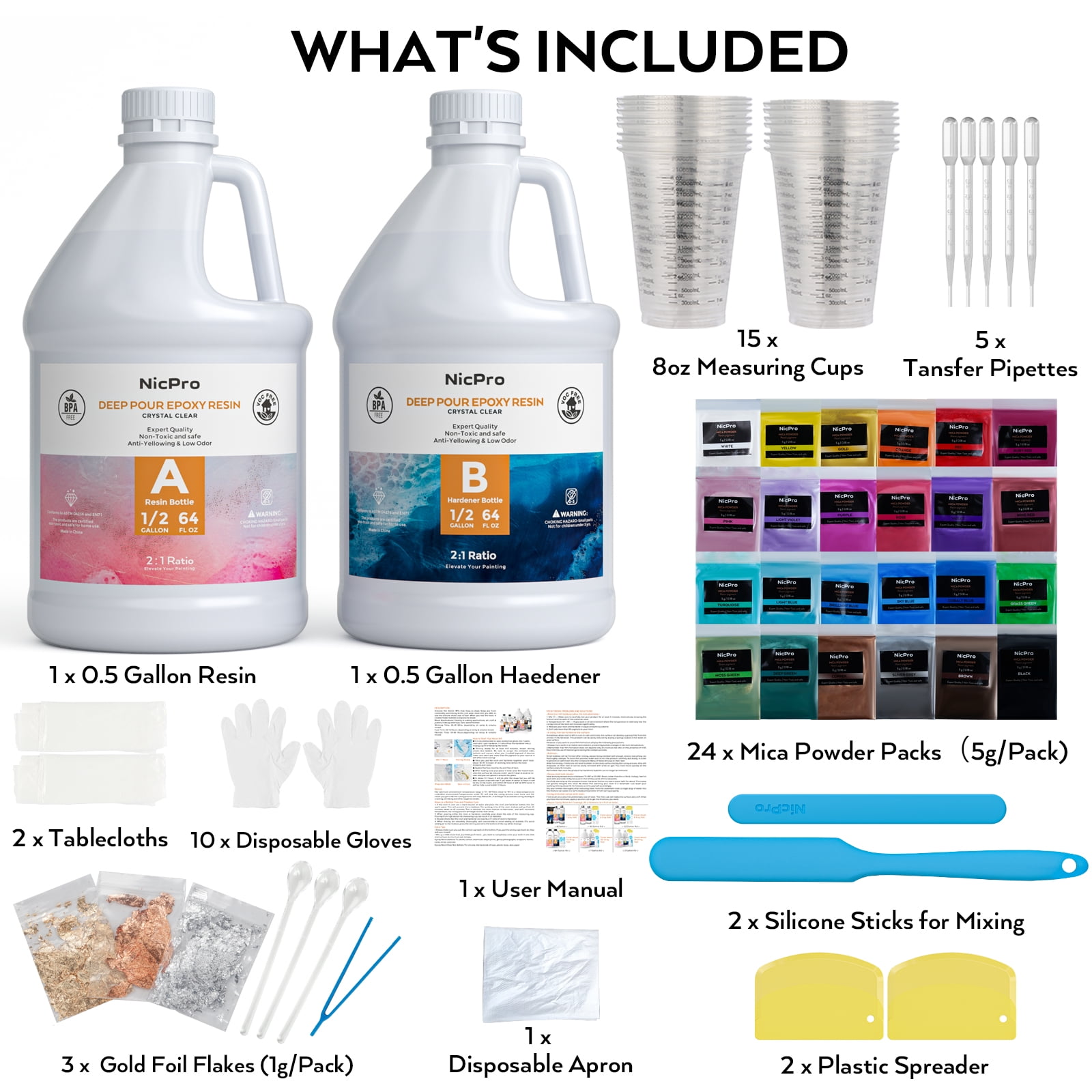 Nicpro 1 Gallon Crystal Clear Epoxy Resin Kit, Casting and Coating Resin Supplies for Art Craft Tabletop, Jewelry Making, Molds, Bar Top with 24 Mica Powder, Gold Foil Flakes, Measuring Cups, Sticks
