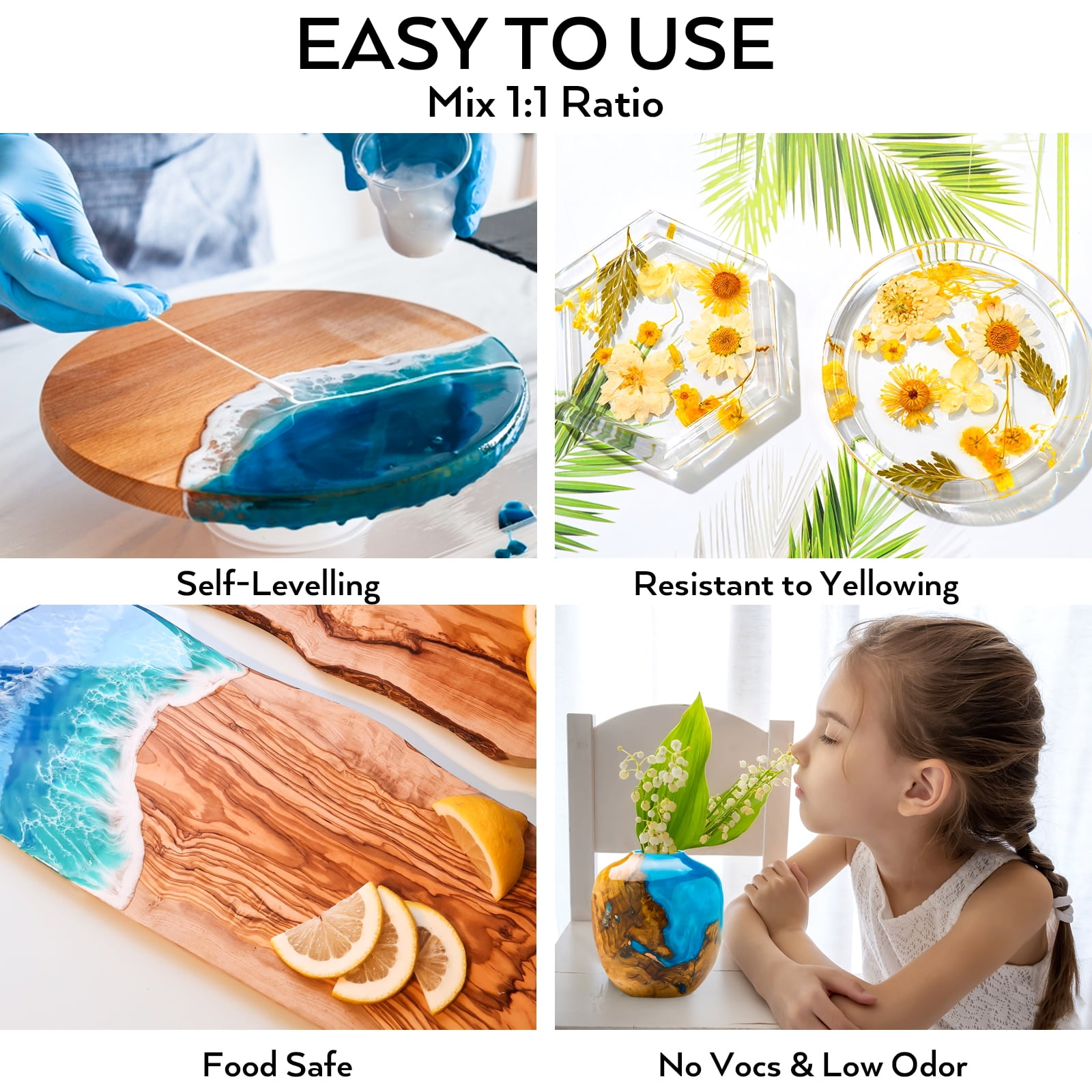 【COMPLETE STARTER EPOXY RESIN KIT】: 1 Gallon epoxy resin kit comes with everything you need. 0.5 gallon resin and 0.5 gallon hardener, 15 x 8oz measuring cups, 24 x mica powder (5g/pack), 3 x gold foil flakes (1g/pack), 10 x gloves, 5 x tansfer pipettes, 3 x spoons, 2 x plastic spreader, 1 x disposable apron, 2 x tablecloths and 1x user manual. 【SUPER EASY TO USE & FAST DRYING】: Just mix 1:1 Ratio by volume, it’s simple to use even for beginners and hobbyists. 30 minutes of work time, 8 hours fast curing time at room temperature, which could easily get a finest work! 【BUBBLE FREE CLEAR RESIN】: Our resin is self leveling and self degassing. Carefully and thoroughly avoiding forming bubbles, you will get a finished product that is as transparent as glass. It’s means you don’t need to spend a lot of time remove bubble, saving your resin projects work time. 【Ideal for all DIY】: Ideal for all DIY craft projects such as cutting resin art, resin jewelry, coating artwork and acrylic pour paintings, paintings, molds, river tables, etc.