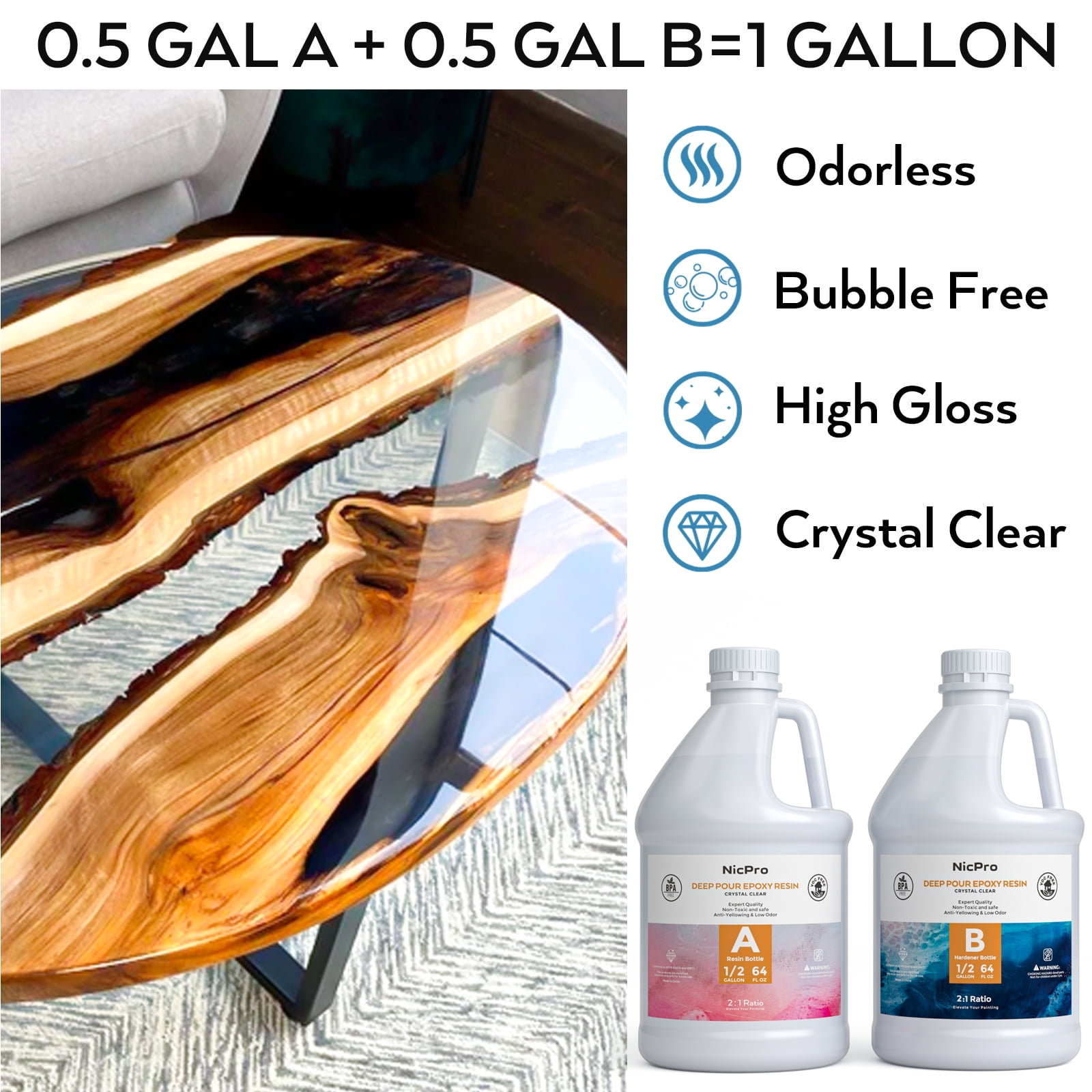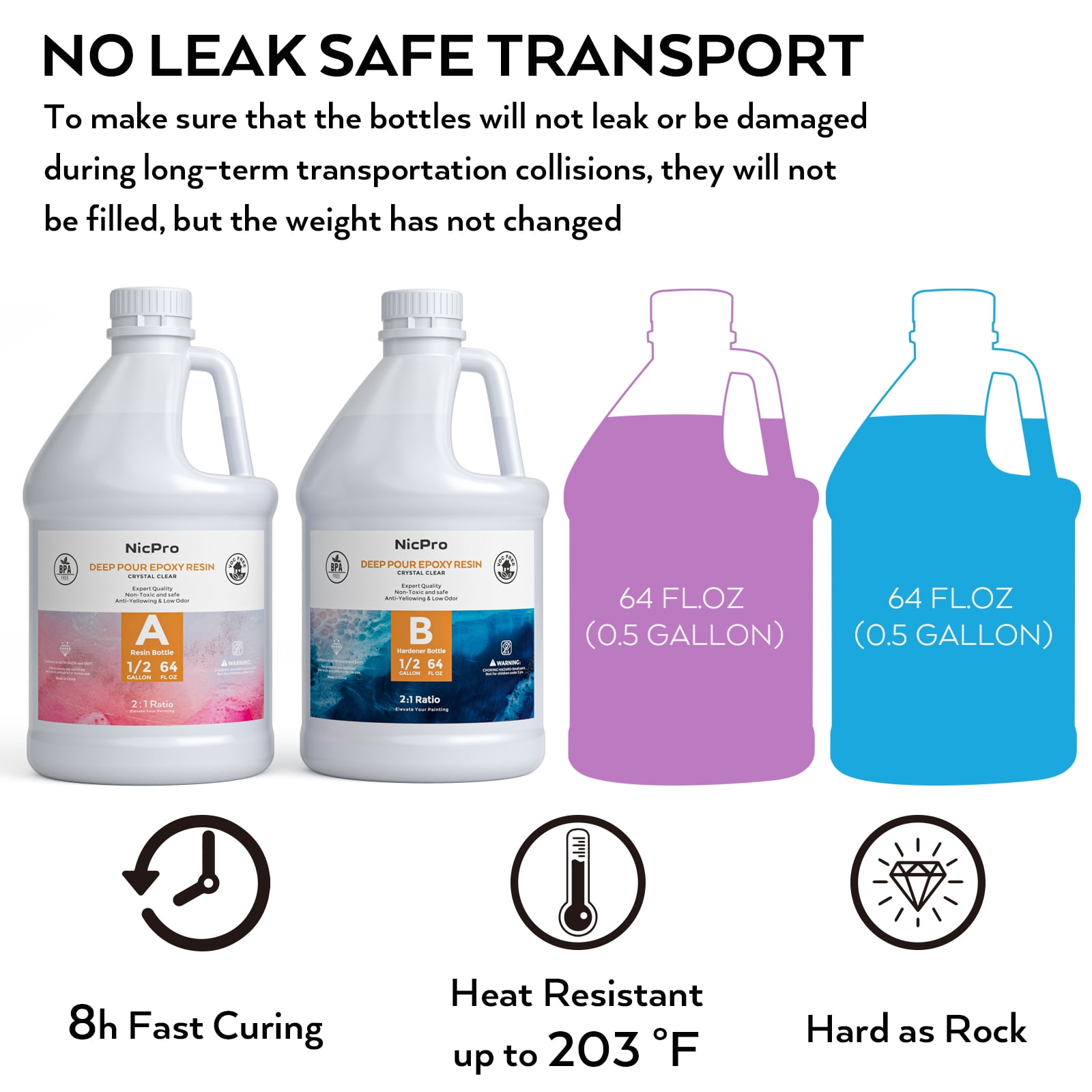 Nicpro Bubble Free & Self Leveling Crystal Clear Epoxy Resin Kit Start Your Resin Art Creations Nicpro 1 Gallon epoxy resin kit comes with everything you need to get started working with resin art, which is why our epoxy resin is very popular with everyone and our resin supplies is ideal for jewelry making, glass tumblers, bar tables, and tabletop. Our epoxy resin is suitable all silicone molds. the heat dissipation will not be too high to damage the molds. This casting resin is as transparent and clean as glass and you will get a product that crystal clear & high gloss finish. High Gloss Finish & Hard As Rock UV & Yellowing Resistant Qutstions & Answer About Nicpro Epoxy Resin 1. What kind of paint can I cover resin on? You can resin over acrylics, oil, spray or watercolor paint once it has dried thoroughly. 2. Can I use Nicpro resin over paper? Nicpro resin can cover good quality paper paper like photo paper, tracing paper, but not for thin paper, if you are not sure about what outcome will be simply conduct a test on a small piece of scrap paper first. 3. What is the work time and the cure time? You have 30 minutes working item, generally 8 hours it will be cured, thin project may takes longer time like 24 hours. 4. What temperature Nicpro resin is resistant to? The maximum temperature that cured Nicpro Resin can tolerate is 203℉ or 95℃. When temperatures as high as that, the cured resin may become a little soft & flexible but once they cool off, they will harden up once again. 5. How much powder or pigment is needed in epoxy mixture? There is no specific answer, the amount of pigment solely depends on the outcome that the user wants. Add pigment if desired, make sure don’t add more than 6% pigment to your resin or it will affect resin curing.