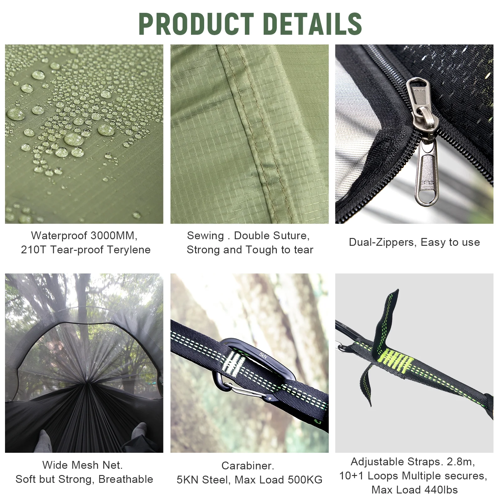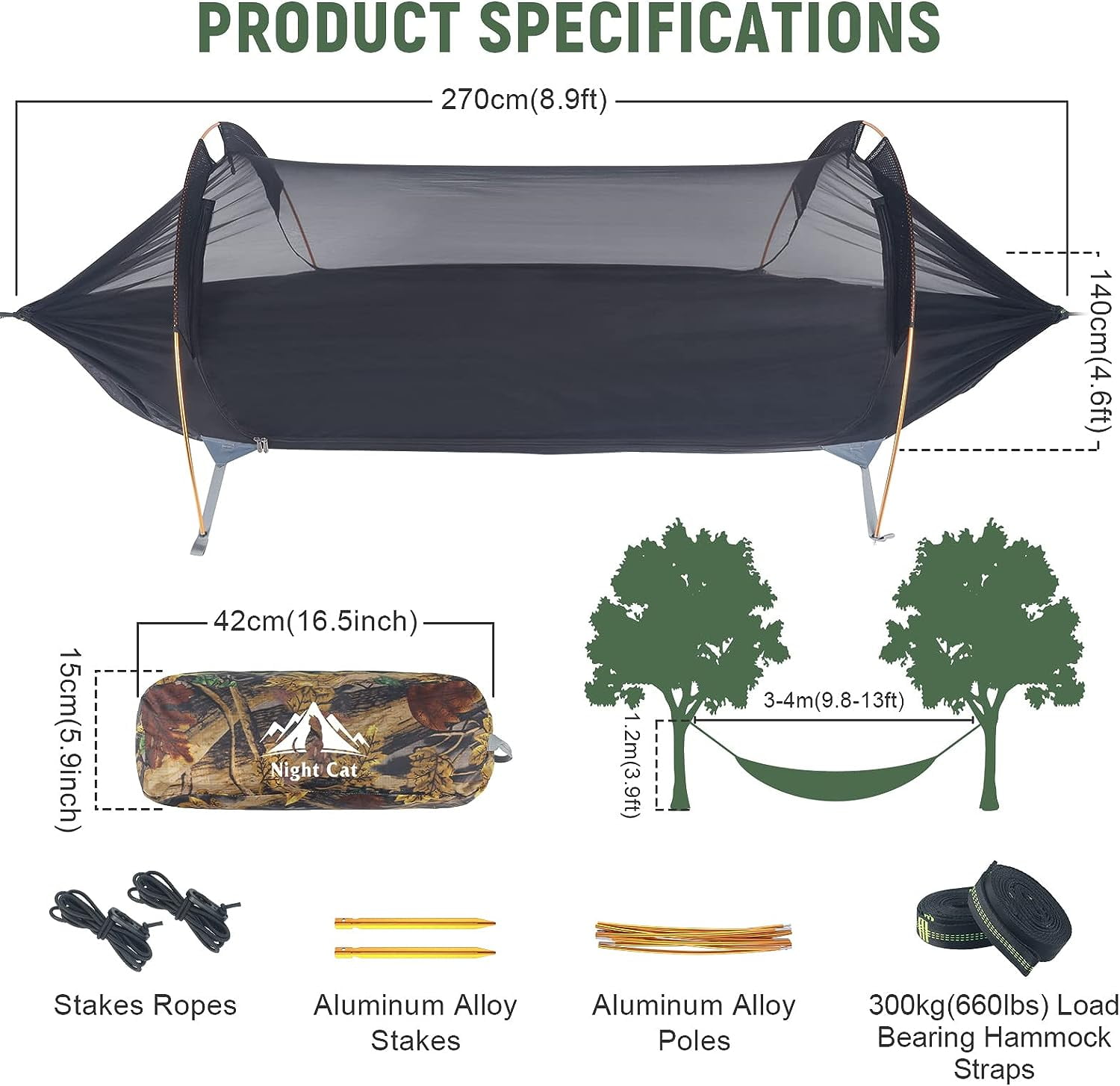 Hammock and Tent and Swing 3-in-1: This camping hammock tent is multifunctional to be used as a hammock, a tent or even a swing, that meets your different demands in camping backpacking, hiking, outdoor trips or just hanging and relaxing on your backyard. When used with the rain fly, the hammock becomes a heavy waterproof tent with nice airflow Safe with Mosquito Net and Strong for 440 lbs Weight: Designed with mosquito net, it keeps you away from annoying mosquitos or flies to have a safe and comfortable sleeping outside. The Hammock tent for camping is built with strong durable 70D nylon fabric and high-quality accessories are quite capable of providing support up to 200 (440 lbs) that fits one person perfectly, and usually, 2 ordinary persons if needed Easy and Fast Set up: Just tie 2 straps with 2 carabiners in anything sturdy like trees, then adjust the strap’s length to make the hammock balanced, install the mosquito net through 2 poles on each side, and cover the rain fly via buckles. It’s fast to assemble the hammock camping tent within a few minutes only Lightweight and portable: The whole package weighs 4 pounds only. The length after setup is 9 feet and the height is 4.5 feet. The package size is 16.5 x 5 x 5 inches, small, and portable to pack into your backpack, car, bike, motorcycle, etc. Ideal practical backpacking hammock tent as a gift What the package contains: 1 piece hammock with bug net; 1 piece rainproof hammock cover; 2 pieces tree straps with nopes; 2 pieces aluminum alloy foldable poles to stand up the mosquito net; 2 pieces ropes and 2 x stakes to prevent the hammock turning over; 4 pieces carabiners and 2 for the rain fly cover; 1 piece carrying bag Brand: Night Cat Seating Capacity: 1-2 persons Maximum Weight Recommendation: 440 pounds Item Weight: 4.4 pounds Item Dimensions L x W x H: 17 x 7 x 5 inches