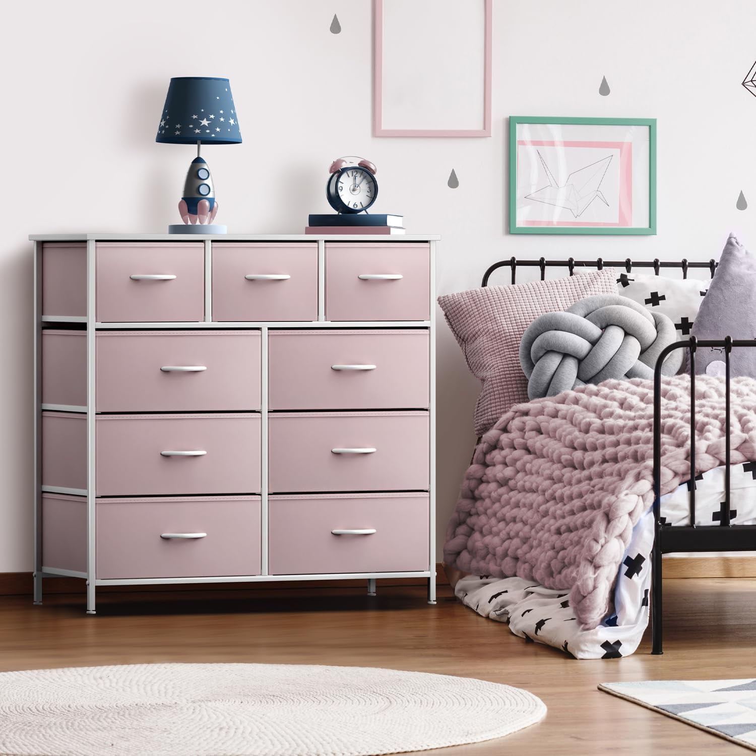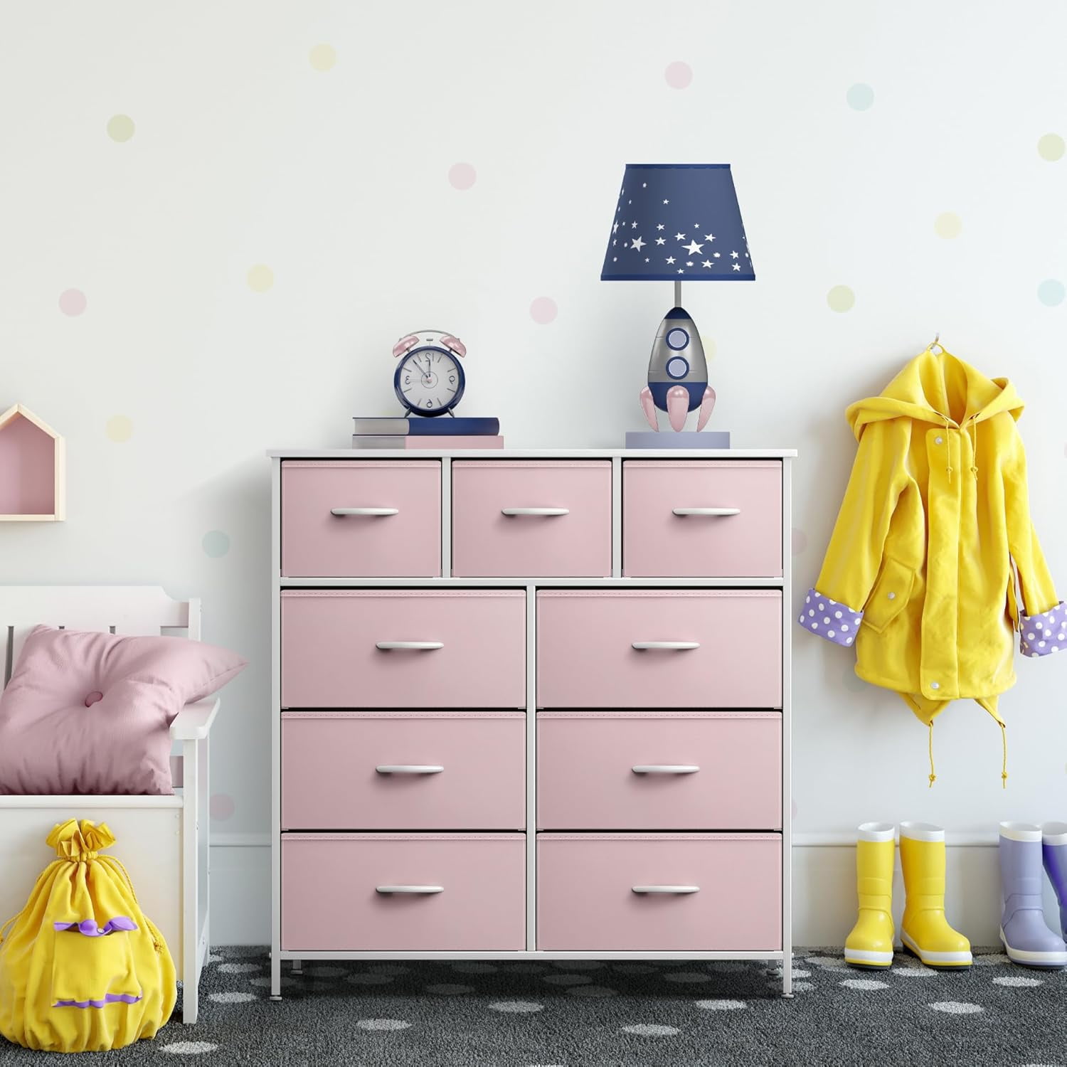 Update your childâs room with the Sorbus 9-Drawer Dresser. This colorful dresser chest features a tabletop surface and pull-out drawers to tuck away household clutter. Place all of your childâs folded t-shirts, jeans, and pajamas, or extra blankets and toys within the spacious fabric drawers. For display, the top surface can be used for lamps, books, clocks, and more. The playful color makes this furniture storage charming for any nursery, playroom, or bedroom. It is lightweight for easy transport and when not in use, simply fold the fabric drawers flat for storage. Complete the look with any drawer configuration from the Sorbus Furniture Collection. With everything you need right by your side, getting organized has never looked better! Great addition to any room for instant storage. Bring on the toys, books, and blankets! Display this charming dresser in the kidâs bedroom filled with linens and clothes or play area complete with coloring books, Legos, plushies, and dolls! The soft lightweight fabric makes it easy for kids to pull out their favorite toys for play dates or easily put them away. In the nursery, this chest brightens up your little oneâs sleeping space for stylish baby storage. With kids and teens in mind, it fits pastel rainbow décor, unicorn themes, and trendy ombré colors for a fun look. Stylish kid-friendly design with easy assembly. This nine-drawer dresser chest stand is portable, lightweight, and easy to assemble. Hardware and instructions INCLUDED. Drawers made of breathable, non-woven fabric with built-in carry handle. Frame made of steel. Tabletop surface made of MDF wood with smooth white finish. Wipes clean. Accessories shown in image NOT INCLUDED. Measures approximately 39.5â L x 11.5â W x 39.5â H.