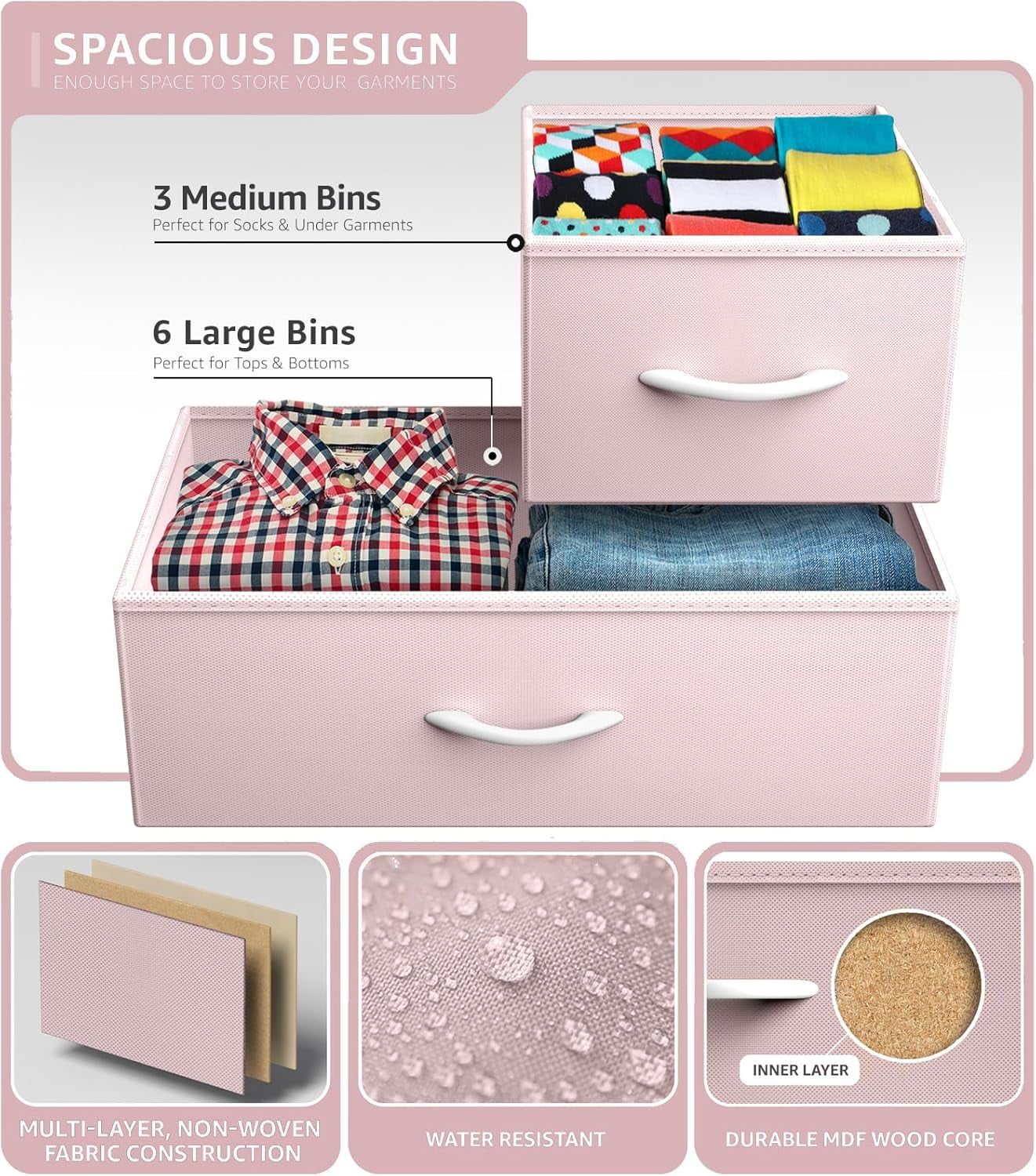 Carry Handles Portable wood handles for easy opening/closing, and carrying each drawer around the home. Sturdy Frame Made with strong steel frame and durable MDF wood top with smooth finish. Minimal assembly required. Deep Storage Great for concealing clothes, blankets,toys, linens, accessories, books, and more.