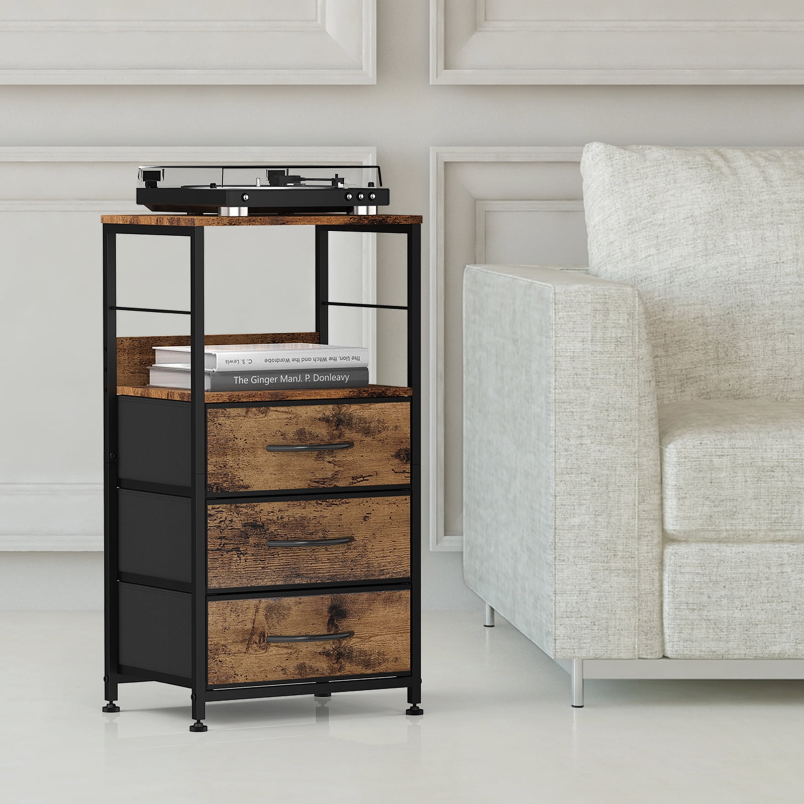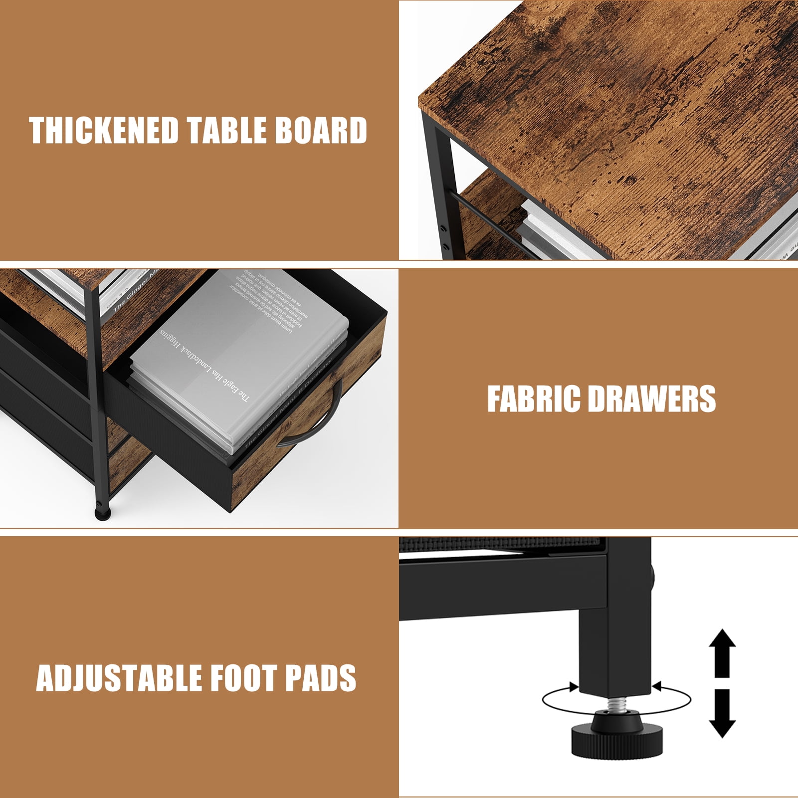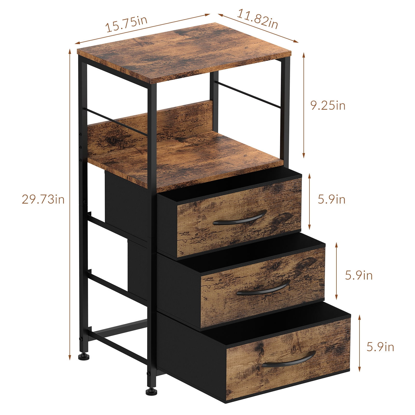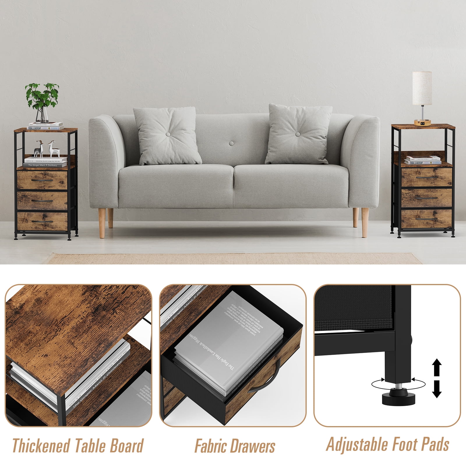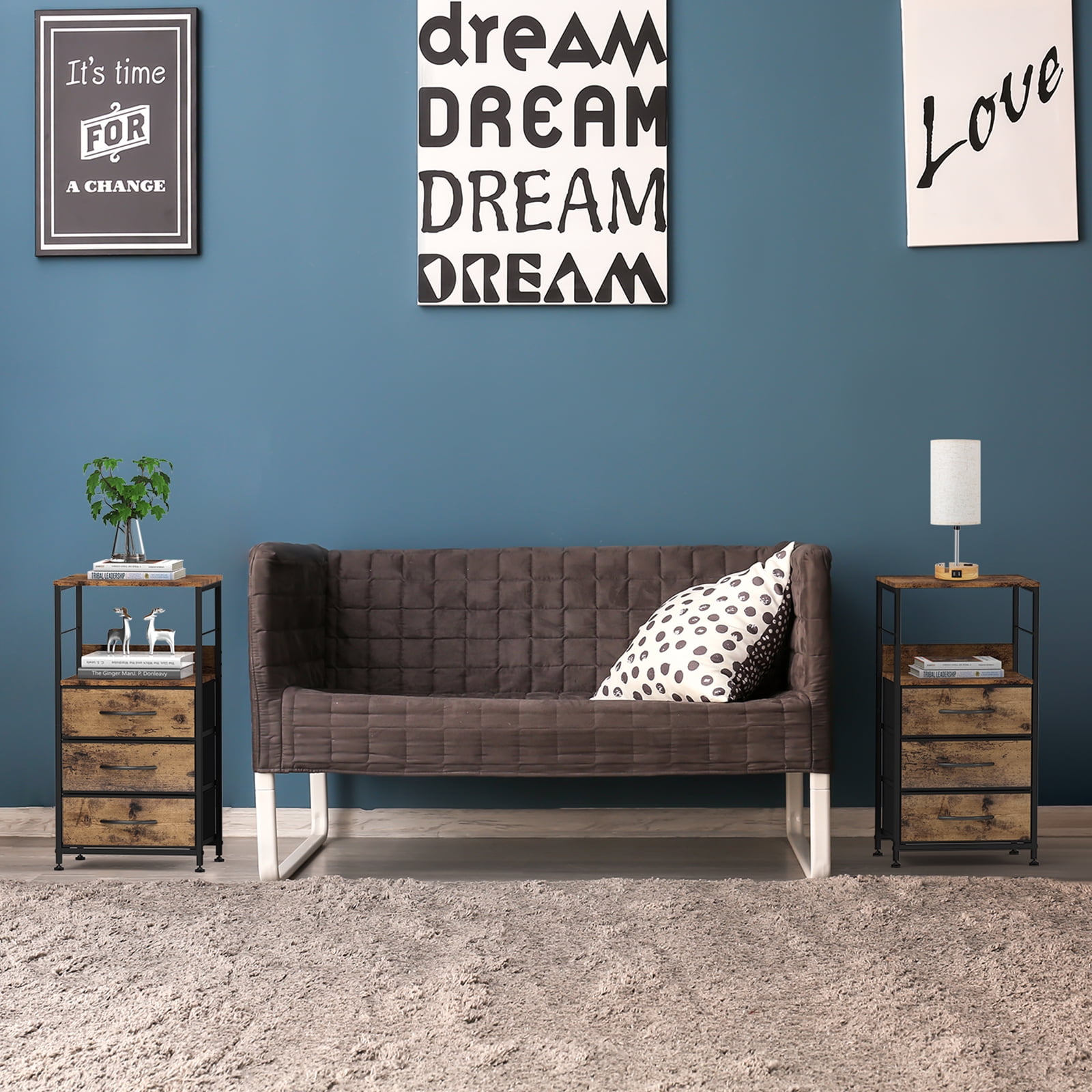 The end table with fabric drawers are ideal for storing personal items and keeping the room organized. The bedside table has 3 large drawers provide extra space for storing personal items or small items. The front side of the drawers is printed in rustic brown, and with a black metal frame, the end table creates a stylish industrial look to add interest to the home decor. The night table has 4 adjustable feet prevent shaking on uneven places and protect the floor from scratches.