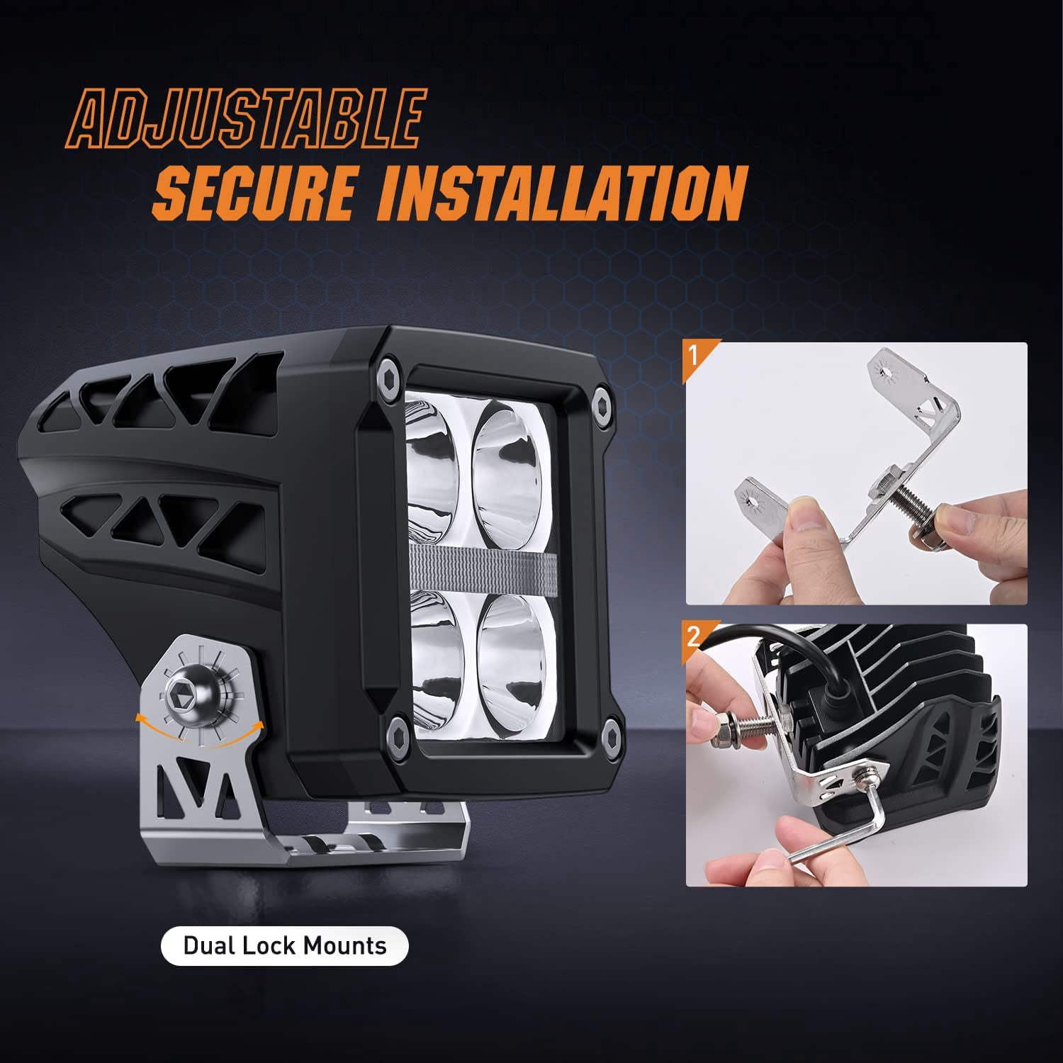 【Trusted Long-lasting Brightness】Employ top-notch 5W Osram P8 led chips, total 20 watts per light, with lighting performance 2510LM/PC, 540Lux@10Meters(33FT), 1Lux@232Meters (761FT) . Features a trusted, amazing, and long-lasting brightness without performance failure 【Dual Light Modes, All Day Protection】Main light functions as high power 10°super spot light to provide clear long-distance visibility at night. White DRL in the middle is to add extra safety during daytime by capturing other drivers’ notices of your presence on the road. Combining two modes, it’s the perfect light to ensure your safety the whole day 【Straight Forward Wiring Hook-up】Comes with 16AWG dual control wiring kit that includes switch relay and fuse all in one set. Just directly hardwire the color-coded wires on the wiring kit and lights, and then connect the power cord to the power source 【EMI/RFI Protection】Light pods are built-in EMC that meets EN55015 CE standards, limiting the generation of EMI/RFI interference. Provides better protection for both internal electronic components in lighting and also external objects like radio receiver 【Premium Durability】IP68 waterproof rated, solid built to withstand harsh environments and weather elements. All in aluminum profile and thick heat shrink shell, efficiently accelerate heat dissipation and maintain a safe temperature to ensure stable lighting output as well as lighting durability. Extend lifespan over 50,000H
