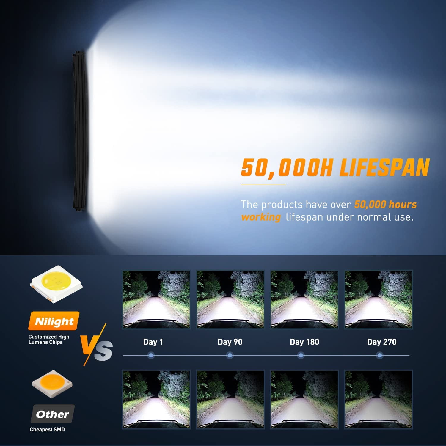 Super Brightness: Features 320 high power LED chips with a combo beam and triple row design for extreme light efficiency, allowing you to see obstacles and wildlife on dark roads Upgraded Reflector Cup: The broad reflective plate on both sides enables multiangle refraction, making it ideal for ambient illumination Better Heat Dissipation: Constructed with diecast aluminum alloy housing and an IP67 waterproof rating, ensuring over 50,000 hours of lifespan with efficient cooling Adjustable Mounting Bracket: Includes sturdy brackets that can be adjusted and slid for flexible positioning as needed