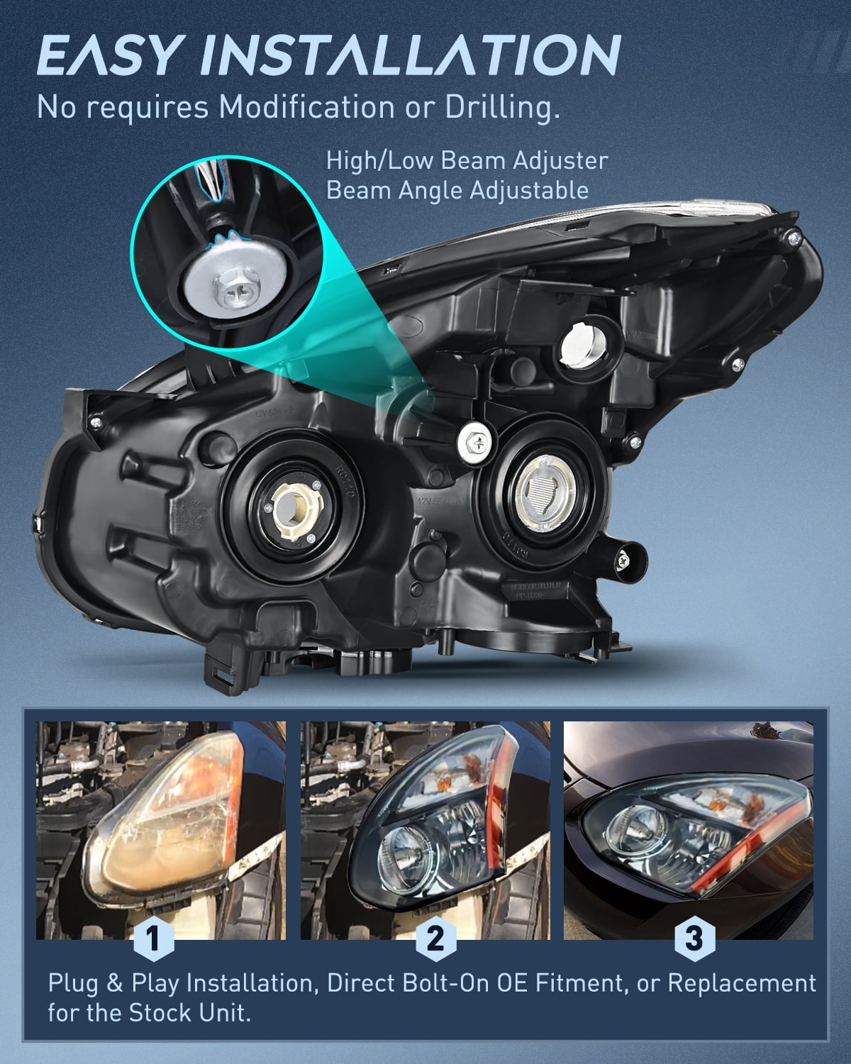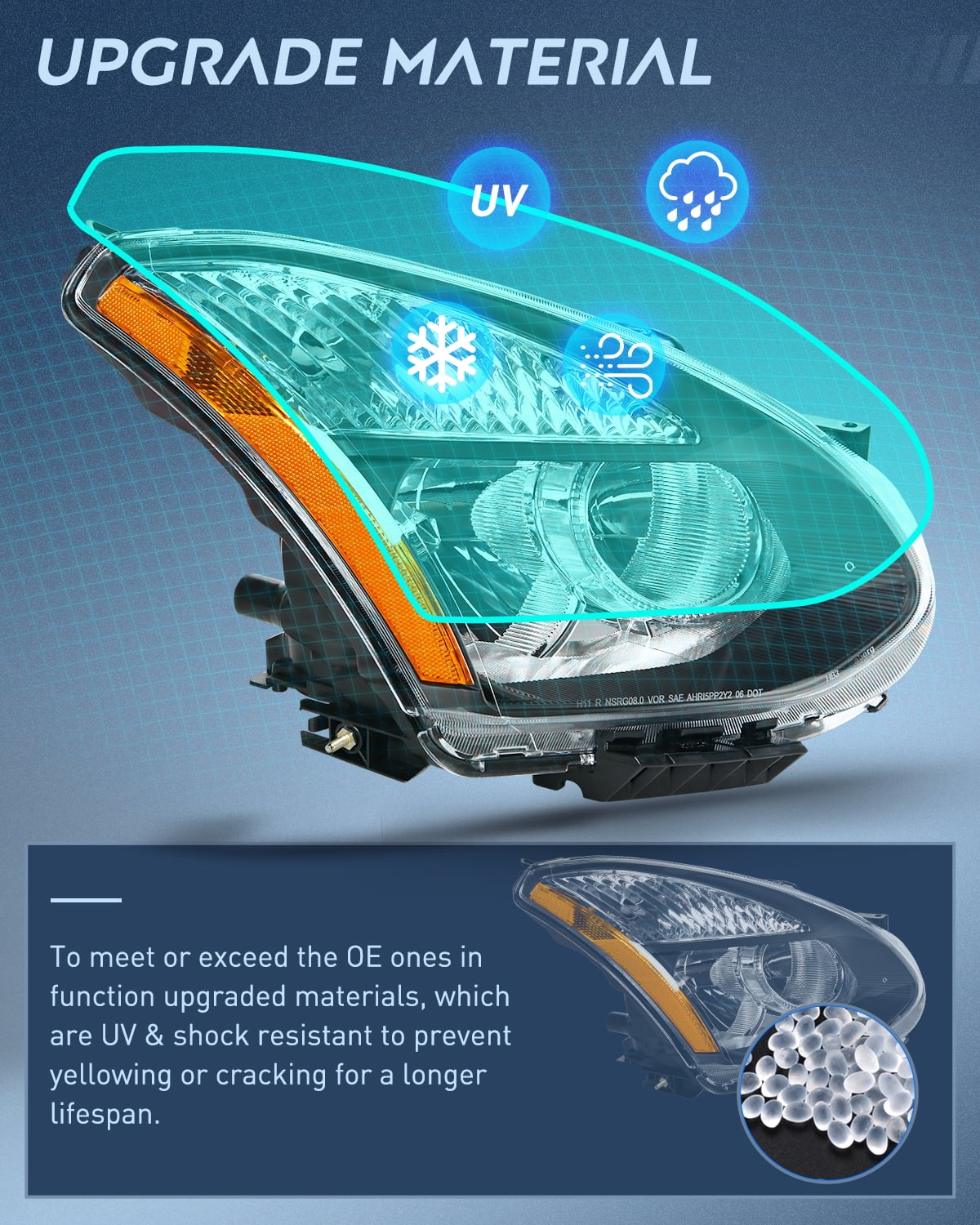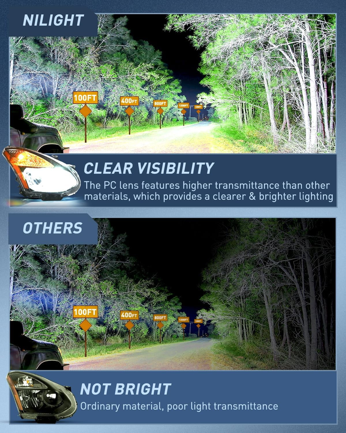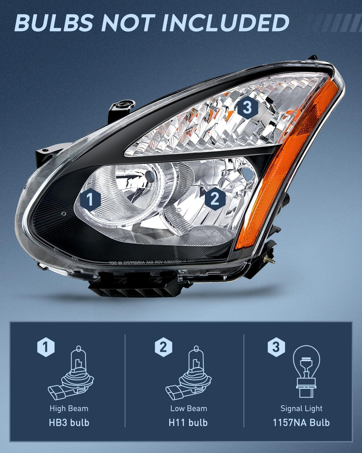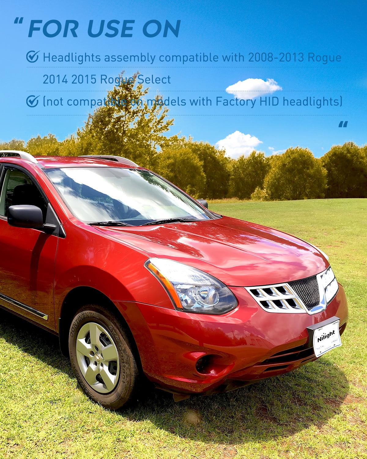 Compatibility: The headlight assemblies are compatible with 2008 2009 2010 2011 2012 2013 Nissan Rogue and 2014 2015 Nissan Select (Not compatible on models with factory HID headlights). High beam /Low beam bulb type: HB3/H11(Bulbs are not included), Turn signal light: 1157A(bulbs are not included), use Stock Bulbs for installation Super bright and wide illumination range: The integrated metalized reflectors of this headlight assembly increase light distance for better visibility & driving safety Durability: The high-impact housing withstands shock and vibration. With fully sealed silicon prevents environmental damages including freezing, foggy, fading, corrosion, and provides reliable service in sorts of weather conditions such as rain, snow, or dust storms, enabling your car looks better and drive safer DOT Compliance and safe Driving: To ensure driving safety for you and the oncoming driving circumstance, our 2008 2009 2010 2011 2012 2013 Nissan Rogue 2014 2015 Nissan Rogue Select headlights are DOT & SAE compliant. Our headlights provides clearer and further vision to see the wild animals, falling rocks or other obstacles at night. Reduce the possibility of danger. Package Includes: 1 Pair of Headlight for 2008 2009 2010 2011 2012 2013 Nissan Rogue 2014 2015 Nissan Rogue Select Headlamp (driver side and passenger side), 1x User Manual, 2 Year Warranty by Nilight