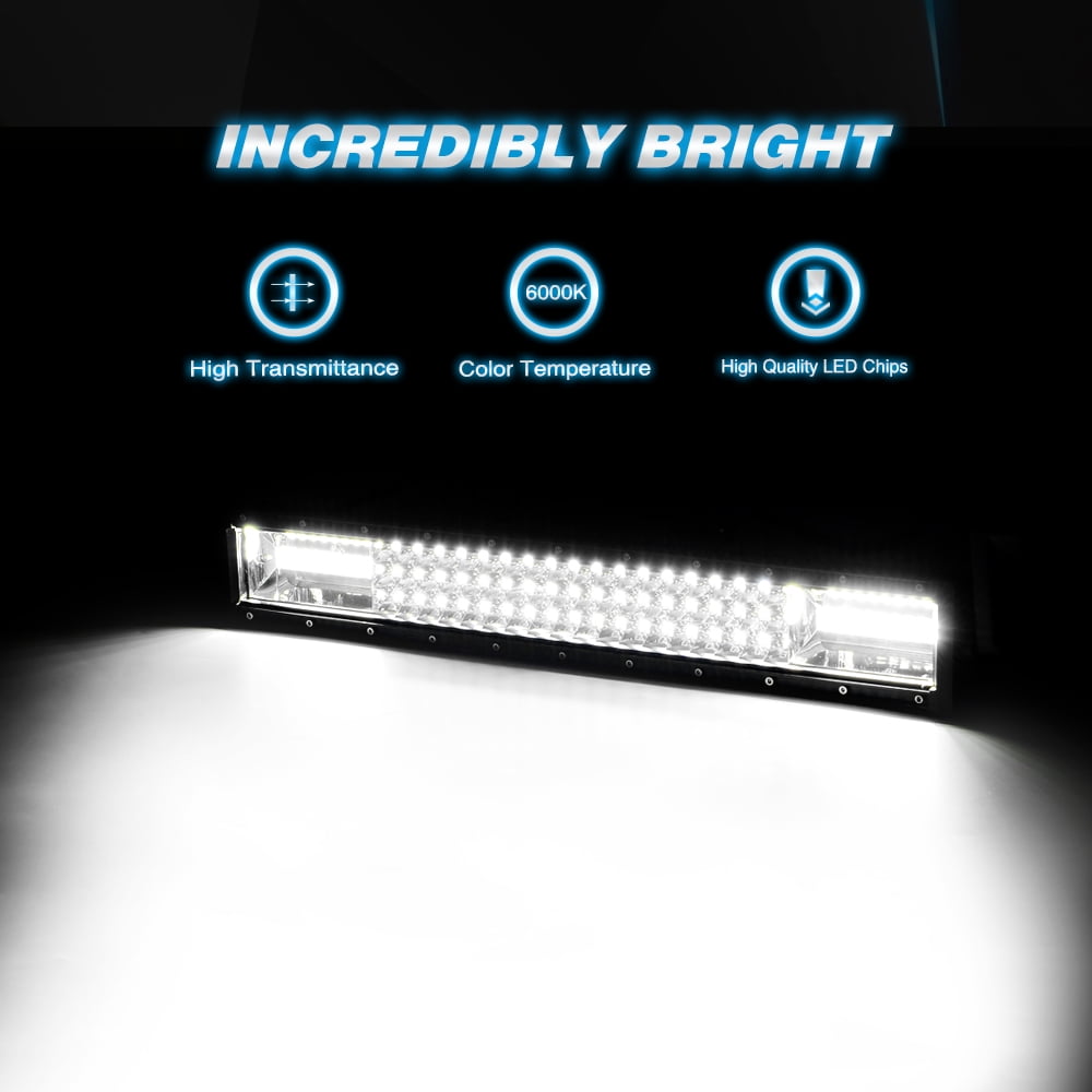 22 Inch Triple Row Curved Led Light Bar. Beam Pattern: Spot Flood Combo Beam. Input Voltage: 9-30V DC (fits 12V, 24V vehicles). Working Lifespan: Over 30,000 hours. Working Temperature: -40~85 degrees Celsius. LED Color Temperature: Pure White 6000K-6500K. Material: 6063 Aluminum Alloy Profile, High quality Led Chips, PC Lens. Waterproof Rate: IP67; Waterproof, dustproof, quakeproof and anti-corrosive.
