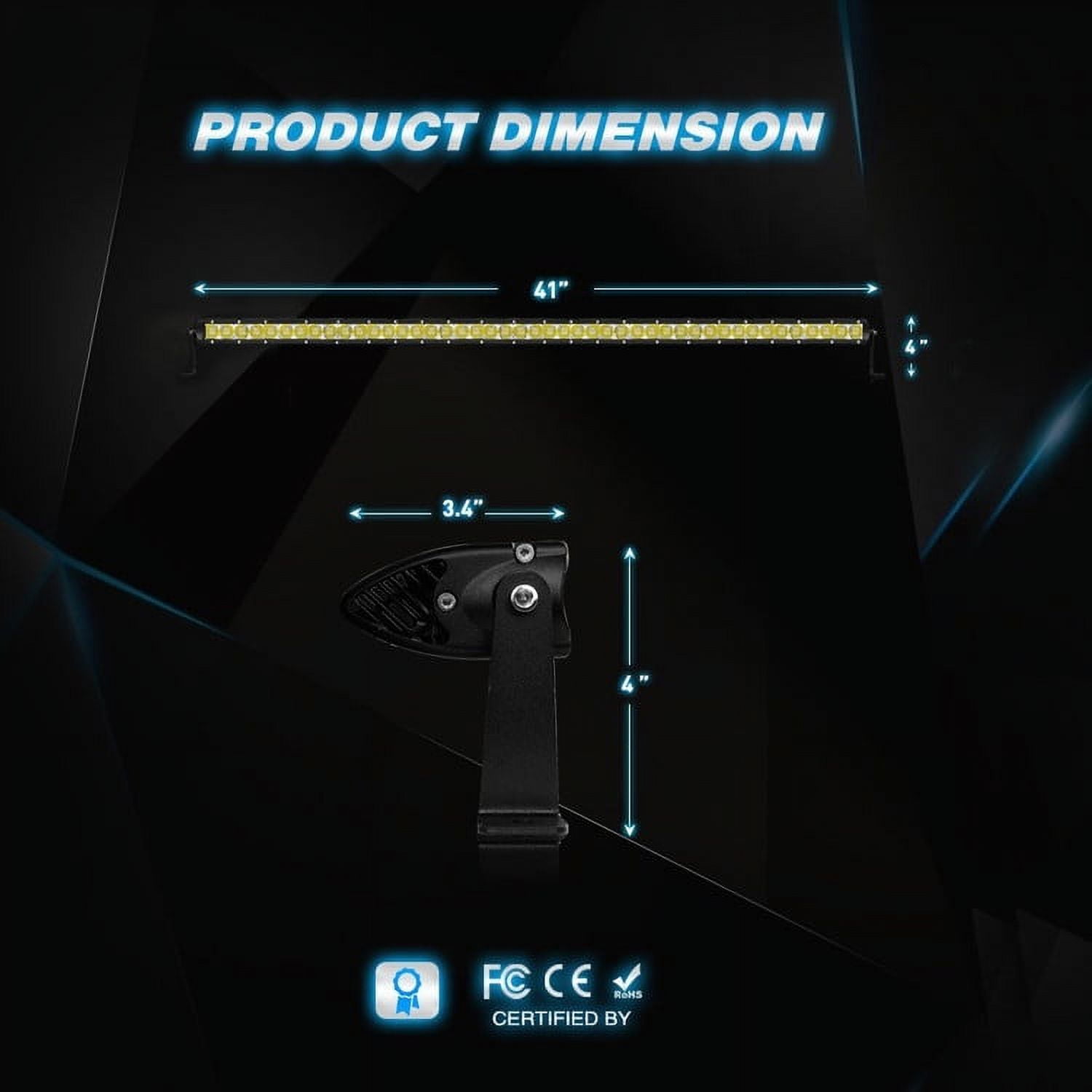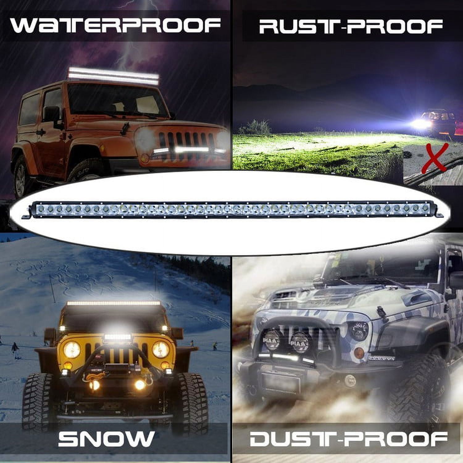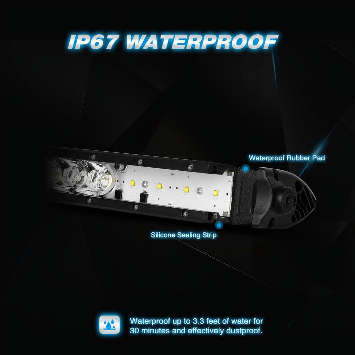 Extreme bright design, very universal. The light can increase your driving visibility though in the tough environment. IP68 waterproof design, no worry for the rainy day. The newest lens can make the light bar lighting wider and further distance at night driving. Firm housing and high IP grade expand the lifespan of LED light bar.