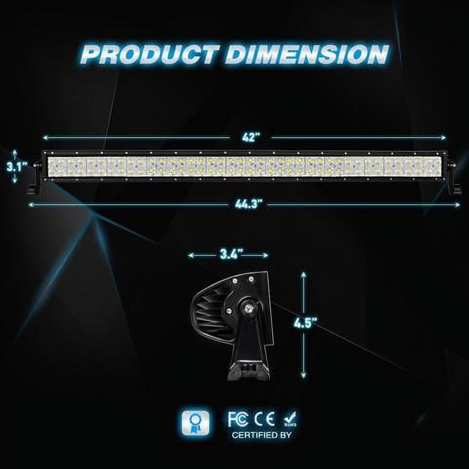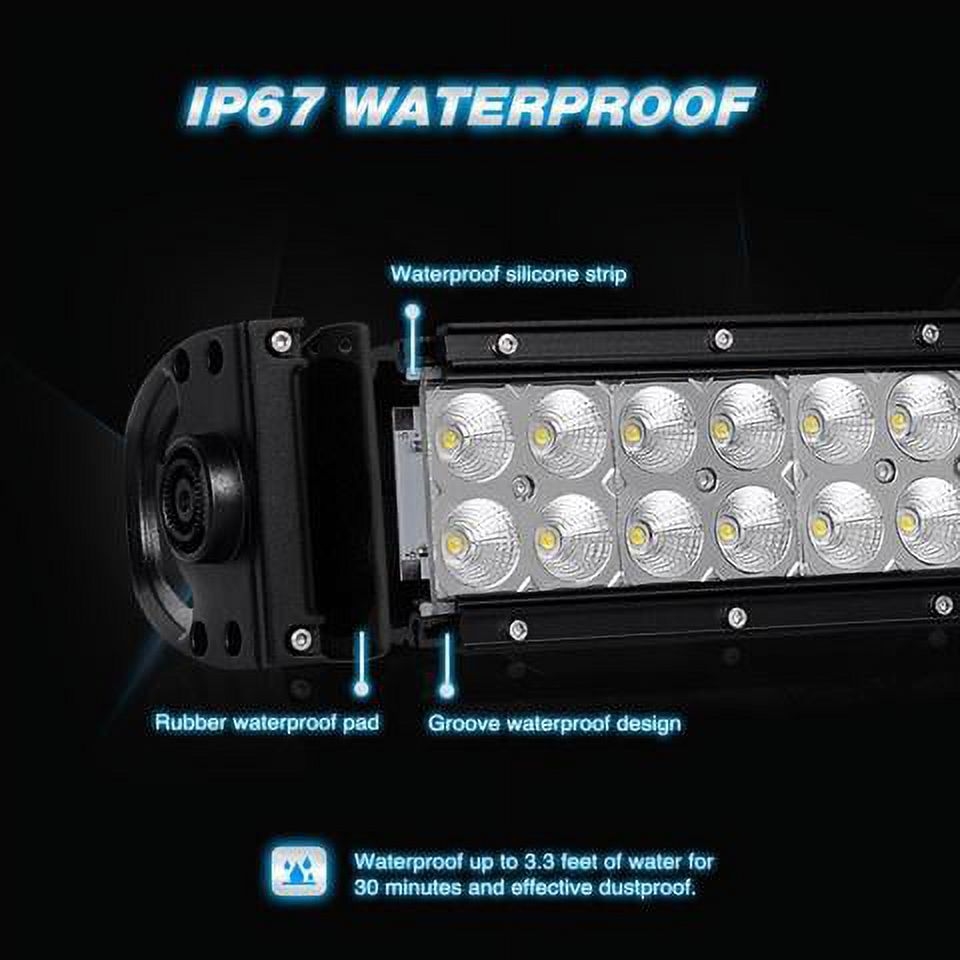 Specification: LED Power: 18W (6 x 3W High Intensity LED) ; Beam Pattern: Flood Beam; Lumen: 1260LM LED Power: LED Power: 240W (80 x 3W High Intensity LED); Beam Pattern: Spot Flood Combo Beam Input Voltage: 9-30V DC (fits 12V, 24V vehicles) Working Lifespan: Over 30,000 hours Working Temperature: -40~85 degrees Celsius LED Color Temperature: Pure White 6000K-6500K Material: 6063 Aluminum Alloy Profile, High quality Led Chips, PC Lens Waterproof Rate: IP67; Waterproof, dustproof, quakeproof and anti-corrosive Certifications: CE, FCC and RoHS Heavy Duty Wiring Harness: 10ft wiring harness, one power connector to light fixture Maximum Wattage: 380W, Operating Voltage: 12V DC Power Applications: Off Road Lighting: Back Up Light, Jeeps, 4×4, Cars, ATV, UTV, SUV, Truck, Trailer, Forklift, Trains, Boat, Bus, Outdoor lighting, etc.Other Lighting: Excavator, Dozer, Road Roller, Crane, Tractor, Harvester, Grain Drill, Mower, Snowplow, Fire engine, Rescue Vehicle, Camping, Mining Lighting, Construction Lighting, etc.Household Lighting: Garden, Backyard, Garage, Indoor Lighting. (Note: Use a voltage transformer/converter to convert the AC 110-120V to DC 12V for indoor use.)Universal Fitment: The wiring harness is a good accessory for off-road vehicles, working vehicles, automobiles and boat that use a 12V DC power source. Note: They are aftermarket parts. NOT D.O.T. approved. Do not use if D.O.T. is required. For off road use only. Before installing this product, please check your state/provincial and local/municipal laws and regulations. Please finish the installation by professionals or install the wiring harness under the guidance of professionals. Package Includes:1PCS 240W Flood Spot Combo Led Light Bar,4PCS 18W Flood LED Light Bar
