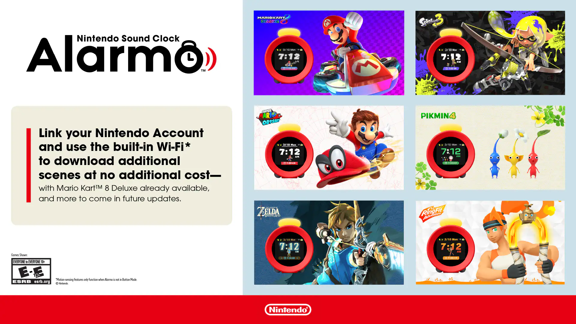 Make waking up fun with Nintendo Sound Clock: Alarmo. Introduce a little play to your wake-up routine with Alarmo, the interactive alarm clock from Nintendo! Select a title, pick a scene, set a time, and let Alarmo handle the rest. In the morning you’ll experience immersive sounds and music from the scene you picked, followed by a game element arriving to help wake you up! Choose from 35 scenes inspired by five Nintendo titles: Super Mario Odyssey, The Legend of Zelda: Breath of the Wild, Splatoon 3, Pikmin 4, and Ring Fit Adventure. Link your Nintendo Account and use the built-in Wi-Fi to download additional titles at no additional cost—with Mario Kart 8 Deluxe already available, and more to come in future updates. Alarmo has a sensor that reacts to your movements, so you can snooze the alarm with gestures and end it by getting out of bed. Try Button Mode if you prefer a more traditional alarm clock! Add Nintendo soundscapes to your living space. After selecting your scene, you can also set an hourly chime to play music themed to your chosen title. A character from that title will also appear on the display and react to your movements. Turn on Sleepy Sounds and after getting into bed at the set time this chime will be replaced with gentle music and sounds to help you wind down and get ready for bed. Nintendo Sound Clock: Alarmo is not just an alarm clock—it adds a bit of fun to your room throughout the day! Customize your alarm and keep track of your sleep activity. Choose Steady Mode for an alarm that gradually gets more intense the longer you stay in bed, or use Gentle Mode for a more consistent experience. Check your Records to learn about the time you’ve spent in bed, including information like how much you’ve been moving around in your sleep. Alarmo does not communicate any movement information to Nintendo. Nintendo Account and internet access required for online features. Motion-sensing features only function when Alarmo is not in Button Mode. Software update required.