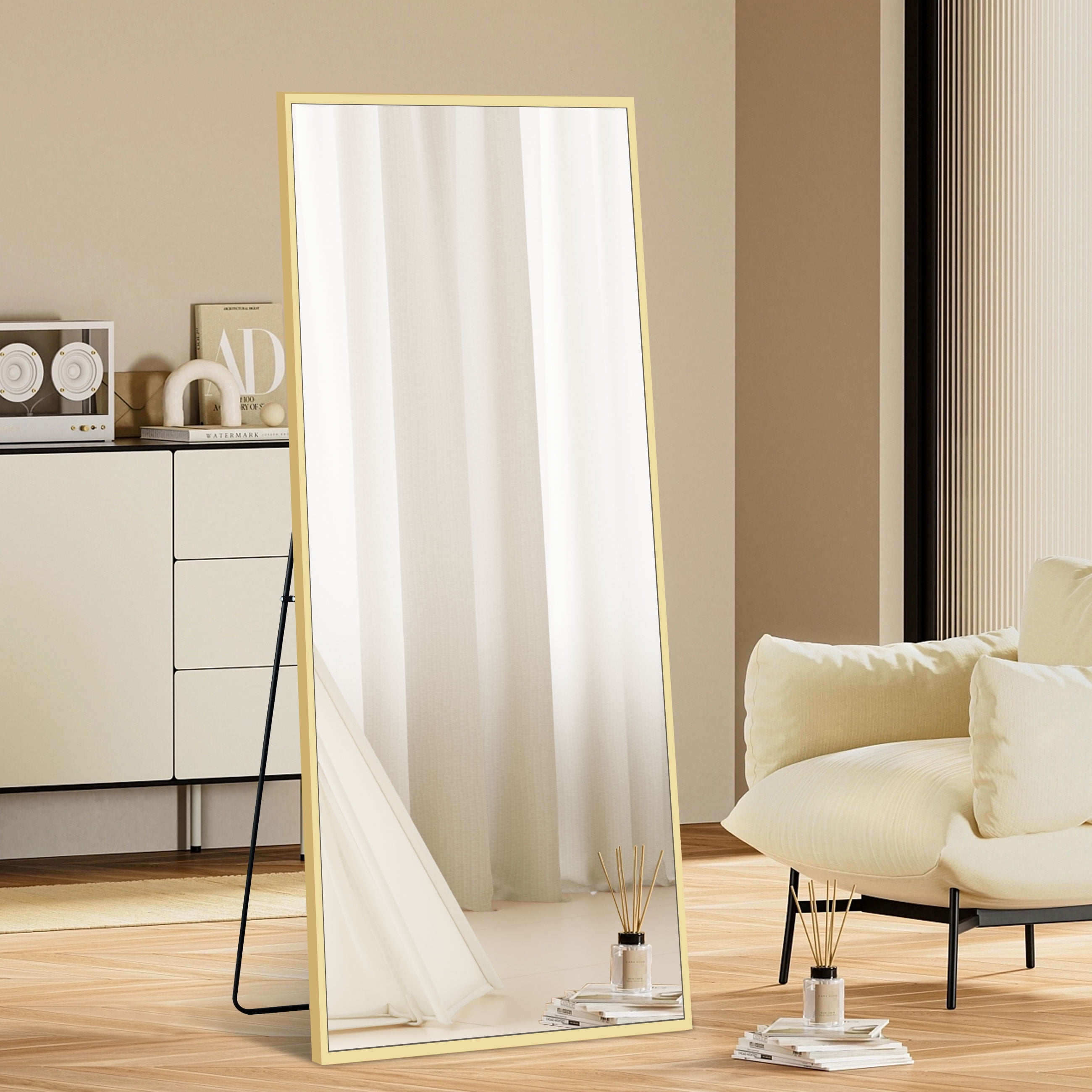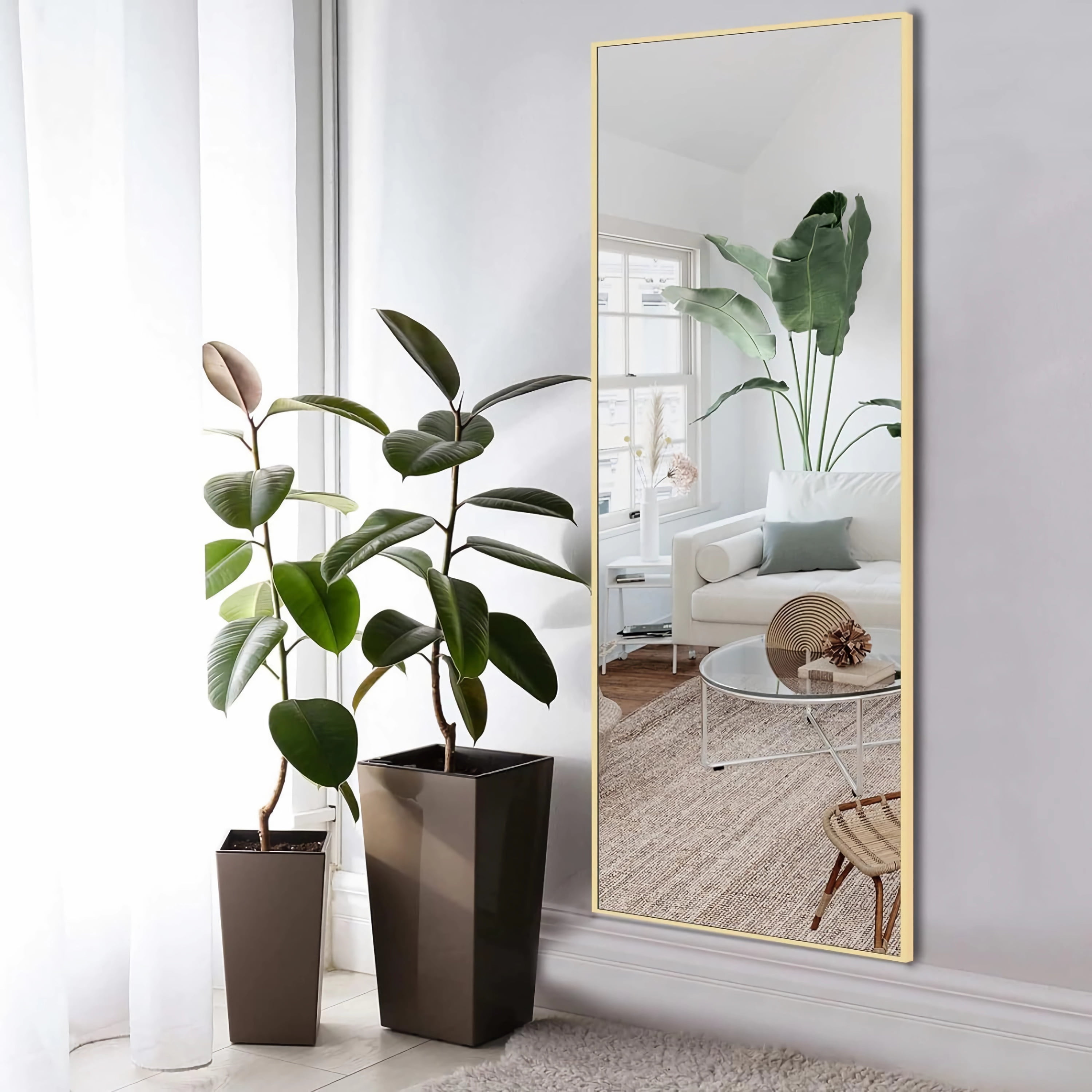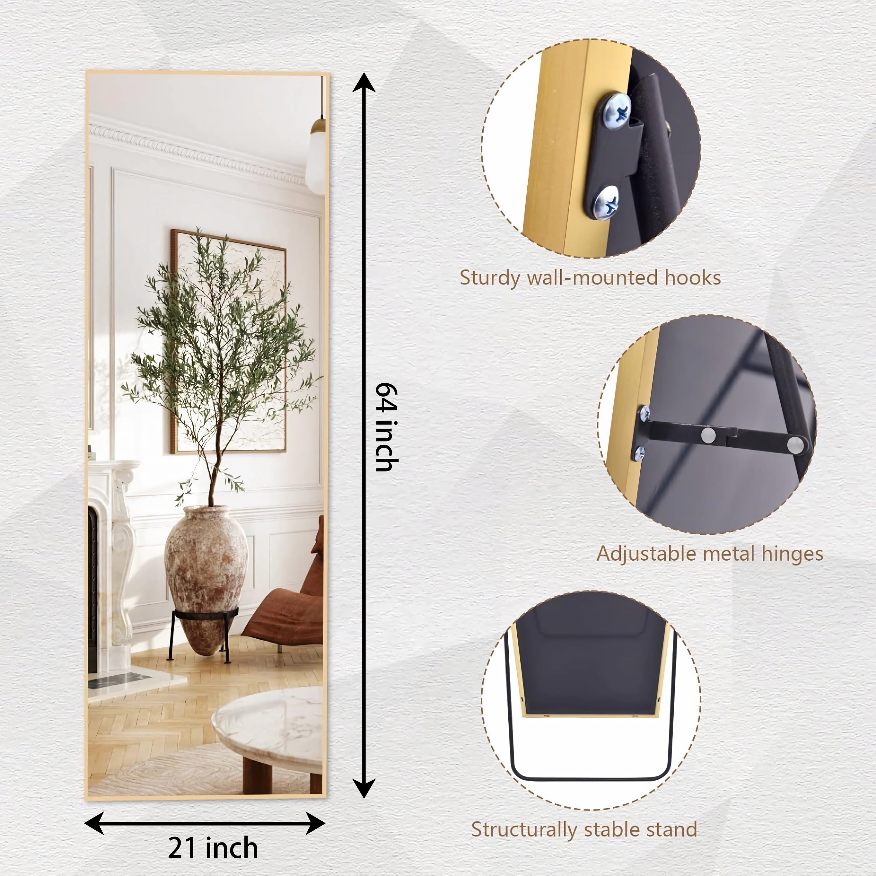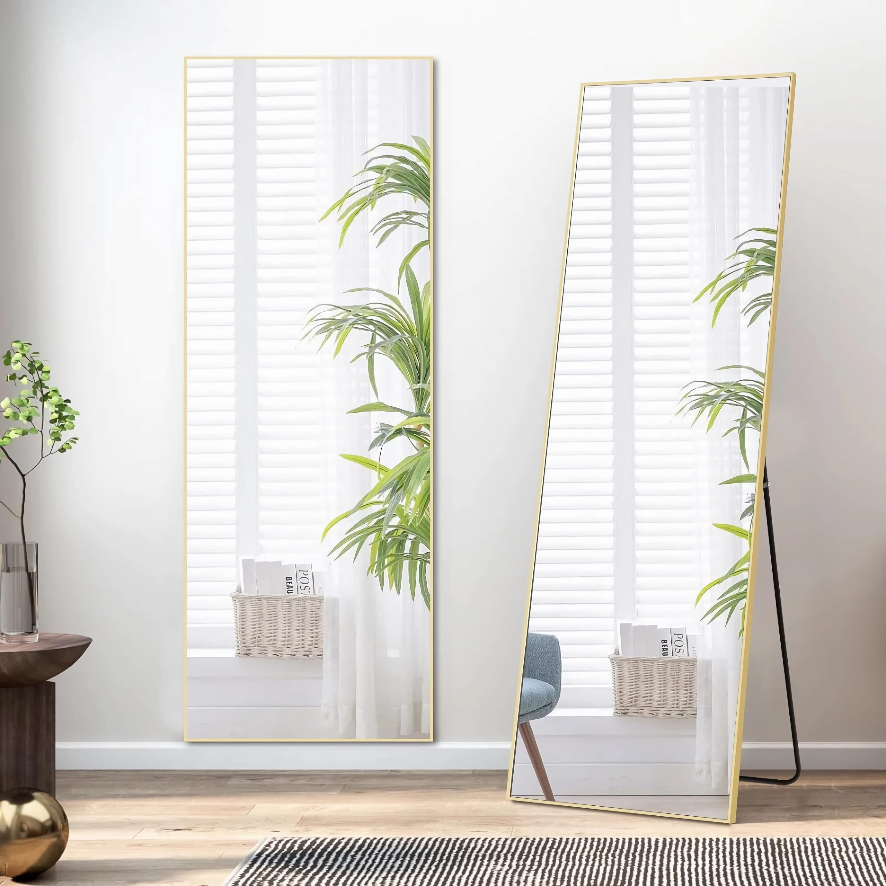 Retangular Decor Mirror: 64 x 21 inch full length size mirror. Gold Right Angle Full-length Mirror with modern rectangle design makes the floor mirror elegant and classic. The full length standing mirror for walls is not only a dressing tool but also a home decoration. Metal Framed and HD Image: Our full body mirror is made of aluminum alloy frame, which is durable and has a shiny appearance and 4 mm high definition nano glass. A shatter-proof and explosion-proof film is added to the back of the glass, which reduces sputtering damage caused by breakage, perfectly ensures the safety of you and your family.