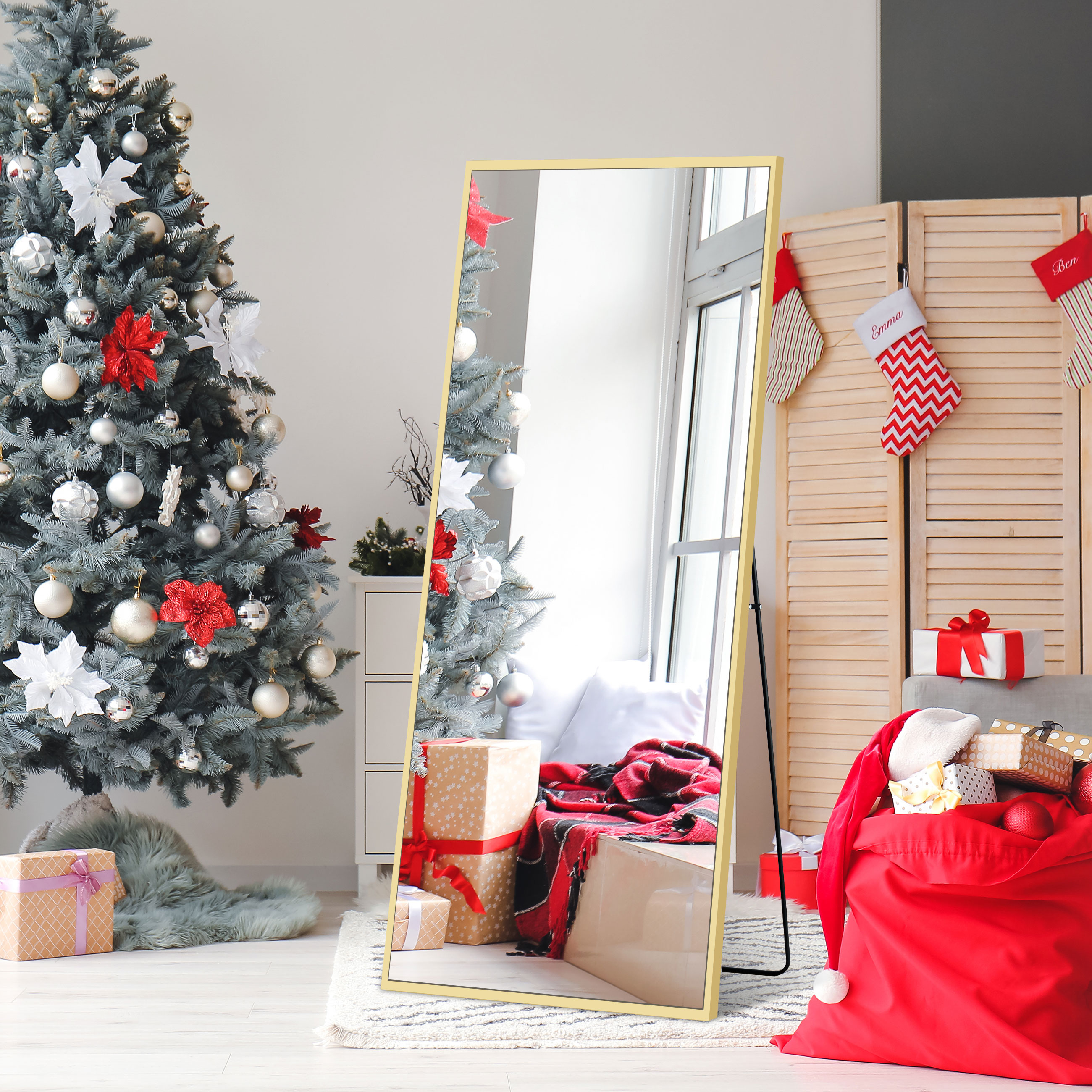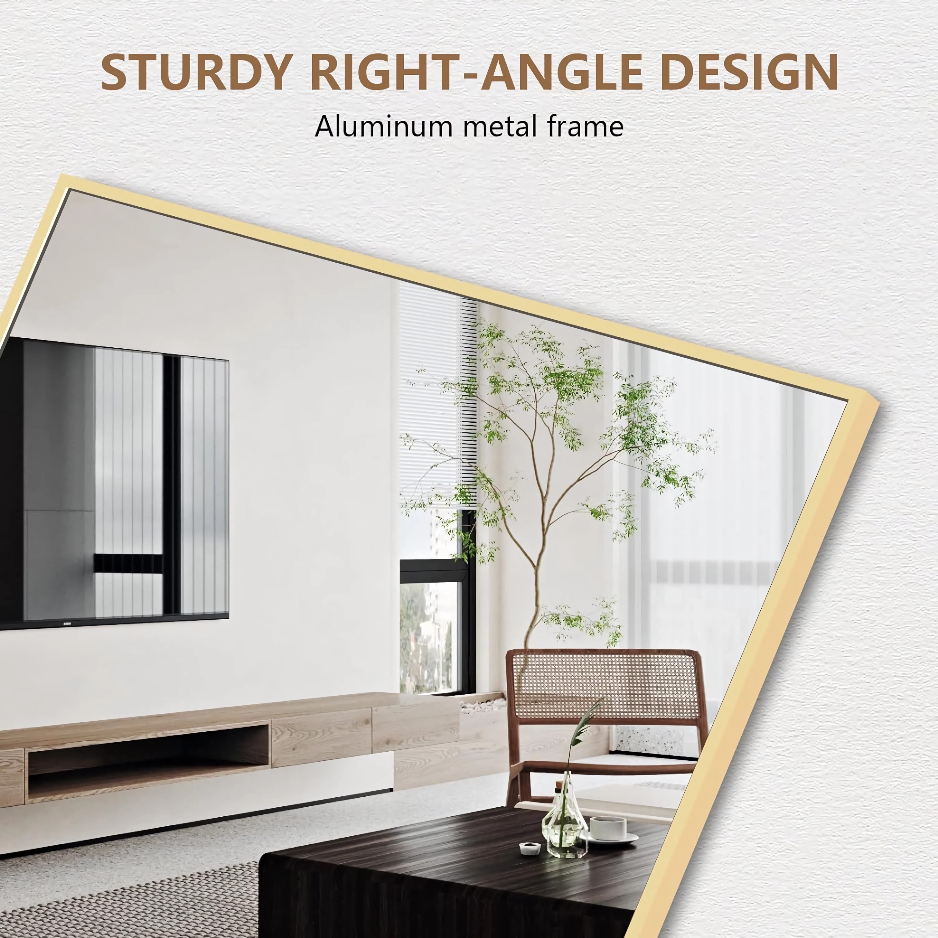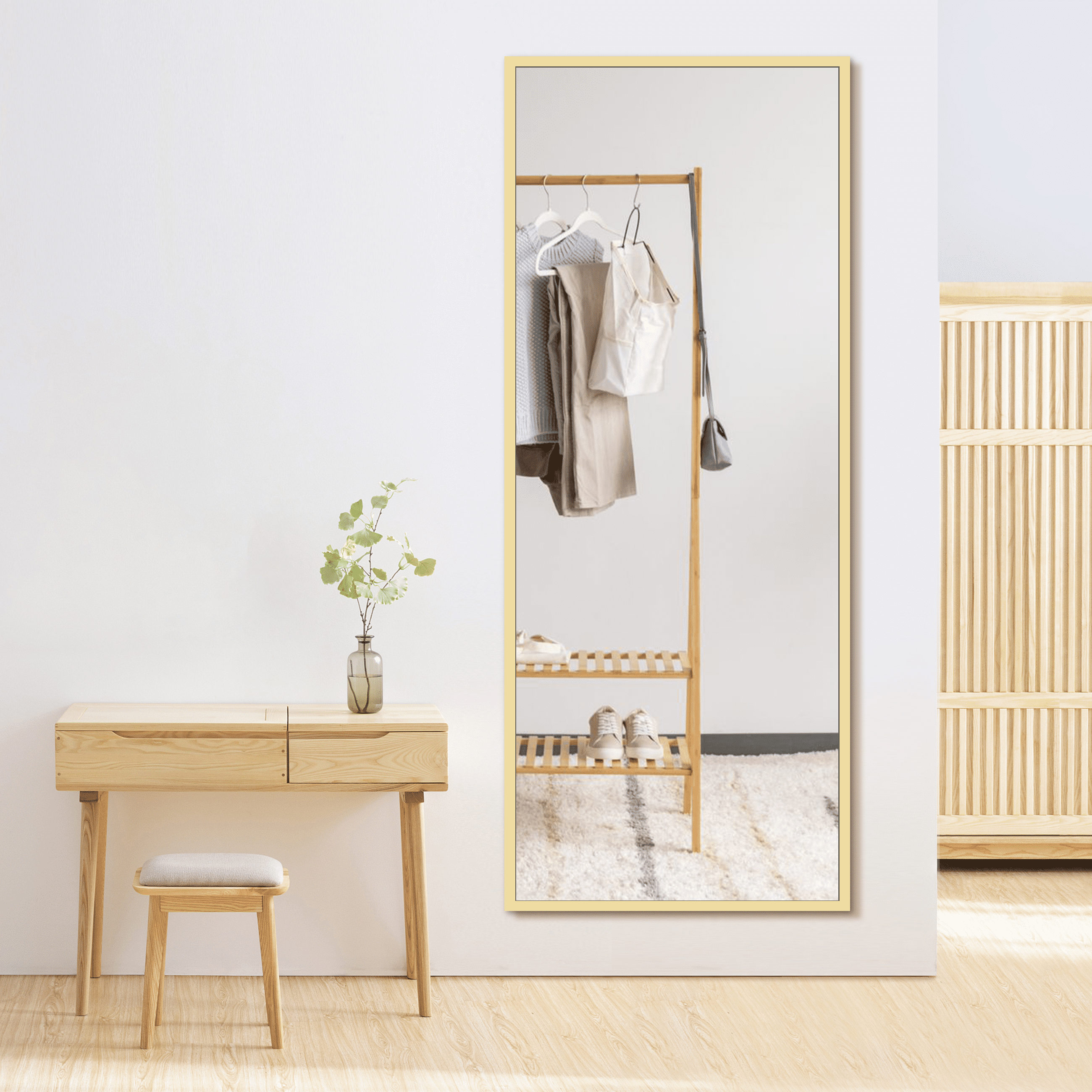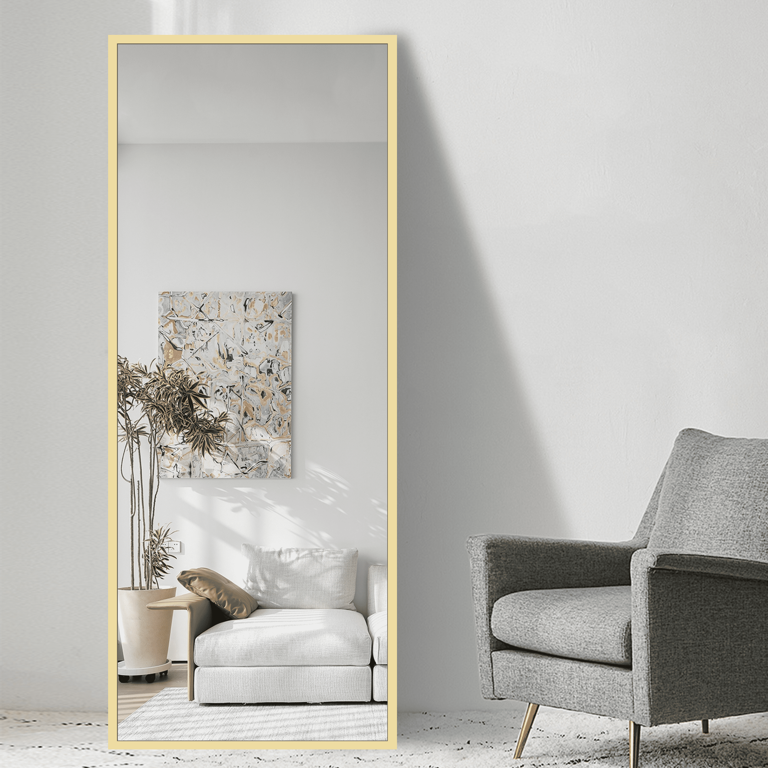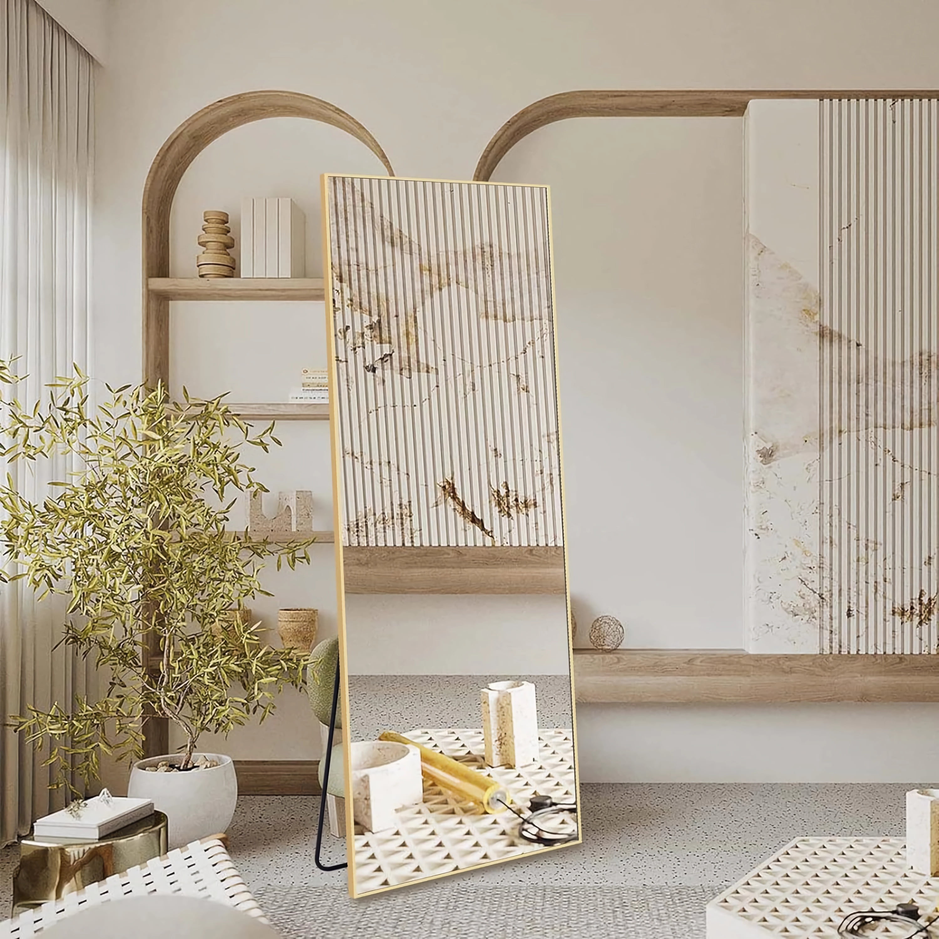 Retangular Decor Mirror: 64 x 21 inch full length size mirror. Gold Right Angle Full-length Mirror with modern rectangle design makes the floor mirror elegant and classic. The full length standing mirror for walls is not only a dressing tool but also a home decoration. Metal Framed and HD Image: Our full body mirror is made of aluminum alloy frame, which is durable and has a shiny appearance and 4 mm high definition nano glass. A shatter-proof and explosion-proof film is added to the back of the glass, which reduces sputtering damage caused by breakage, perfectly ensures the safety of you and your family.