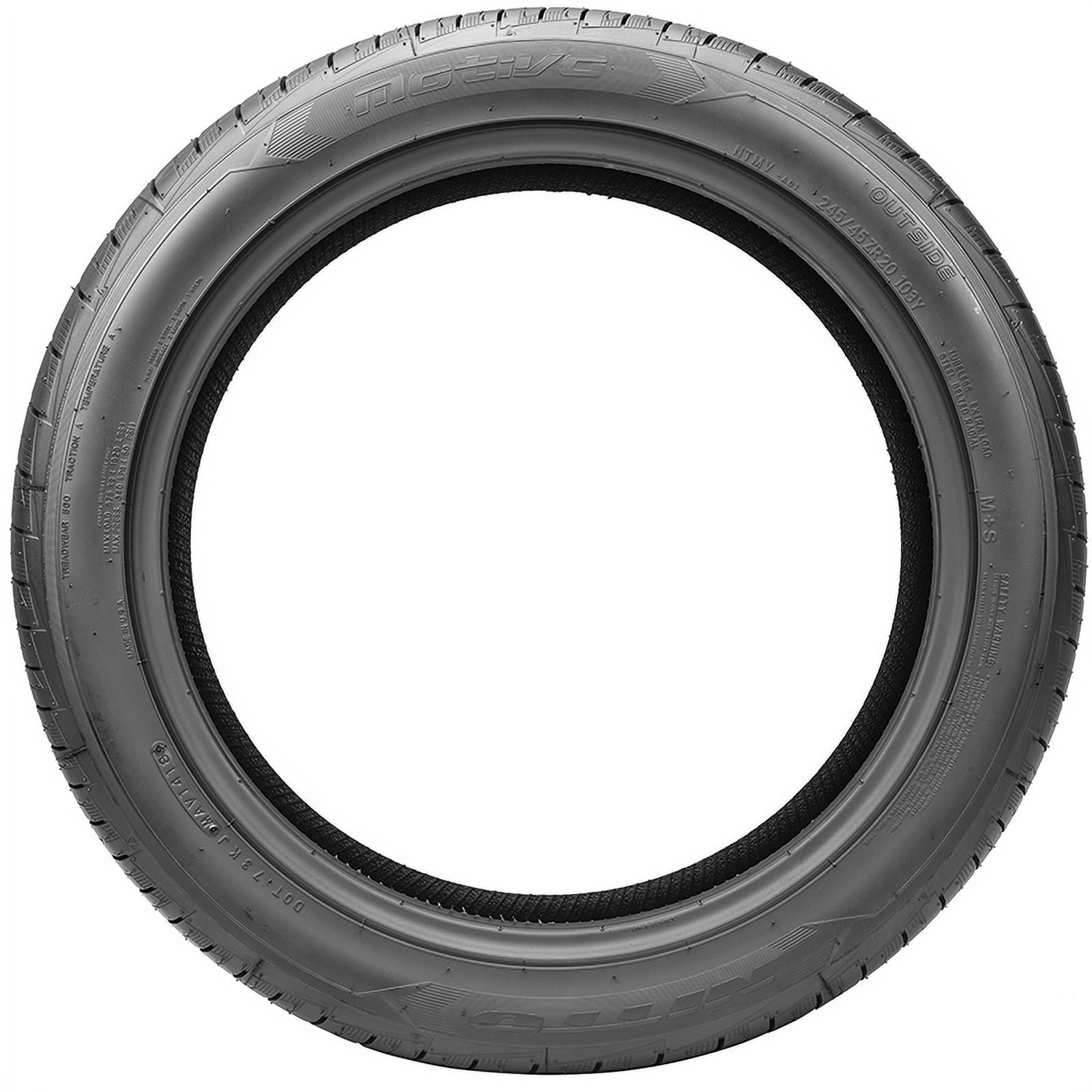 Nitto Motivo 245/45ZR20 103Y XL OVERVIEW The Nitto Motivo is an all-season ultra-high-performance tire that’s made for performance-oriented sedans and coupes. While its advanced siping technology helps generate superior traction in wet conditions, the Motivo’s large blocks on the outer part of the tread are responsible for grip on dry surfaces. Backed by a 60,000 mile limited manufacturer tread life for W- and Y-speed rated sizes, the Motivo features alignment indicators within the tread that visually show how the tire is wearing. Additionally, the Motivo utilizes 3D Multi-wave sipes that interlock to boost acceleration and braking performance when driving at higher speeds.
