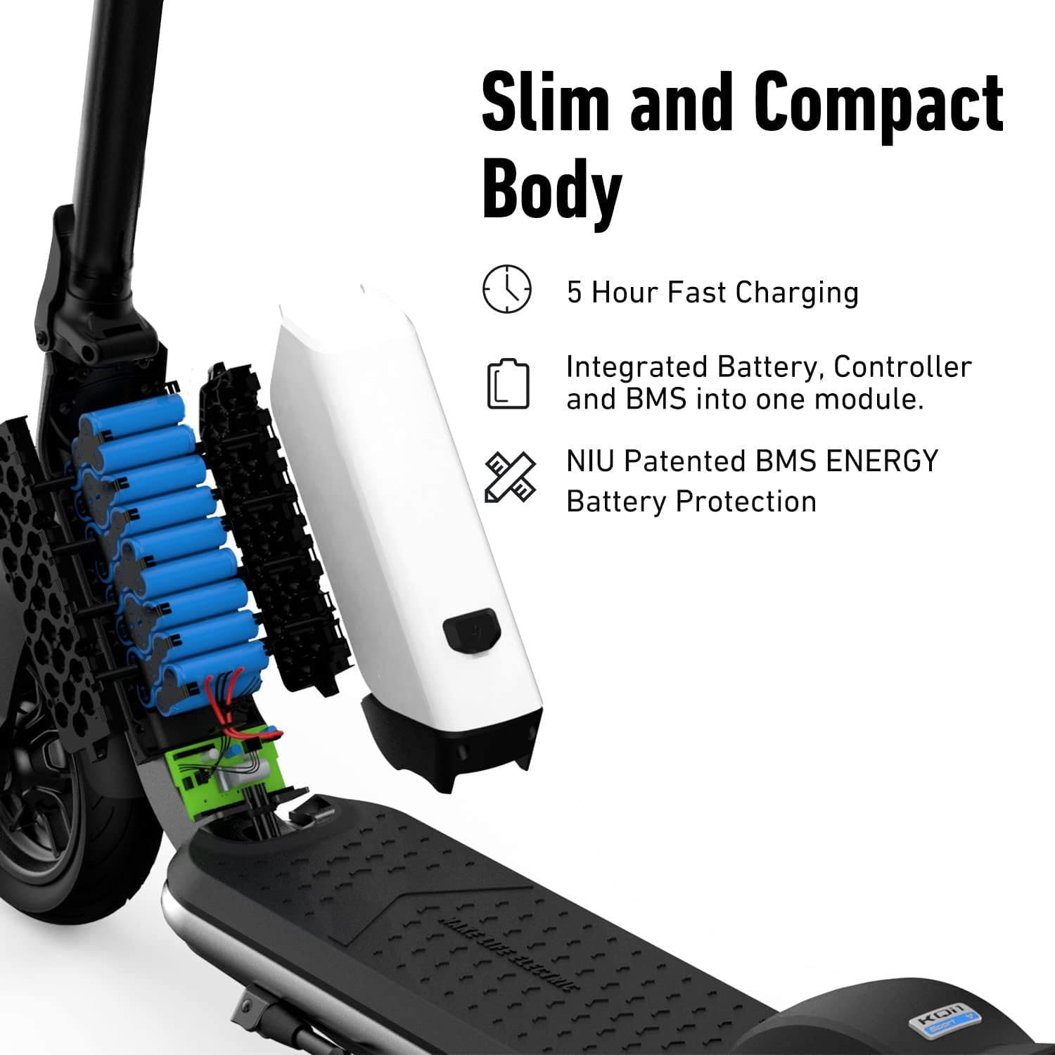 Quick and Easy Folding: Our patented folding mechanism is quick, easy and safer than the competition! Lightweight and Fun: At just 34 pounds, the KQi1 Pro is easy to handle and fun to ride. 30% Larger Battery Capacity: The 243Wh KQi1 Pro battery has 30% more capacity than competitor models, allowing an improved range of up to 15.5 miles per charge so you never have to worry about the distance.