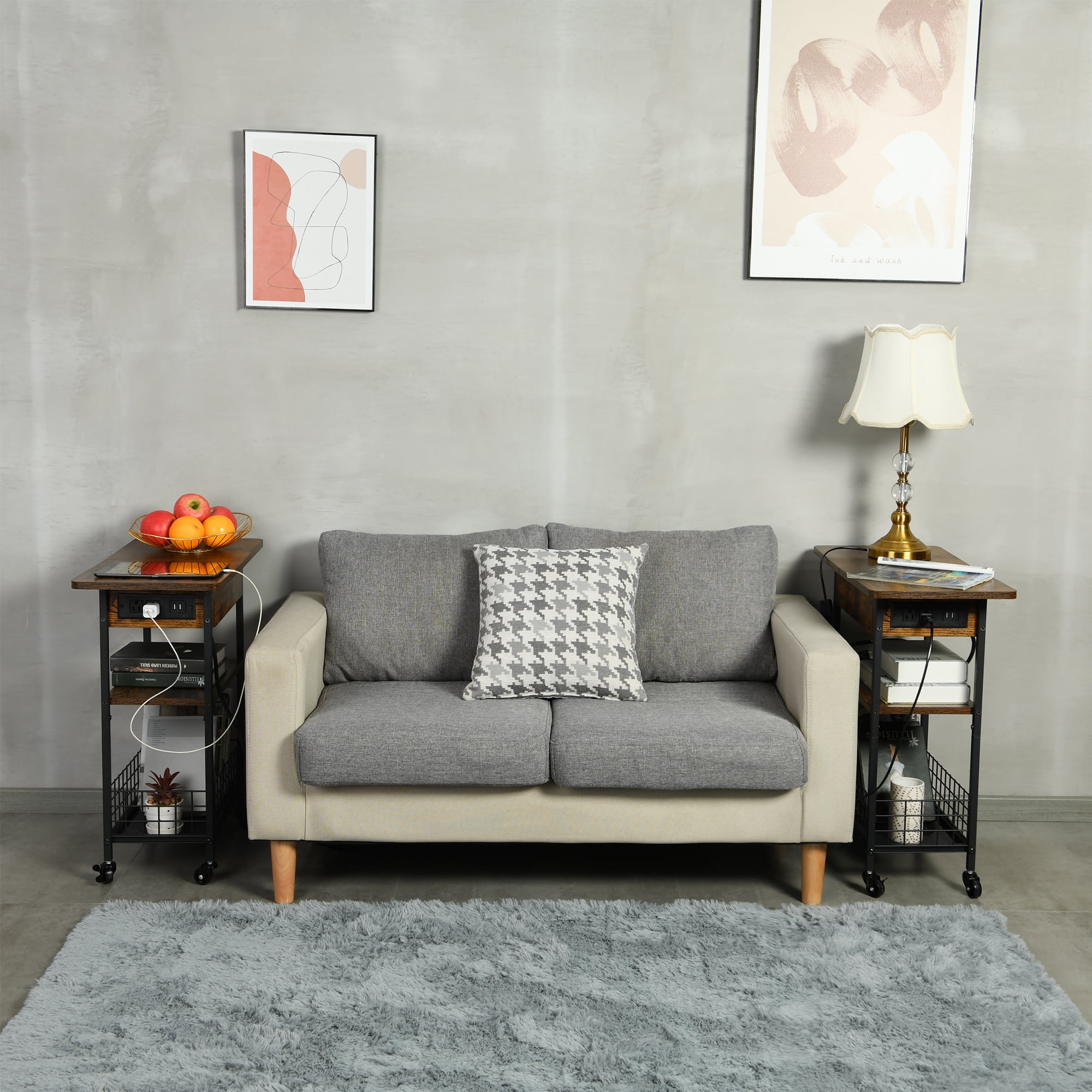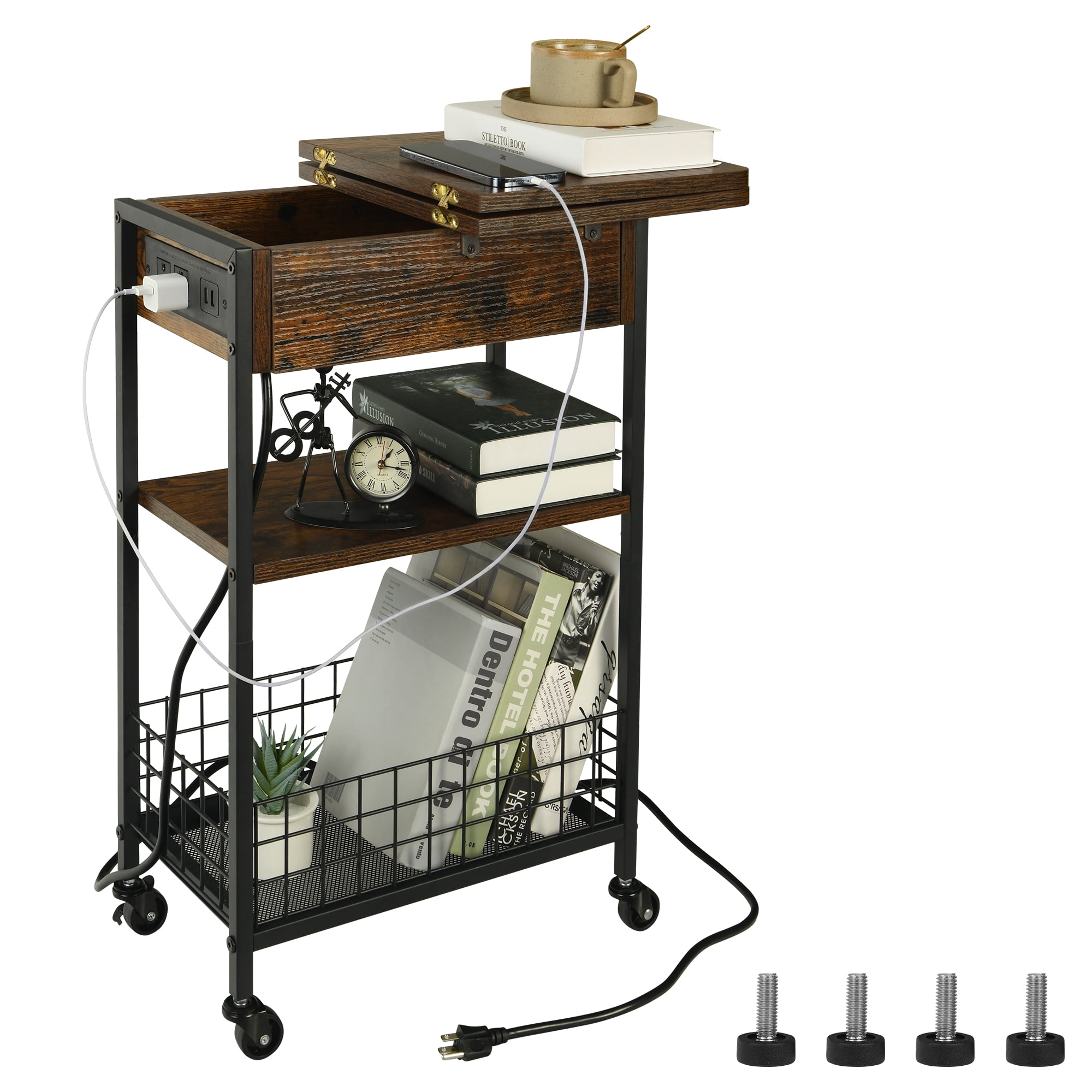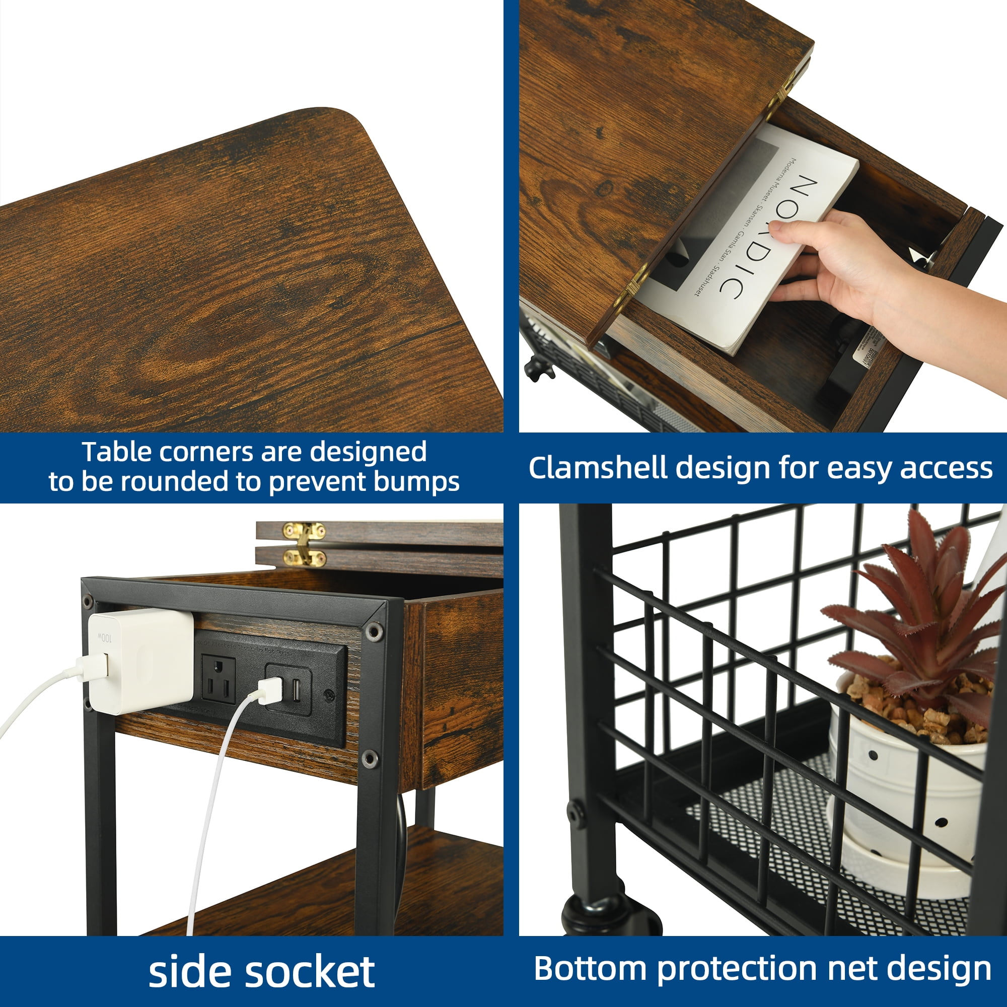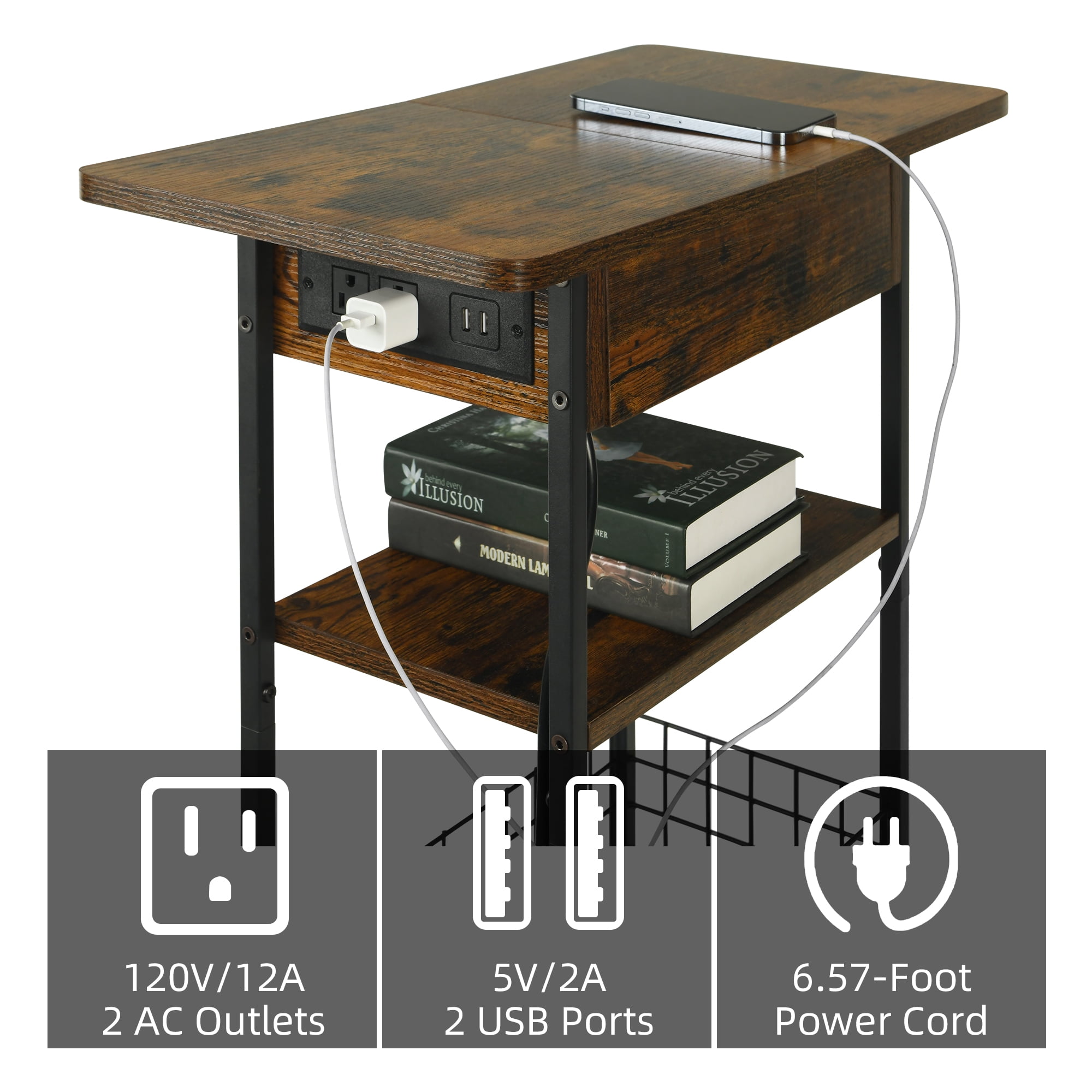 Noahas Flip Top Side Table for Living Room with USB Ports End Table, Rustic Brown “Set of 2” Upgraded version with a charging station designed on the left vertical side for enhanced safety, minimizing the risk of electric shock from spills Equipped with 2 USB ports and 2 3-prong power outlets, keeping power accessible within arm’s reach. The 6.5 ft electrical cord allows flexibility in placement away from wall outlets Versatile end table featuring a drawer and 2 shelves for ample storage. The flip top drawer provides concealed storage, while the vintage wooden shelf is perfect for displaying decorative items Sturdy construction with dimensions of 23.6’’ L x 11.8’’ W x 26’’ H. Made from textured particle board and a steel frame, it supports a weight capacity of up to 22 lb User safety is prioritized with rounded corners on the tabletop and the charging station positioned away from potential spills