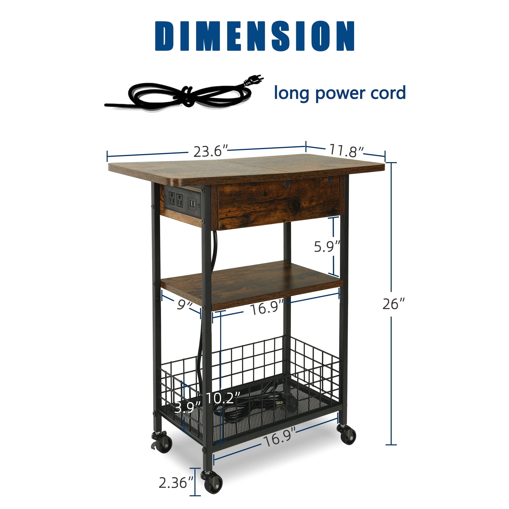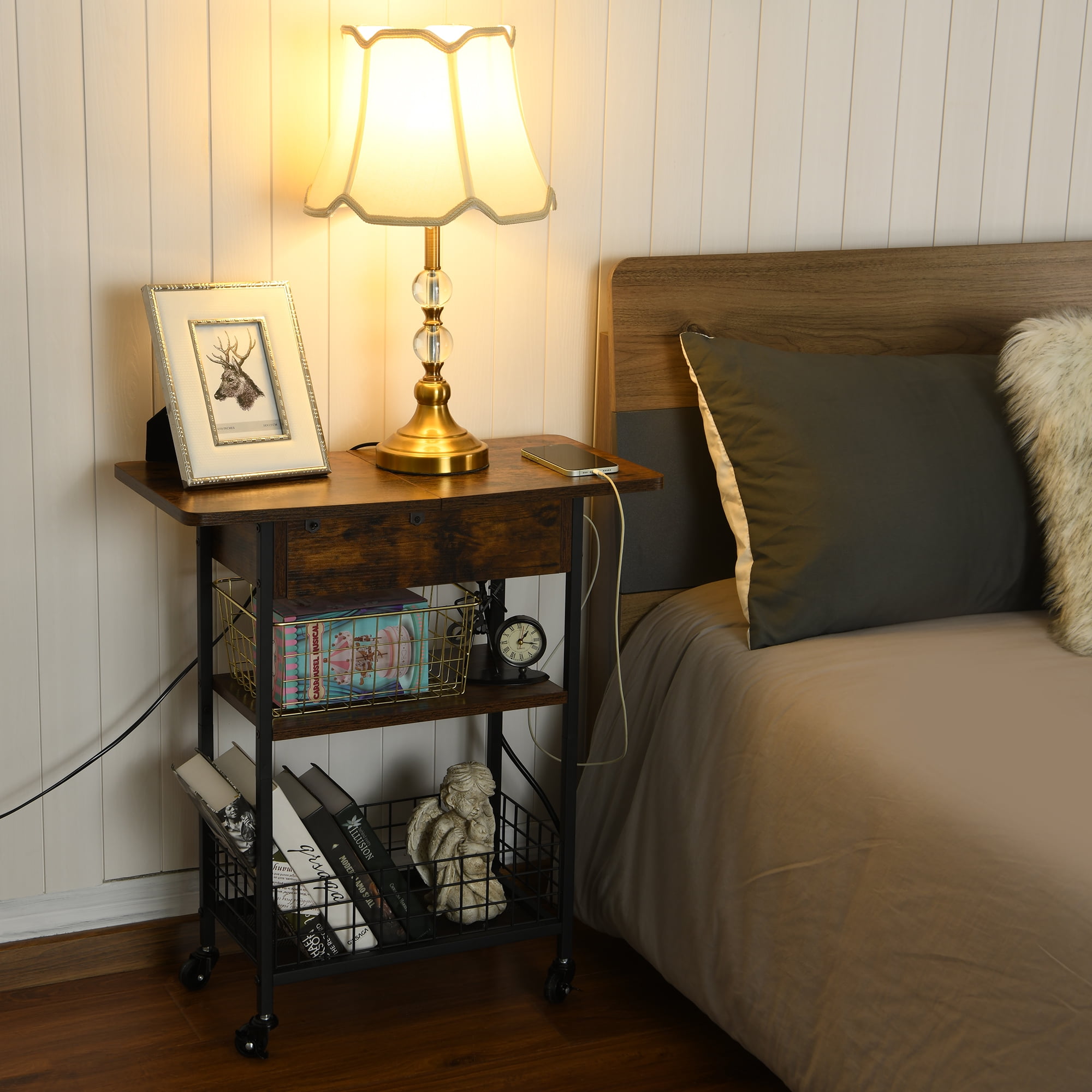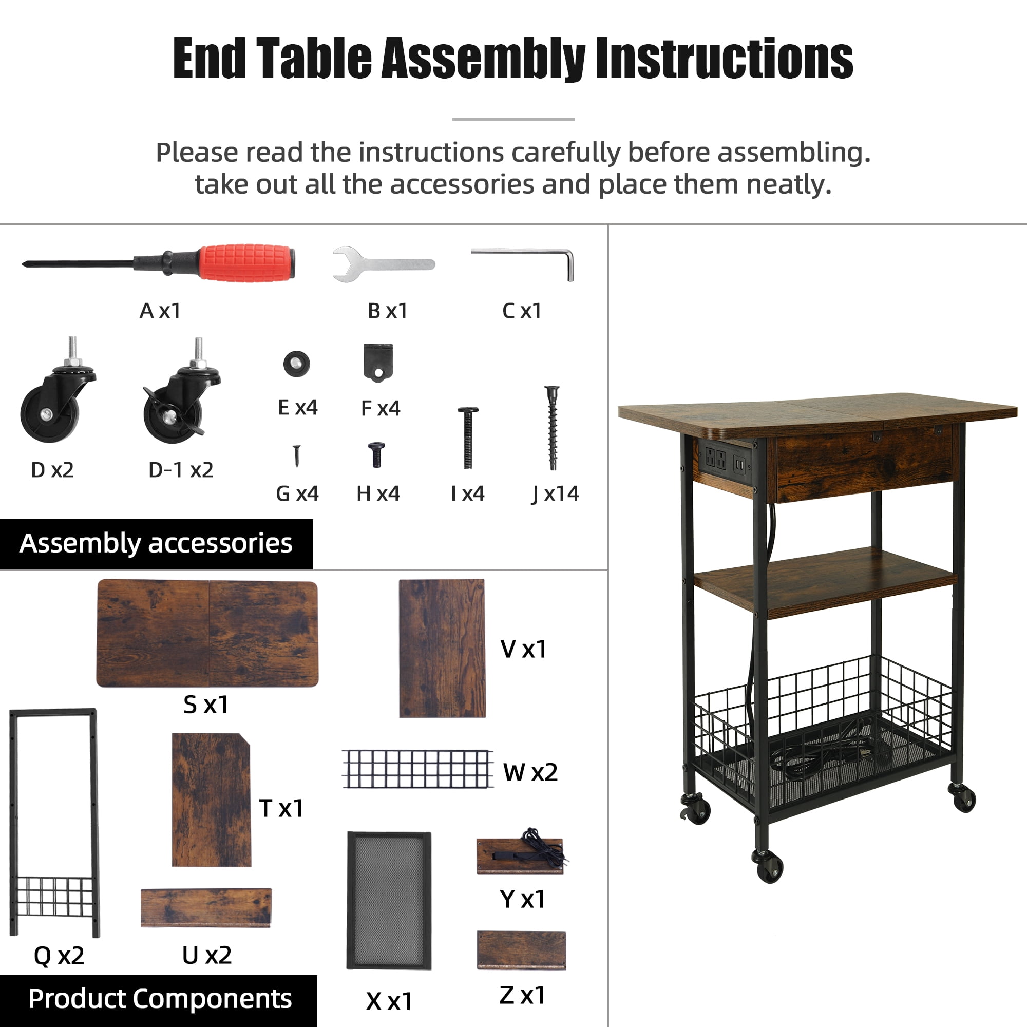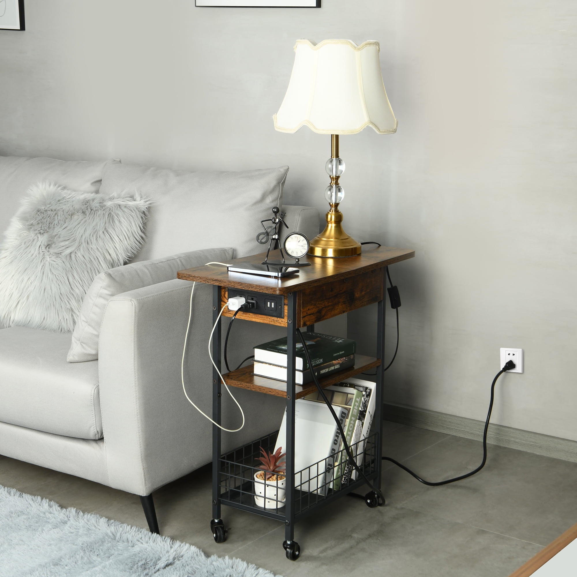 Noahas Flip Top Side Table for Living Room with USB Ports End Table, Rustic Brown “Set of 2” Upgraded version with a charging station designed on the left vertical side for enhanced safety, minimizing the risk of electric shock from spills Equipped with 2 USB ports and 2 3-prong power outlets, keeping power accessible within arm’s reach. The 6.5 ft electrical cord allows flexibility in placement away from wall outlets Versatile end table featuring a drawer and 2 shelves for ample storage. The flip top drawer provides concealed storage, while the vintage wooden shelf is perfect for displaying decorative items Sturdy construction with dimensions of 23.6’’ L x 11.8’’ W x 26’’ H. Made from textured particle board and a steel frame, it supports a weight capacity of up to 22 lb User safety is prioritized with rounded corners on the tabletop and the charging station positioned away from potential spills
