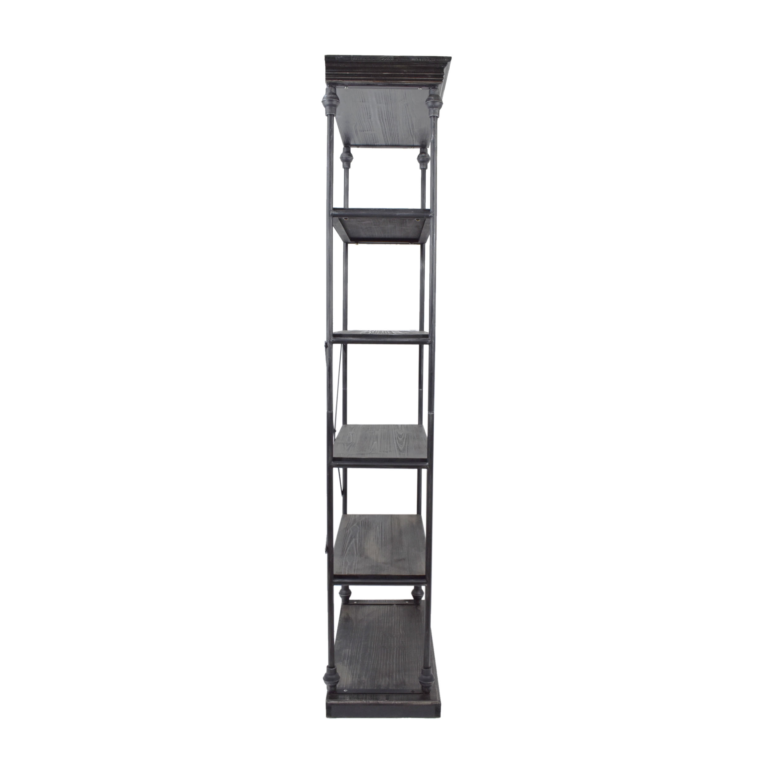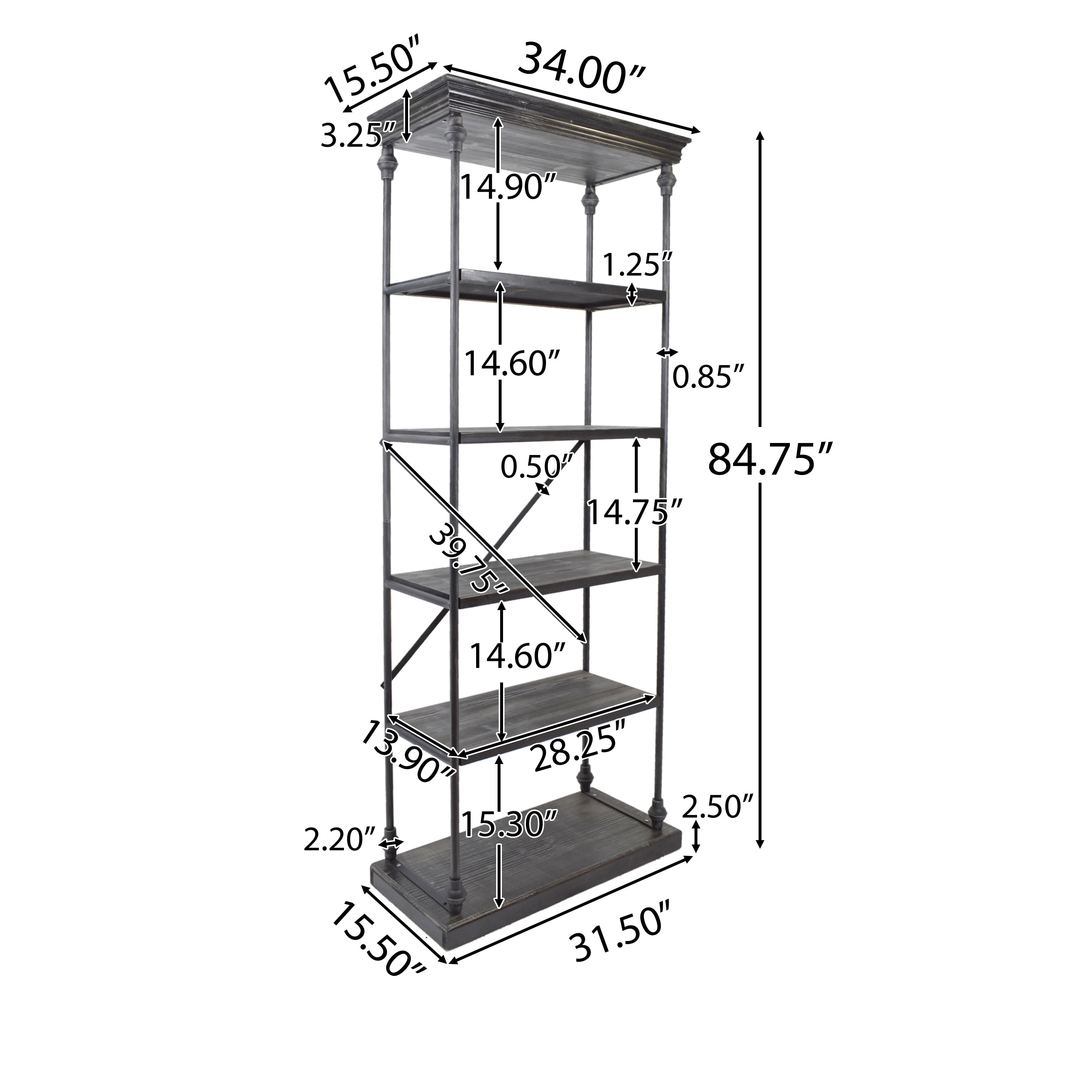 Includes: One (1) Shelf Shelf Material: Firwood Frame Material: Iron Multiple Color Options Assembly Required Dimensions: 15.50 inches deep x 34.00 inches wide x 84.75 inches high