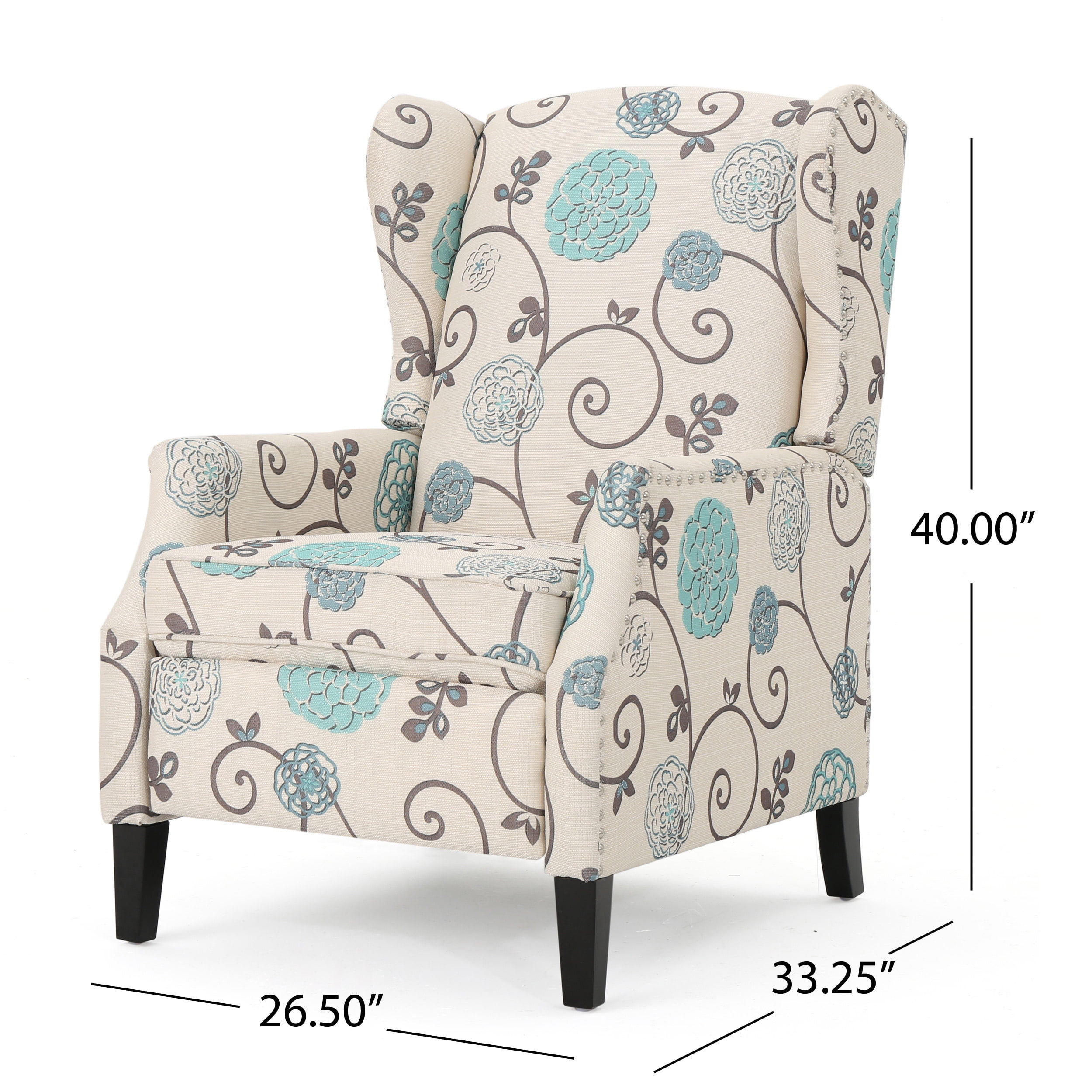Noble House Allan Contemporary Fabric Wingback Pushback Recliner, Light Beige, Blue Floral Includes: One (1) Recliner Material: Fabric Fabric Composition: 100% Polyester Leg Material: Birch Wood Multiple Color Options Leg Finish: Dark Brown Hand-Crafted Details Assembly Required Dimensions: 33.25 inches deep x 26.50 inches wide x 40.00 inches high Extended Dimensions: 61.00 inches deep x 26.50 inches wide x 30.00 inches high Seat Dimensions: 21.25 inches deep x 21.00 inches wide x 19.00 inches high Arm Height: 23.25 inches